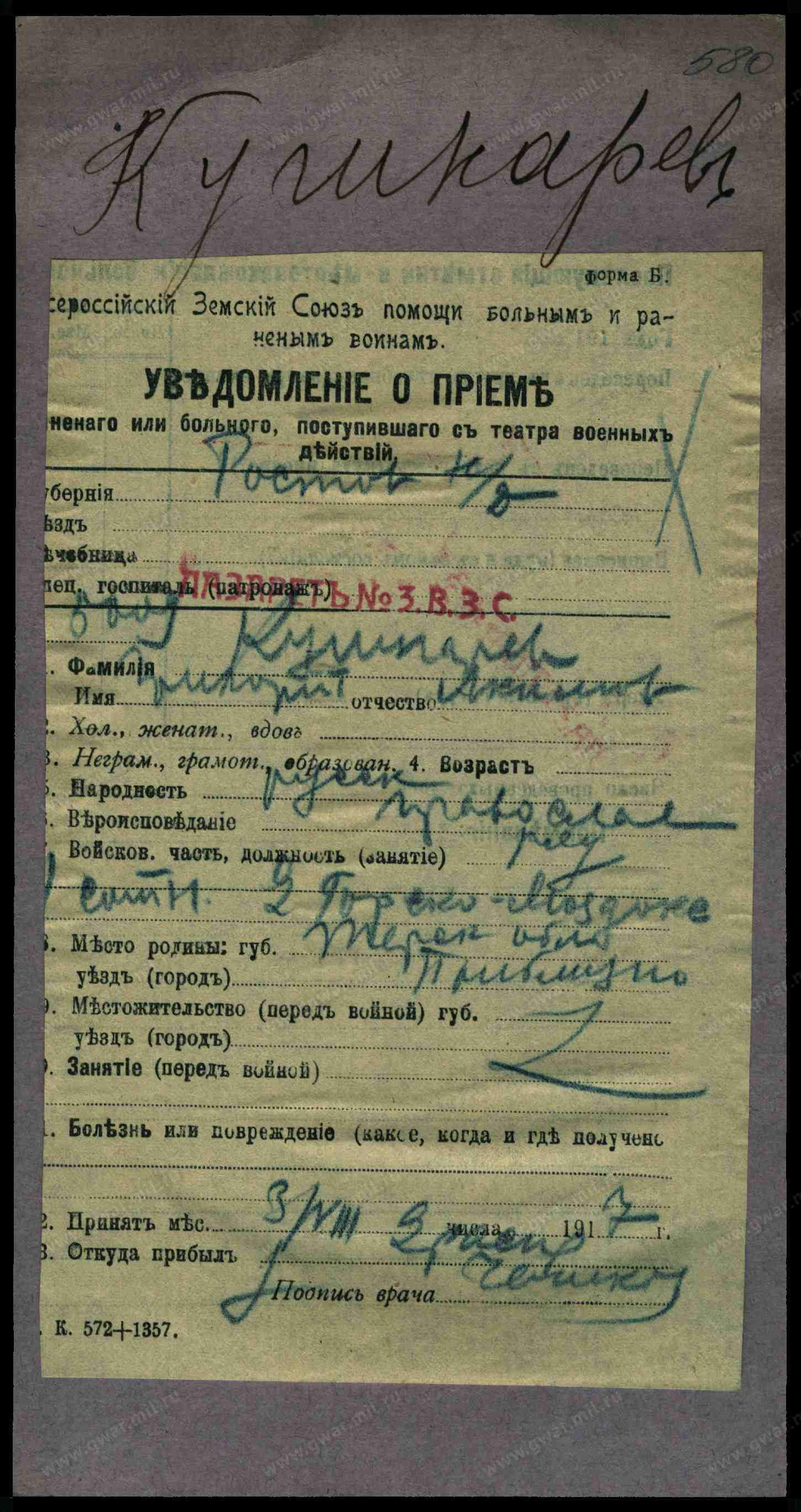 Тип документа Уведомление о приеме раненого