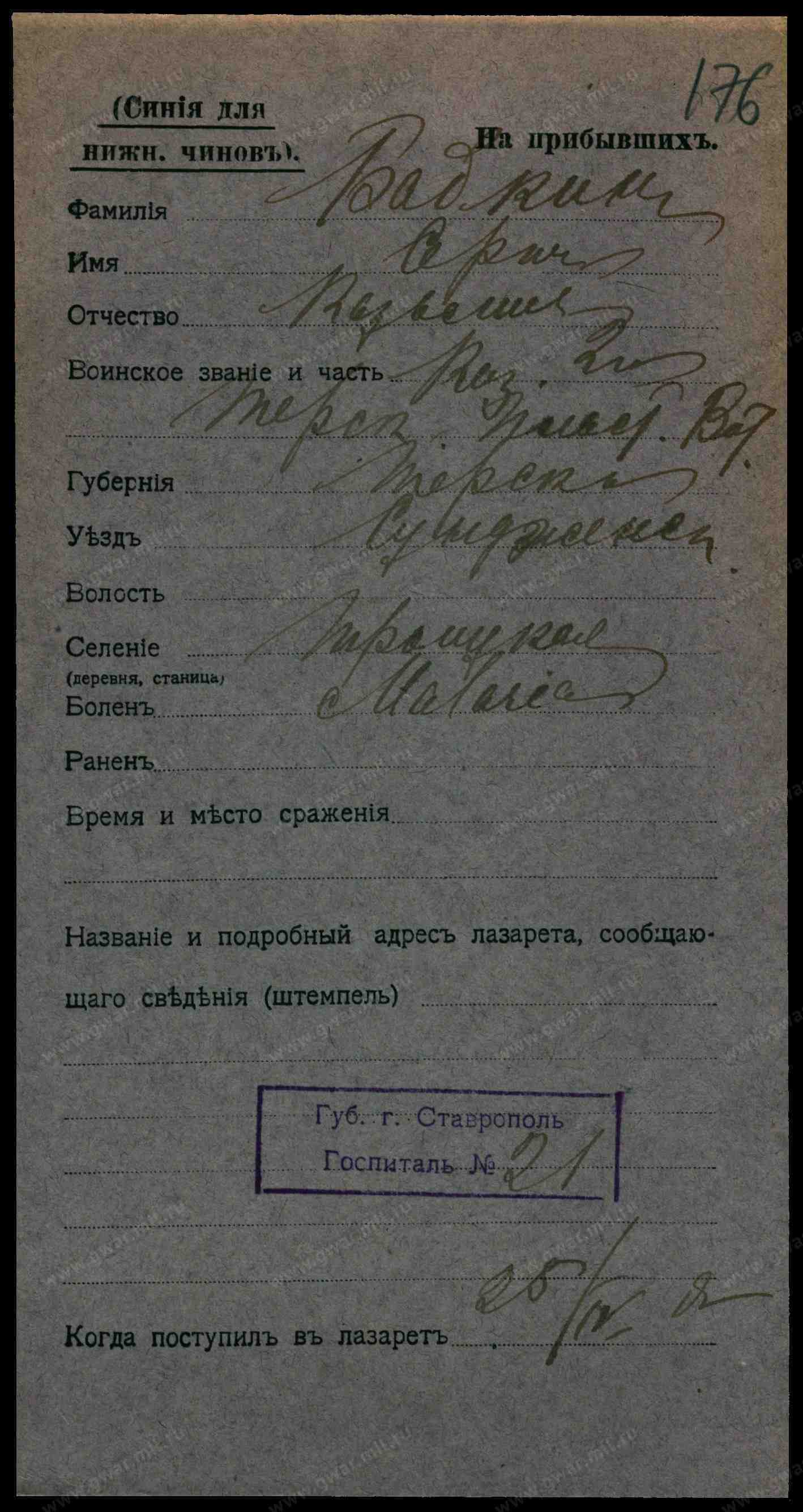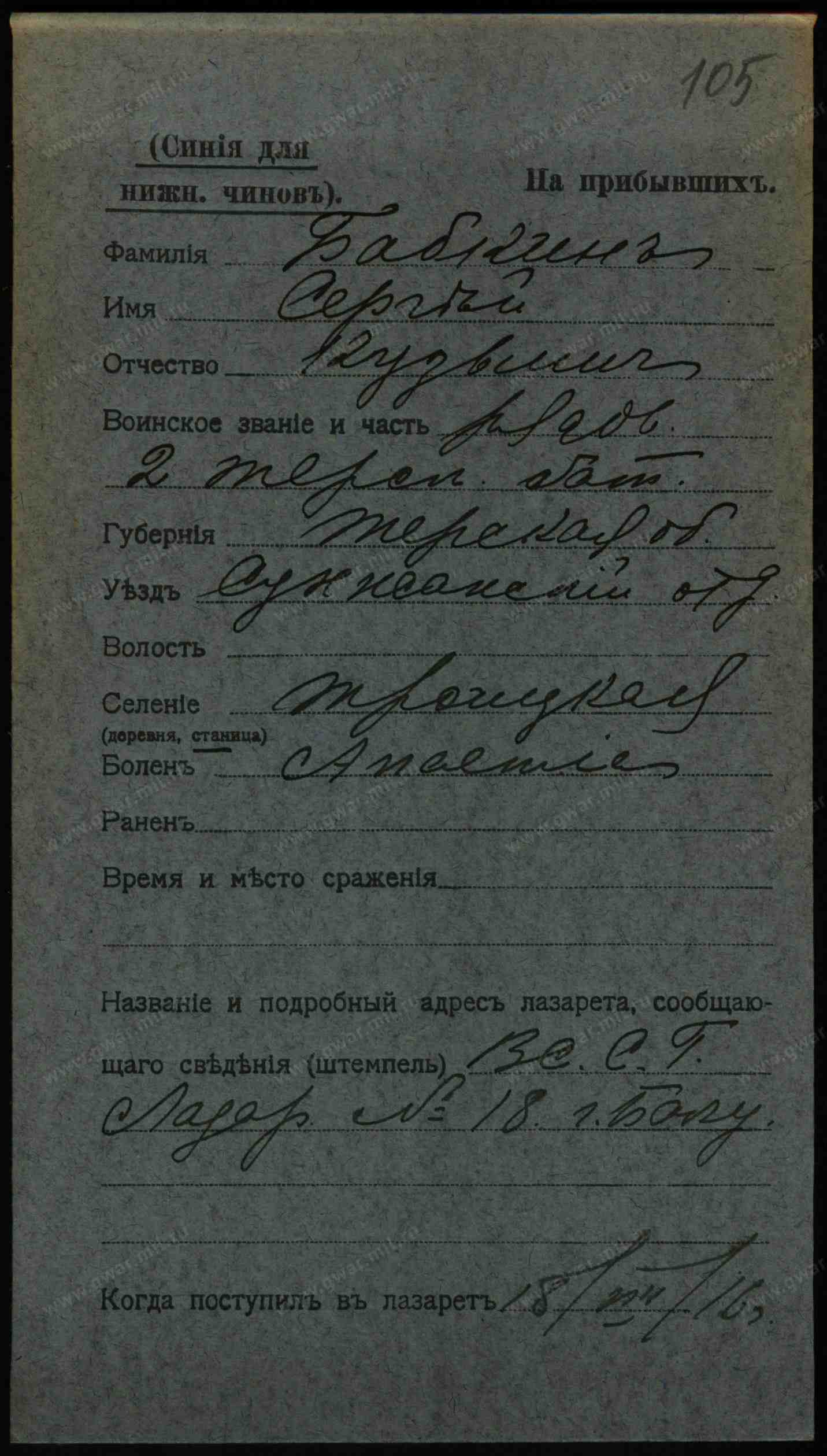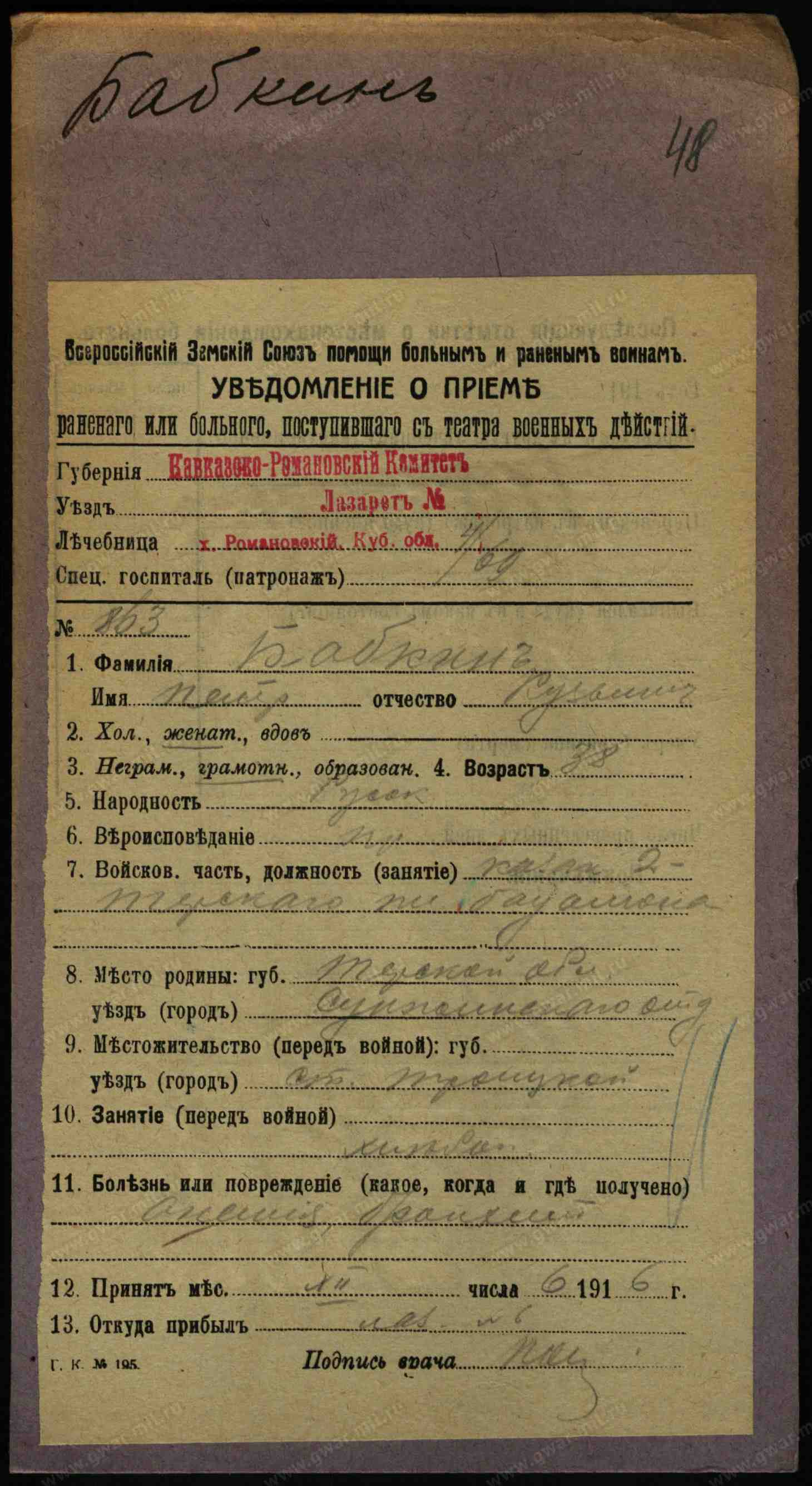 142793. БАБКИН, СТЕПАН МАКСИМОВ. Каз. ст. Троицкой, Сунжен. отд., 26 л.; — Тифлисск. С. П. 18 Сент. 909, 134, 135, 149 и 362 У., арест. отд. 1 г. Исп. 10 Нояб. 909. | 905 г. Владикавказ. О. С., т. 5 м. и 10 дней.