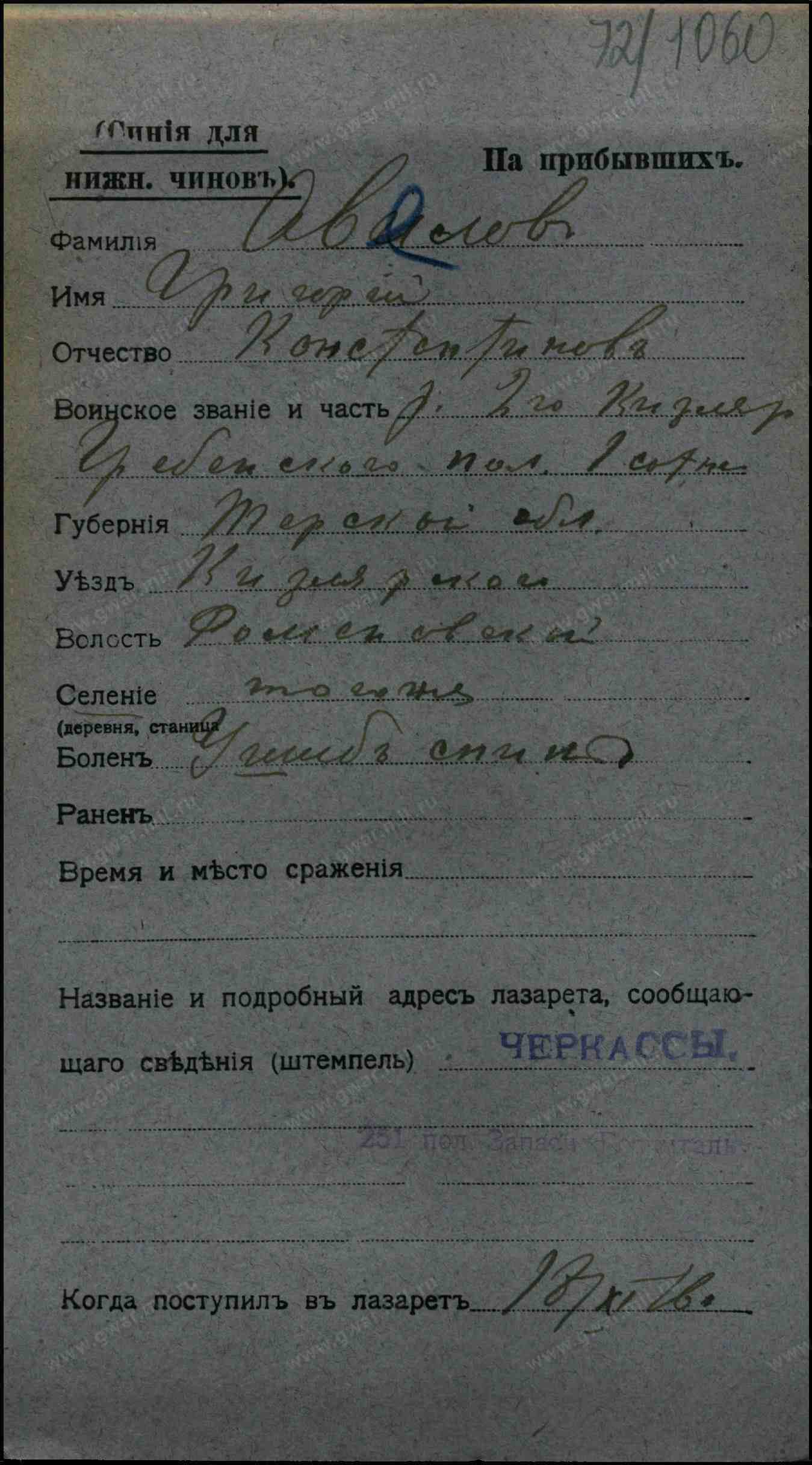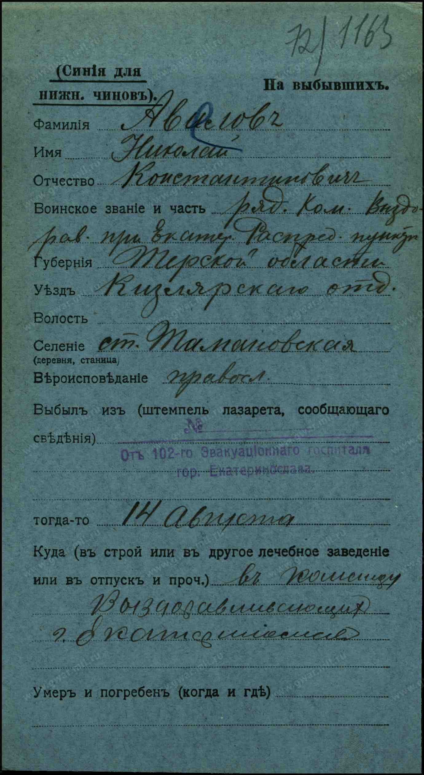 Место рождения Терская обл., Кизлярский округ (отдел), ст. Тамановская