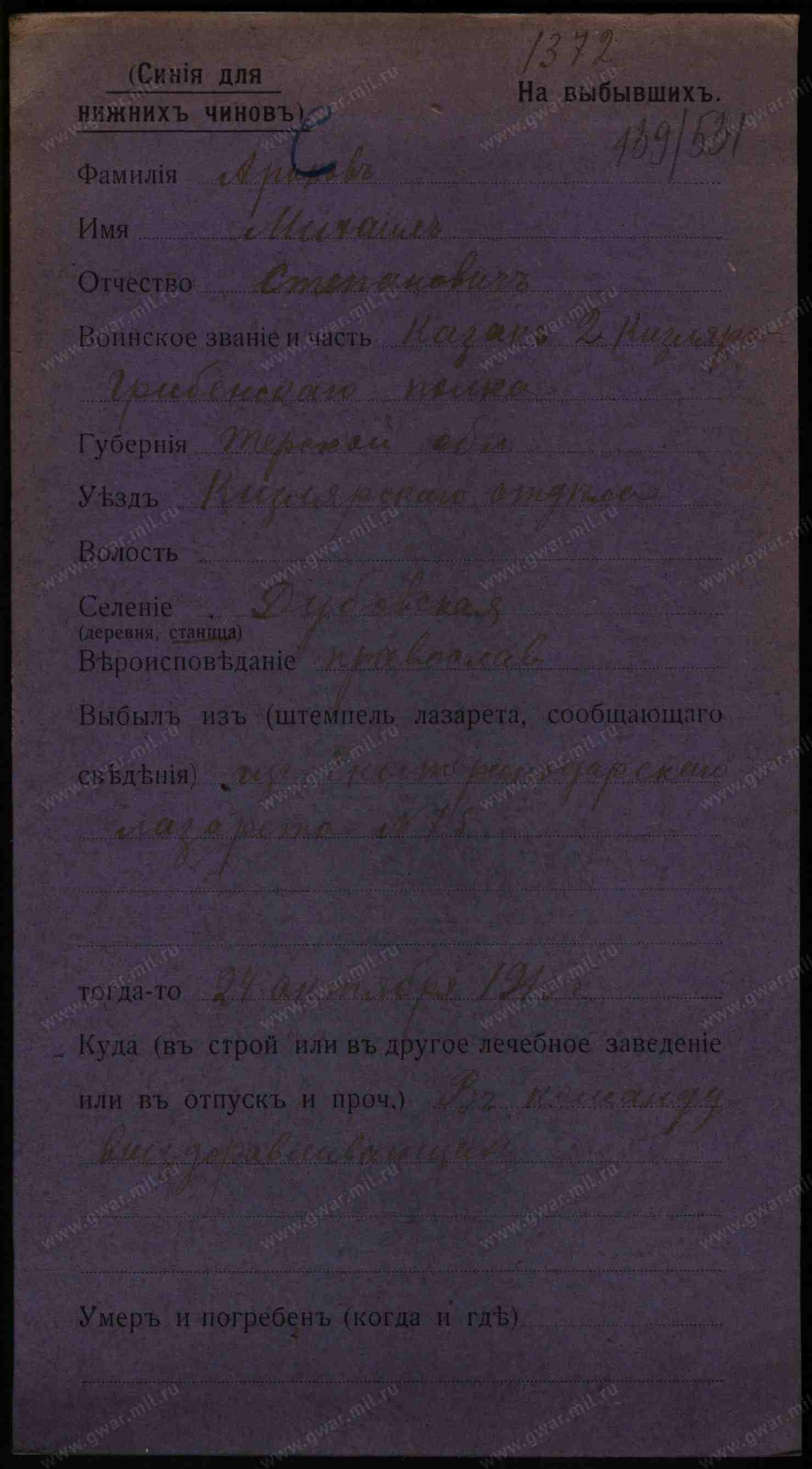 Место рождения Терская обл., Кизлярский округ (отдел), станица Дубовская