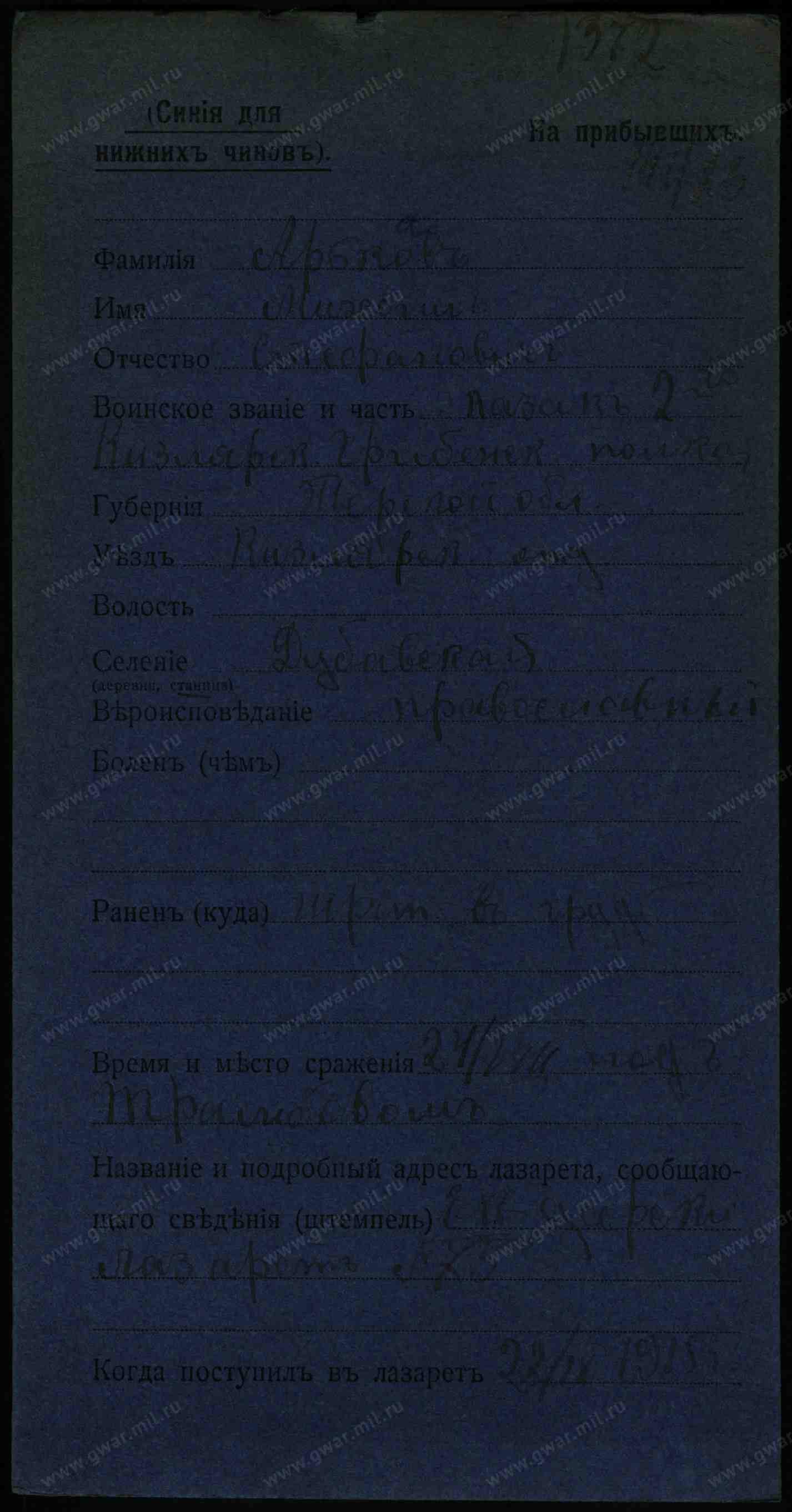 Место выбытия с. Хмелево; госпиталь м. Терембовля