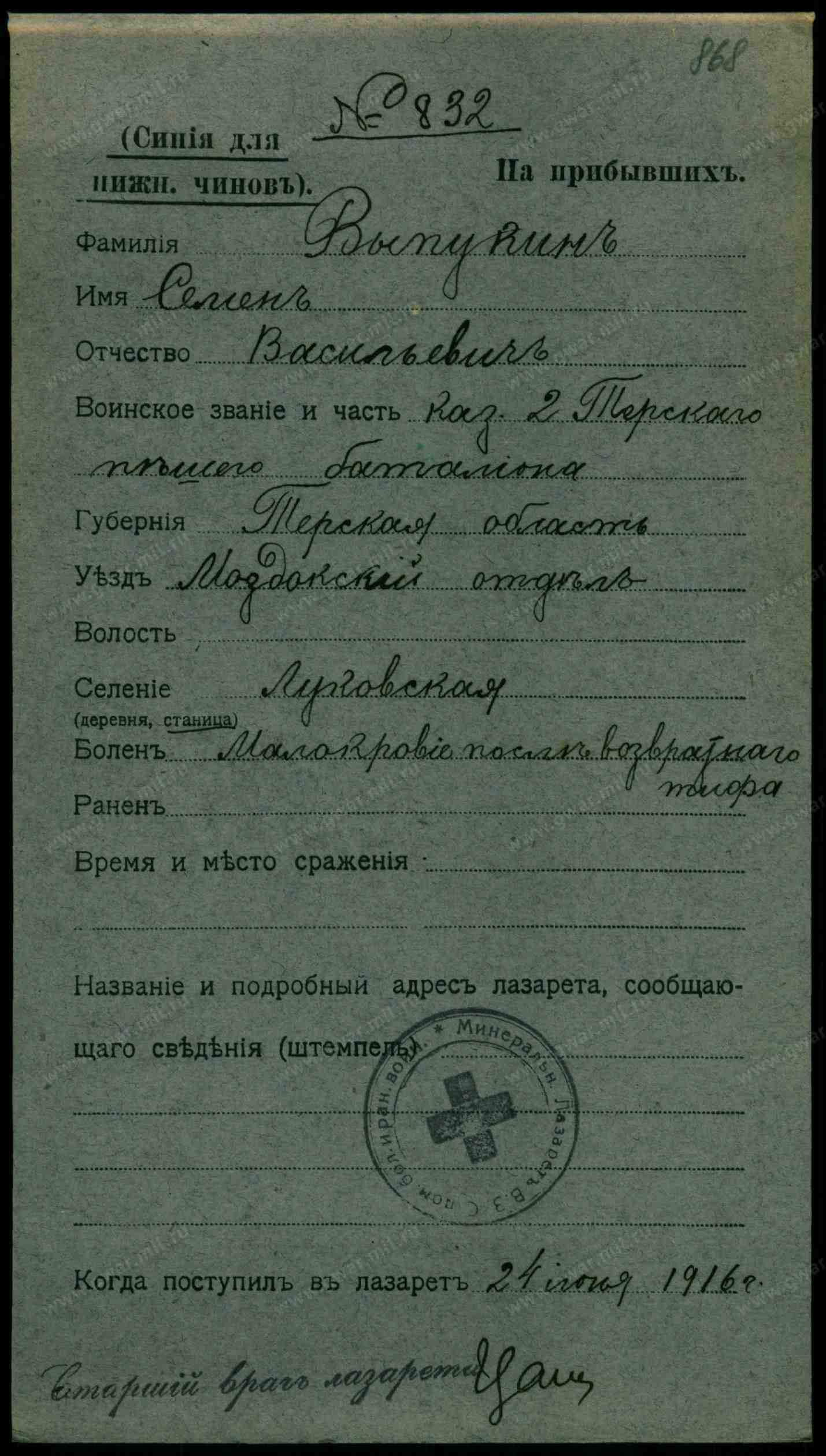 Место рождения Терская обл., Моздокский отдел