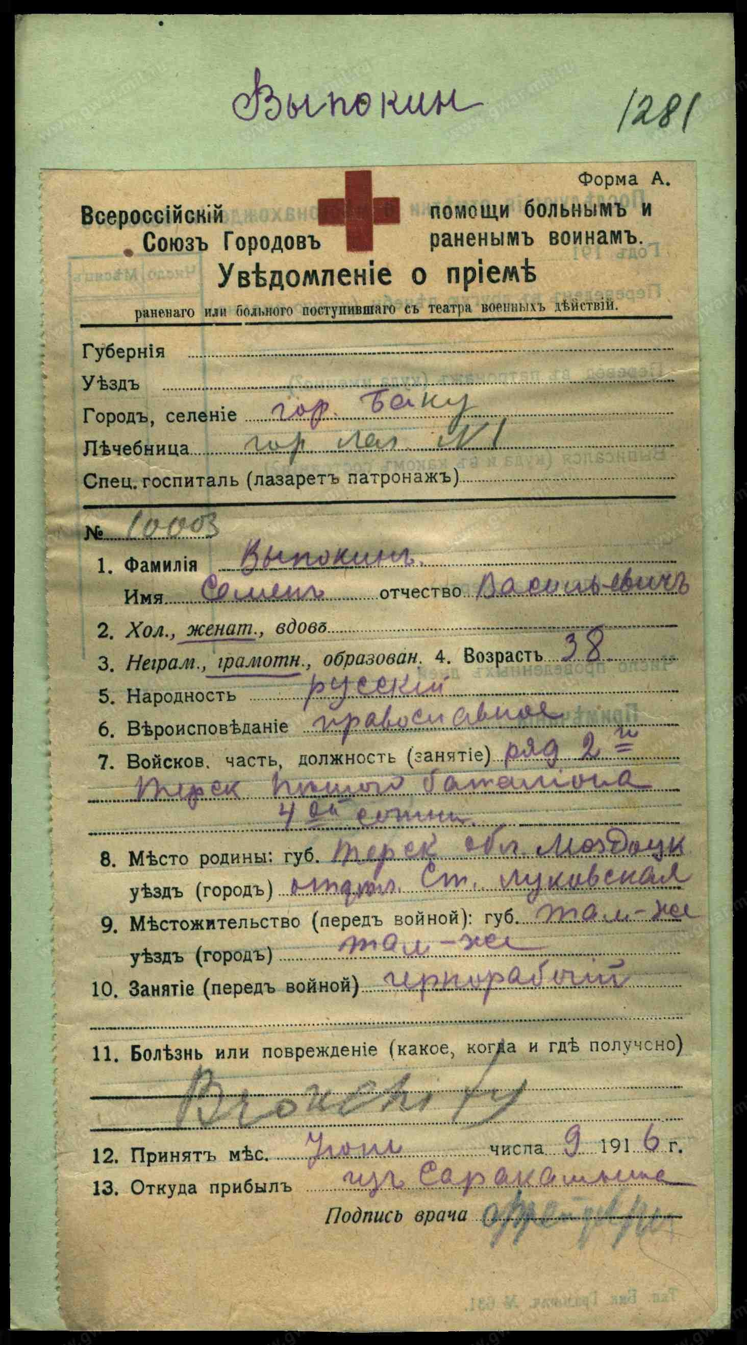 Тип документа Уведомление о приеме раненого