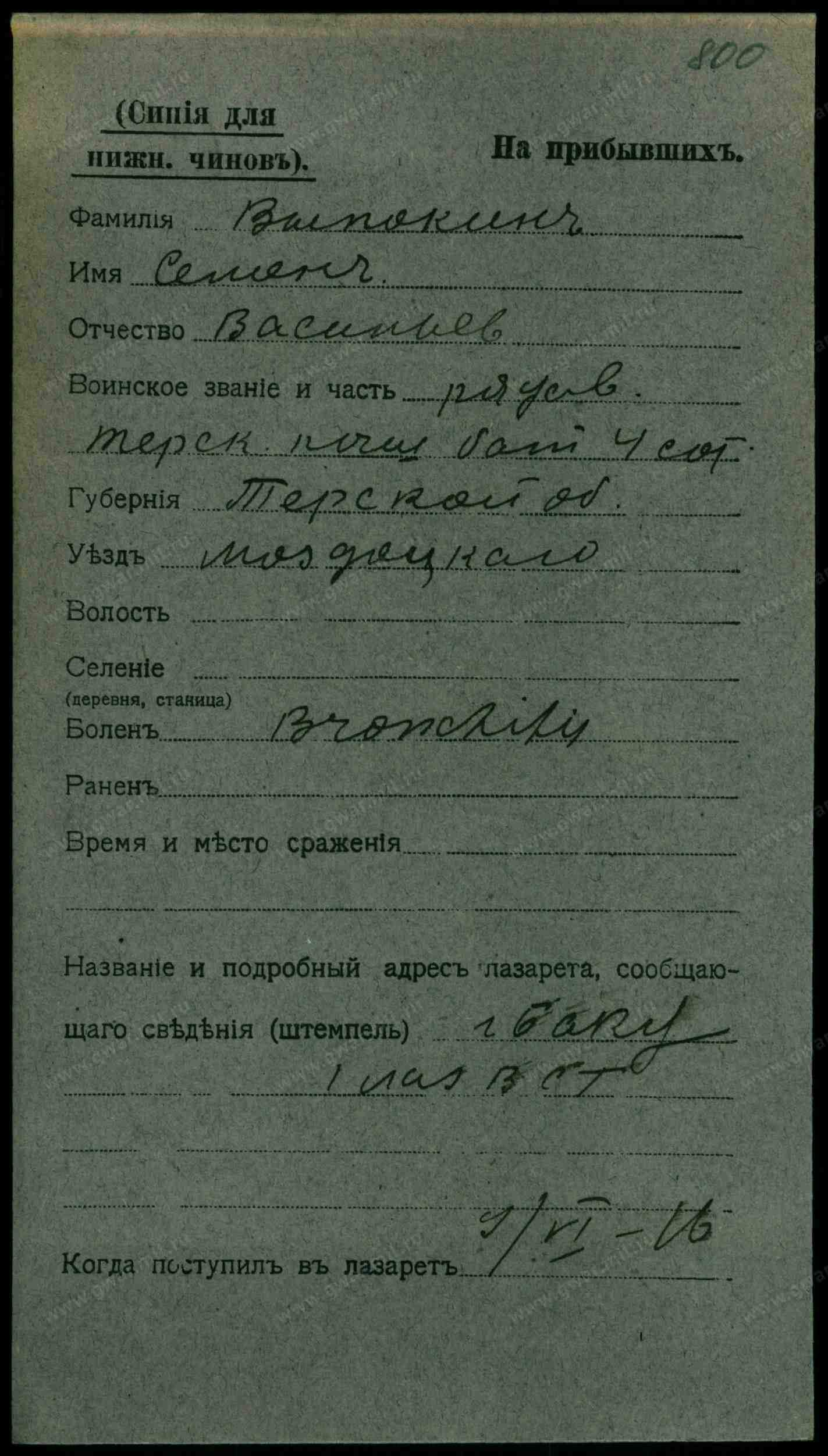 Тип документа Карточка на прибывших (высшие чины)