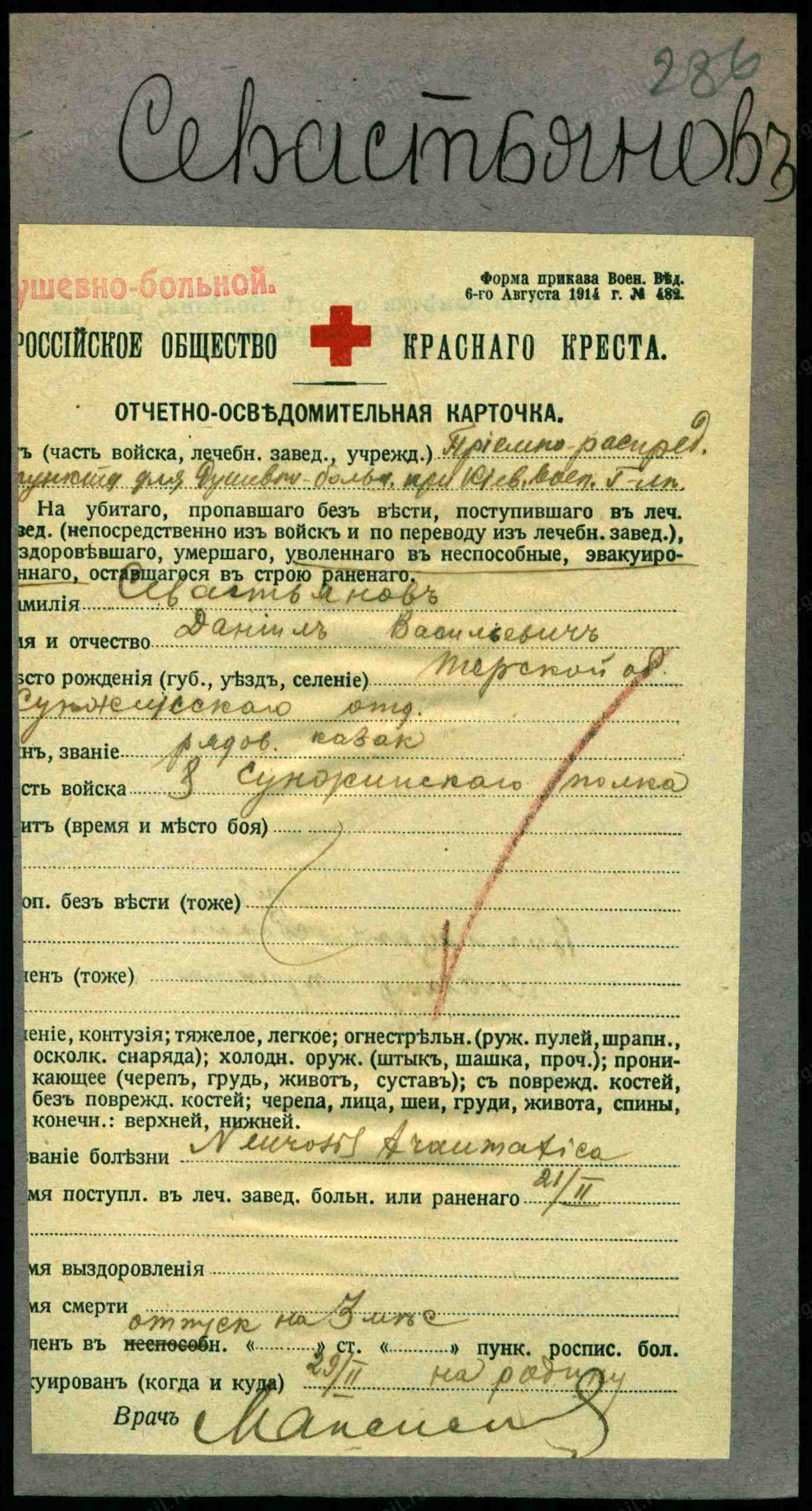 Поручители по невесте: Терской области, станицы Тарской казак Иоанн Антониев Антонов и уволенный в запас фельдшер Владимир Георгиев Павлов.