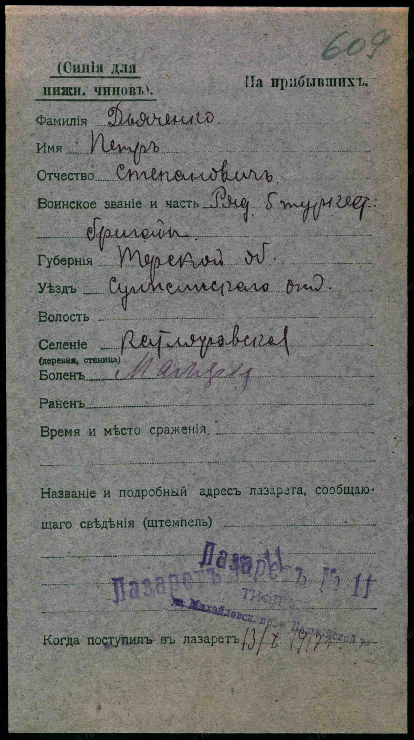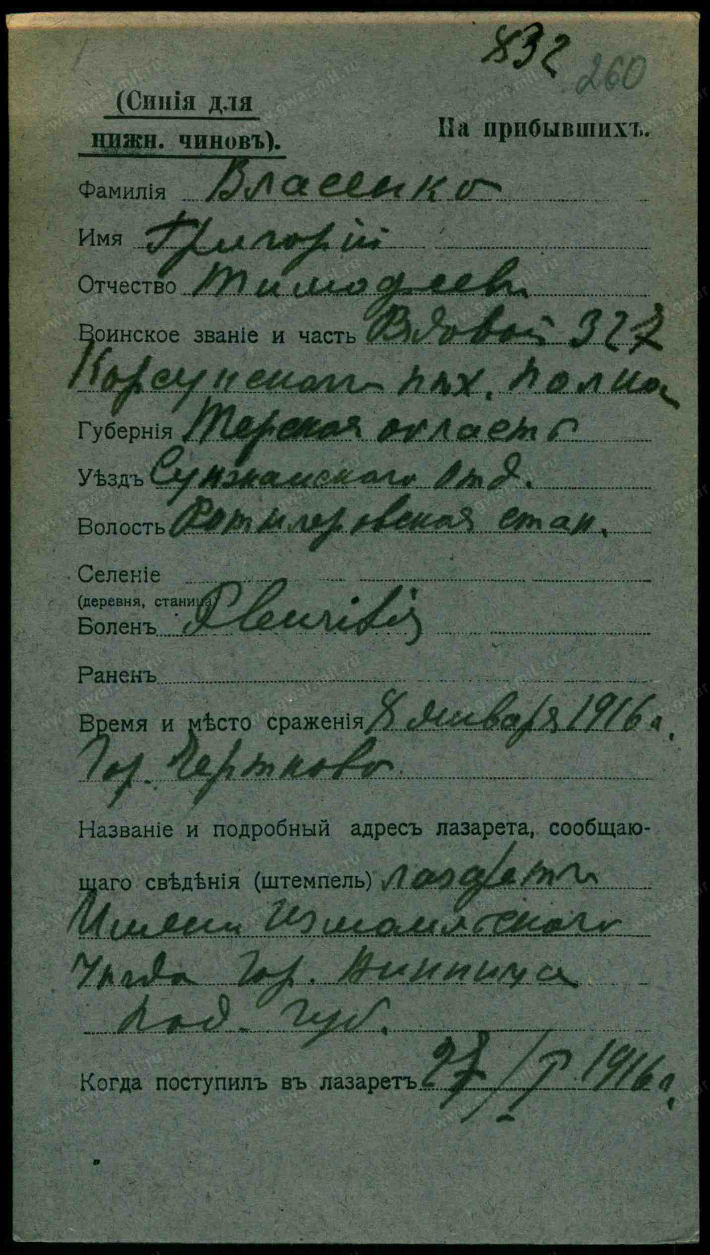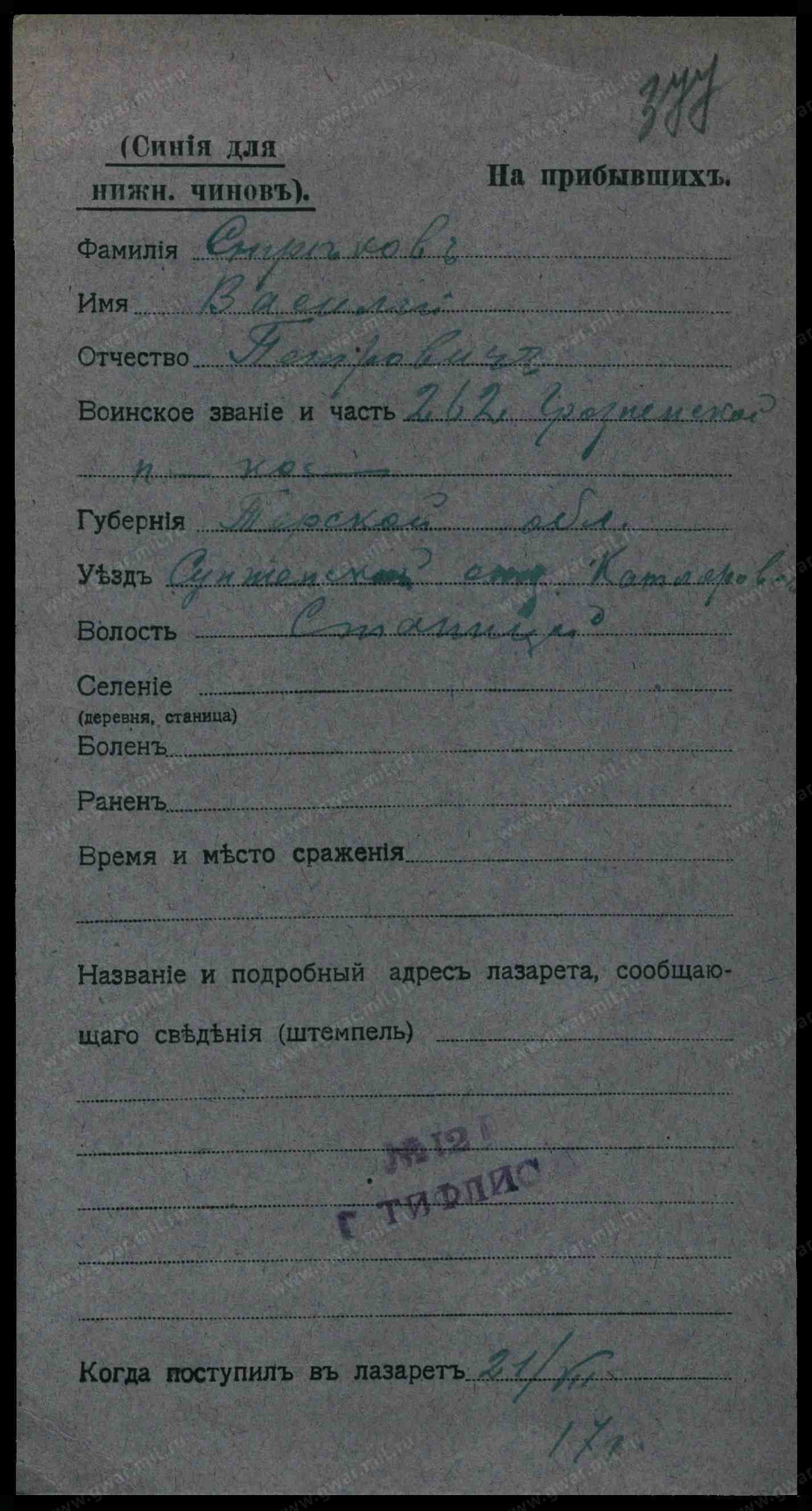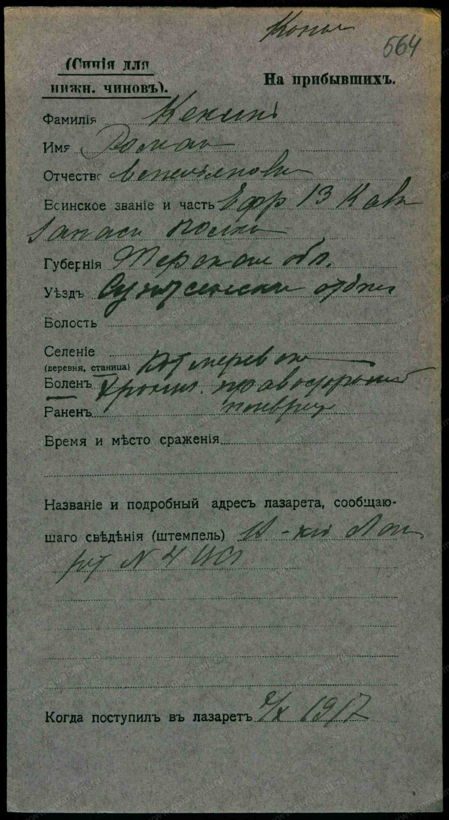 Тип документа: Карточка на прибывших (нижние чины).