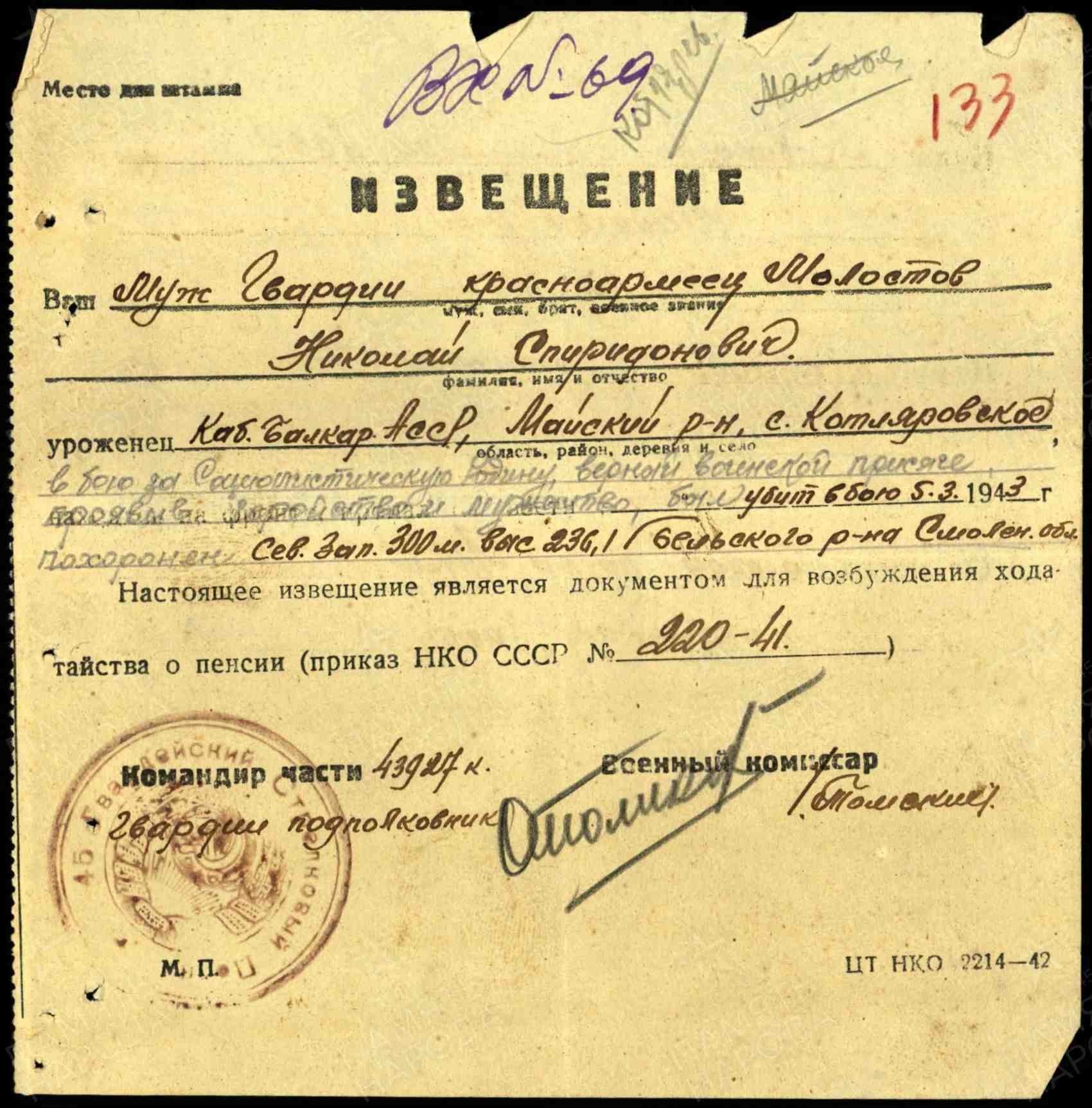 Наименование военкомата: Майский РВК, Кабардино-Балкарская АССР, Майский р-н