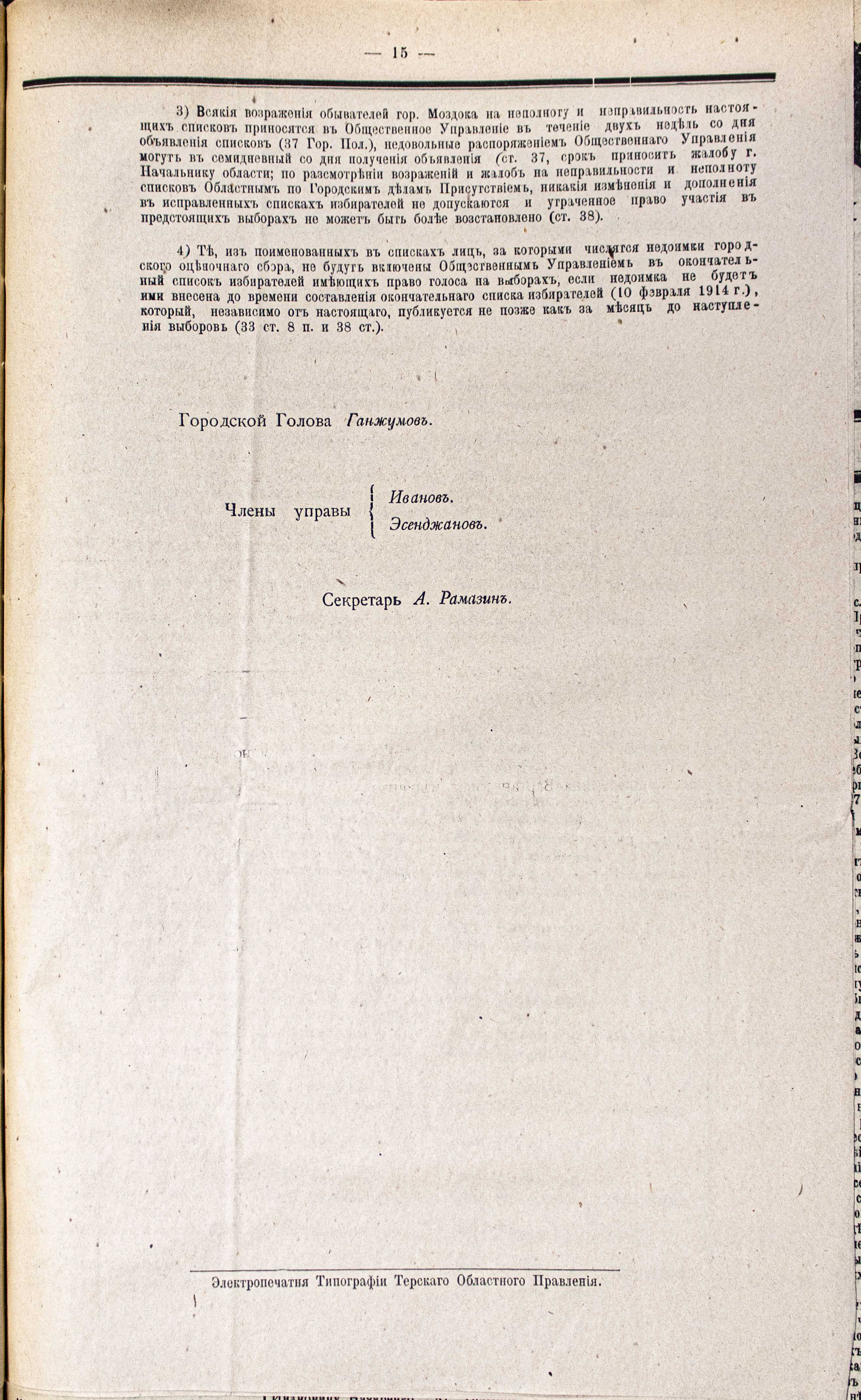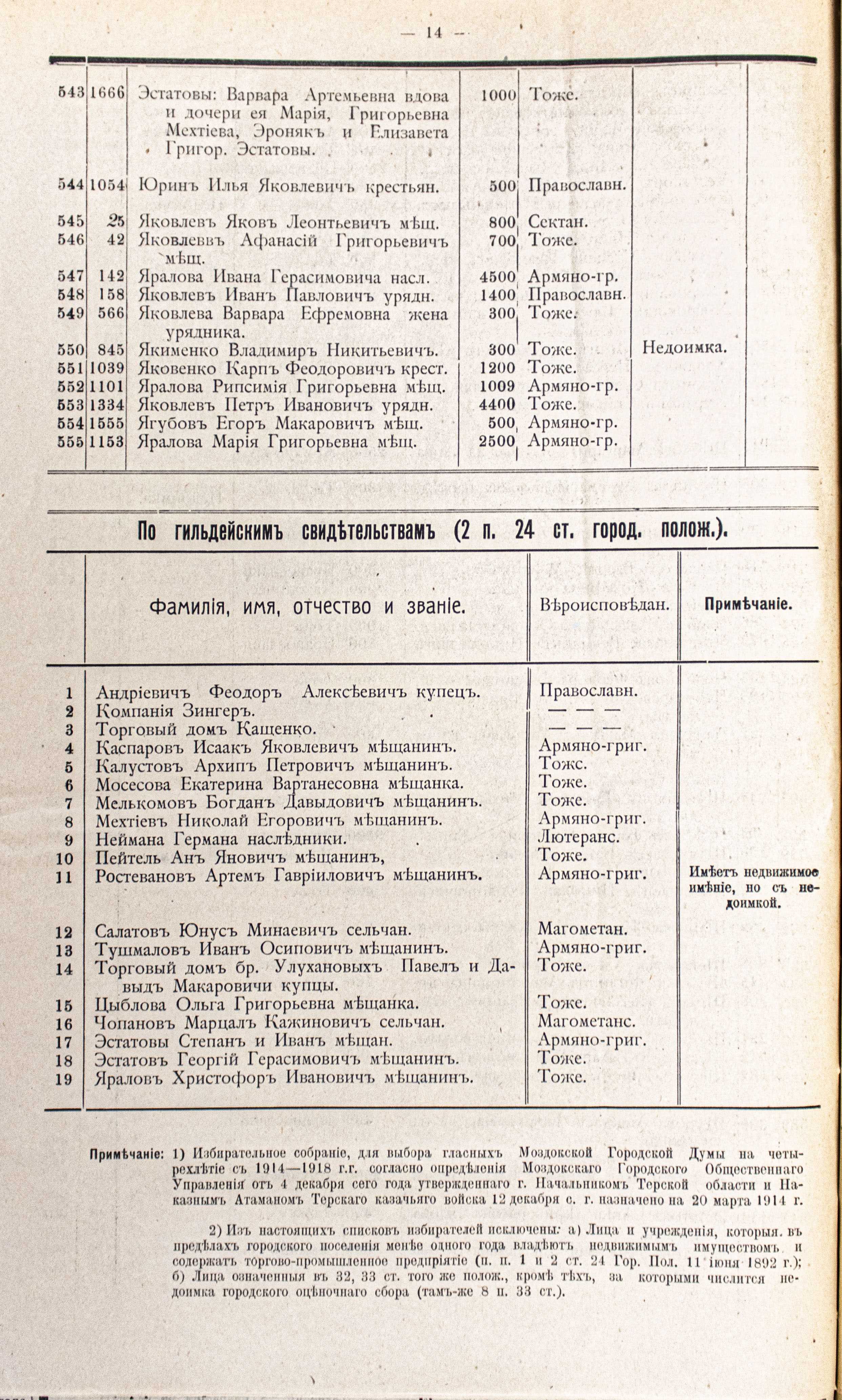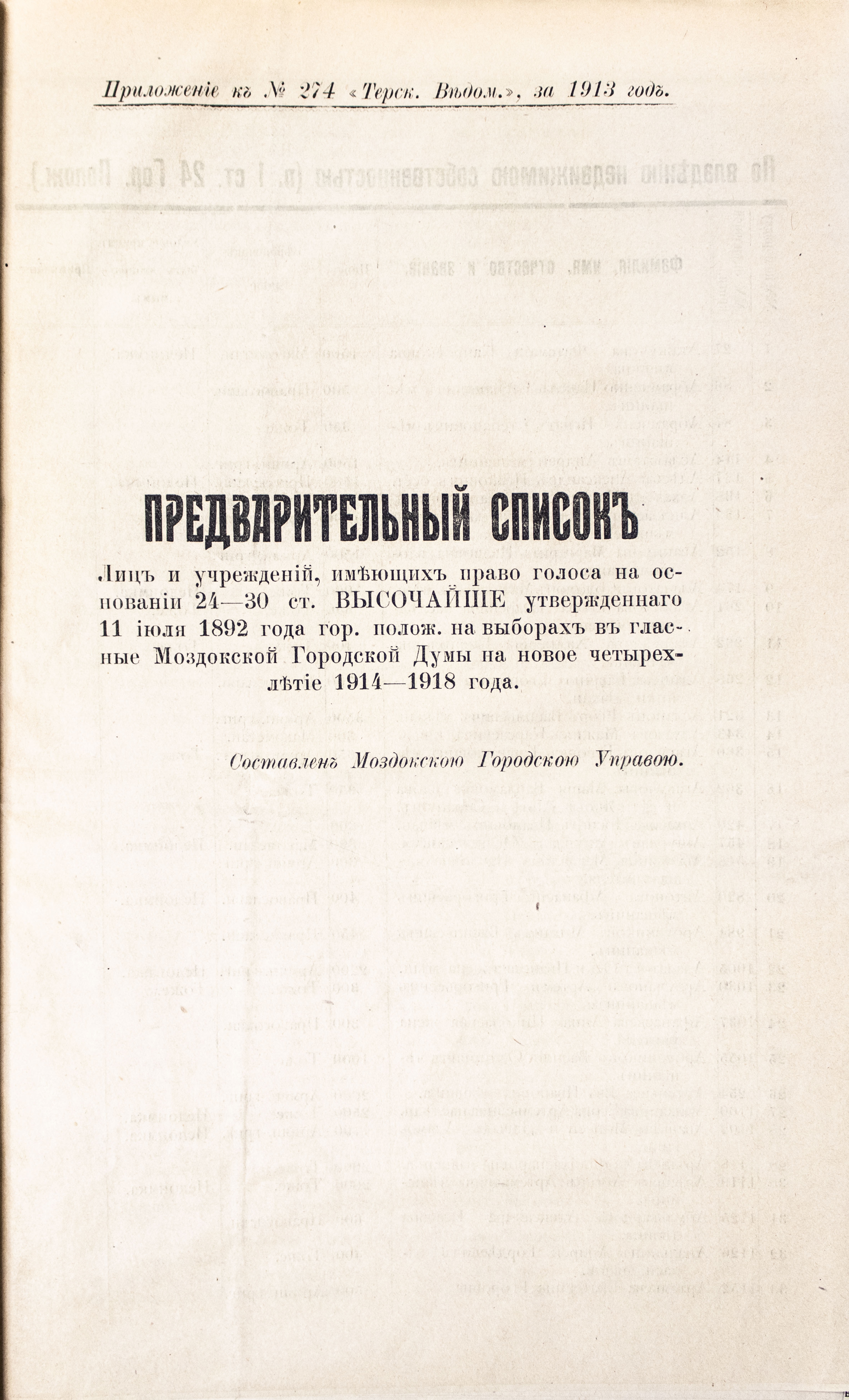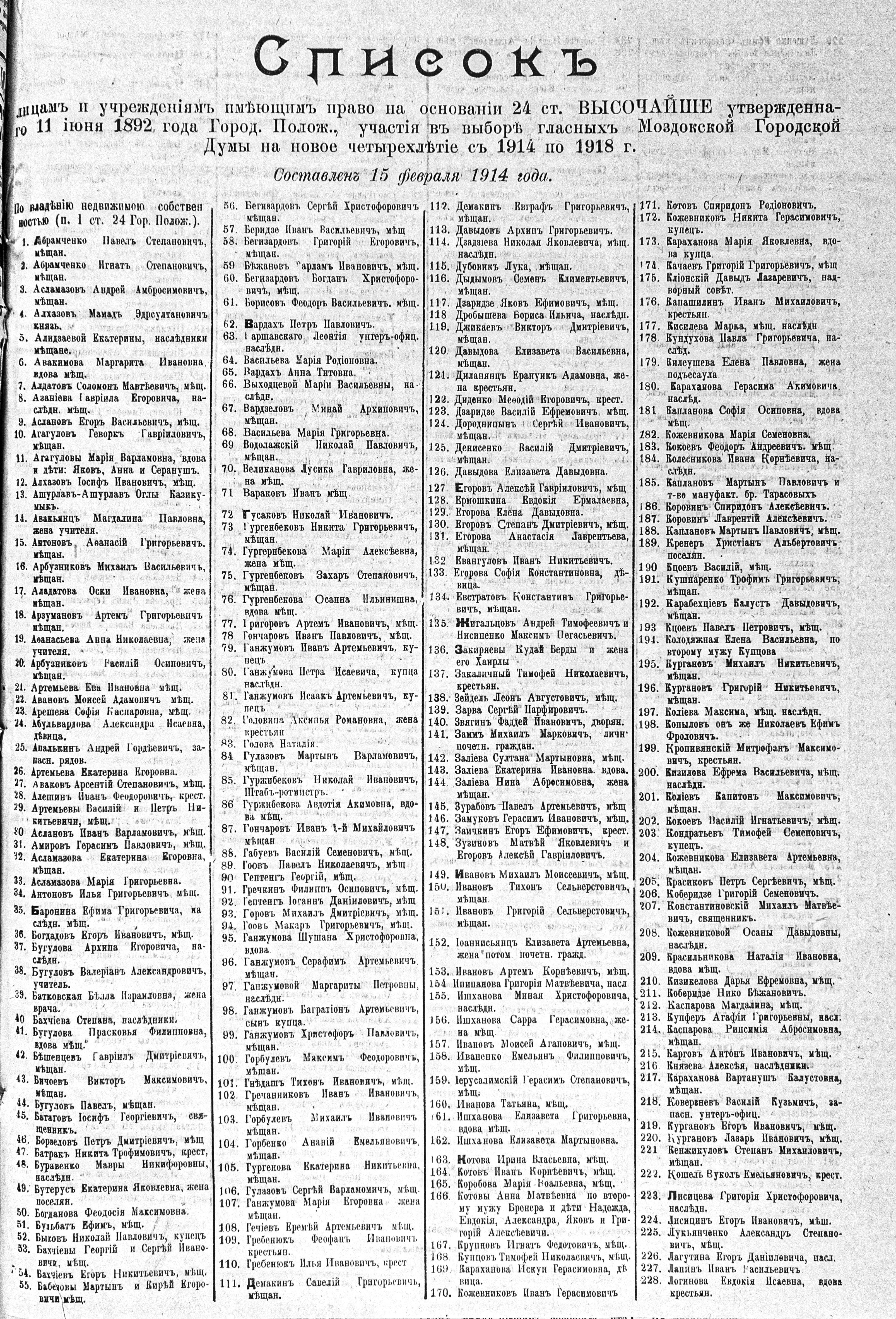 Списокъ лицамъ и учрежденіямъ имѣющимъ право на основаніи 24 ст. ВЫСОЧАЙШЕ утвержденнаго 11 іюня 1892 года Город. Полож. , участія въ выборѣ гласныхъ Моздокской Городской Думы на новое четырехлѣтіе съ 1914 по 1918 г.