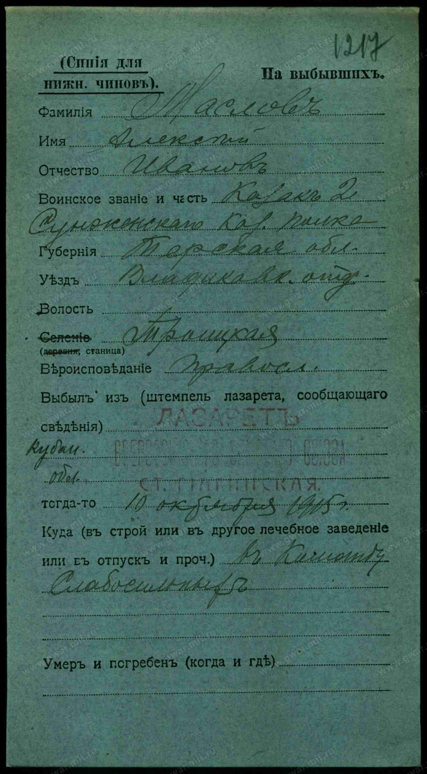14.04.1894 г. умер и 16.04.1894 г. погребен на военно-госпитальном кладбище казак Троицкой станицы Прокопий Маслов 58 лет, от старческого истощения.
