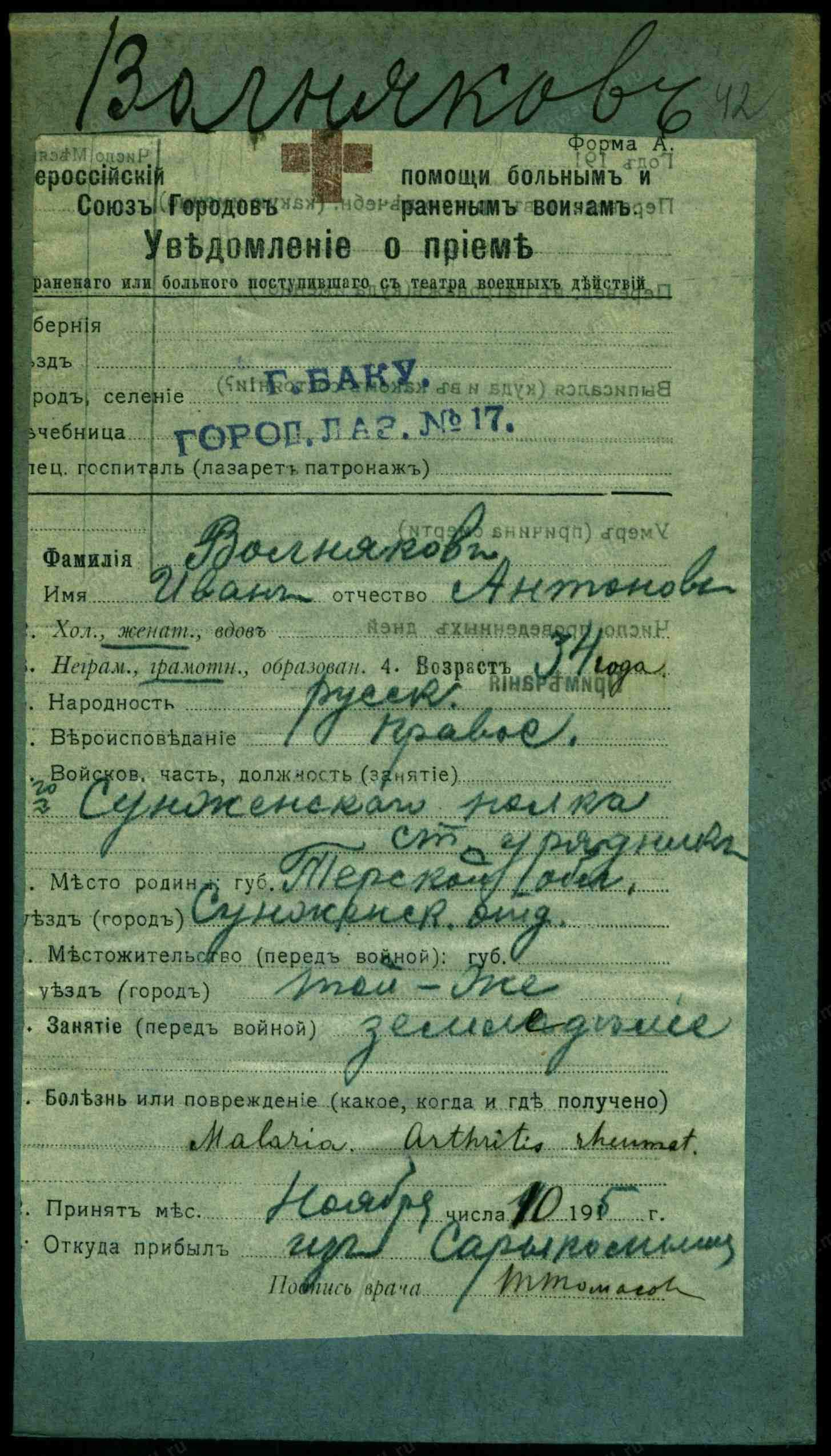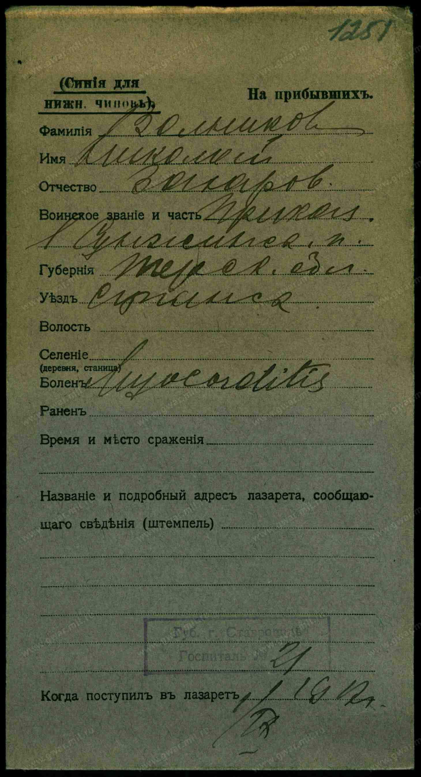 Майор, __.__.1909 Грозненская обл., Сунженский р-н, ст. Нестеровская. Сводная картотека