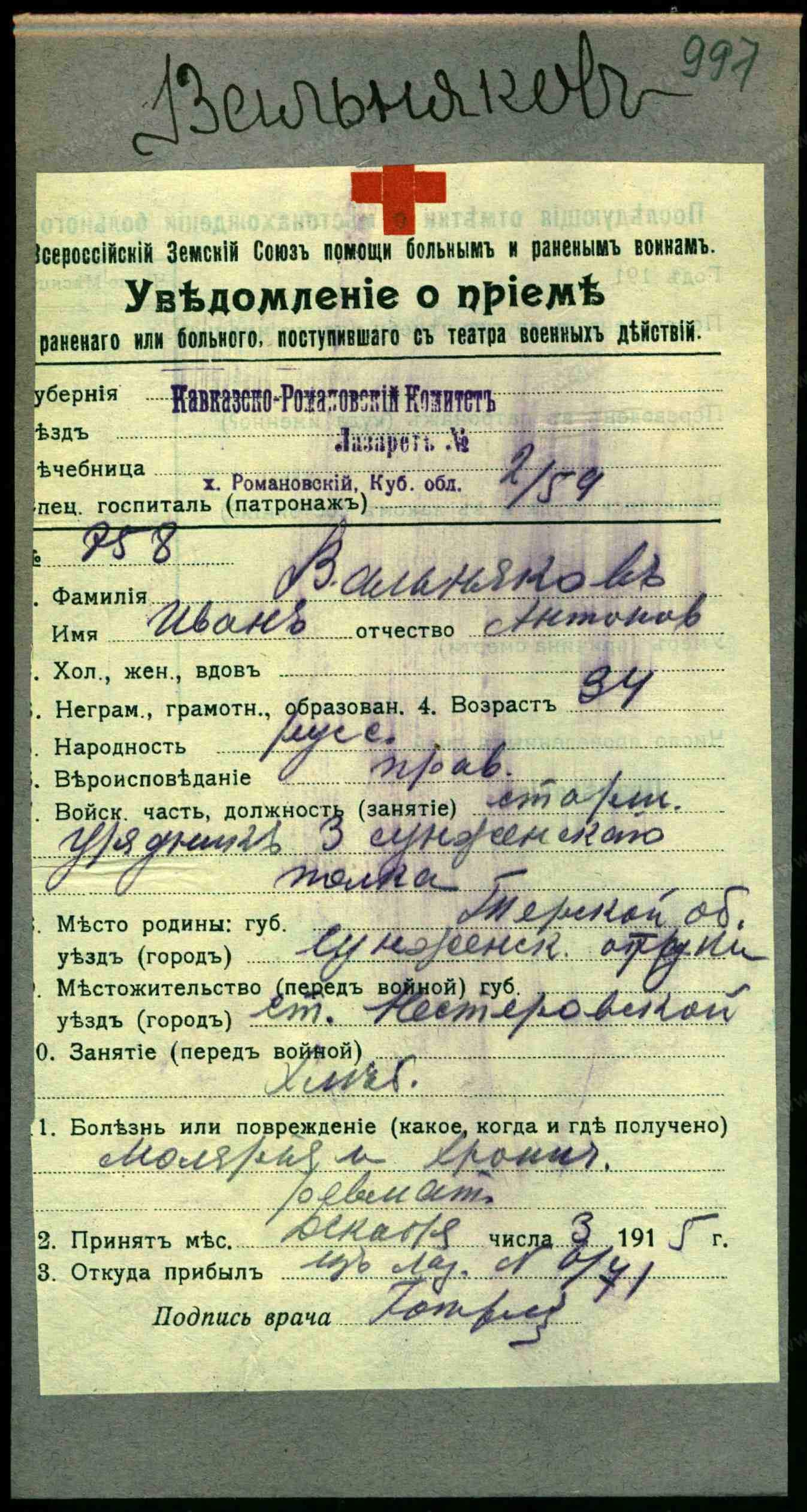 Рядовой, __.__.1913 Грозненская обл., Сунженский р-н, ст. Нестеровская. Донесение о потерях