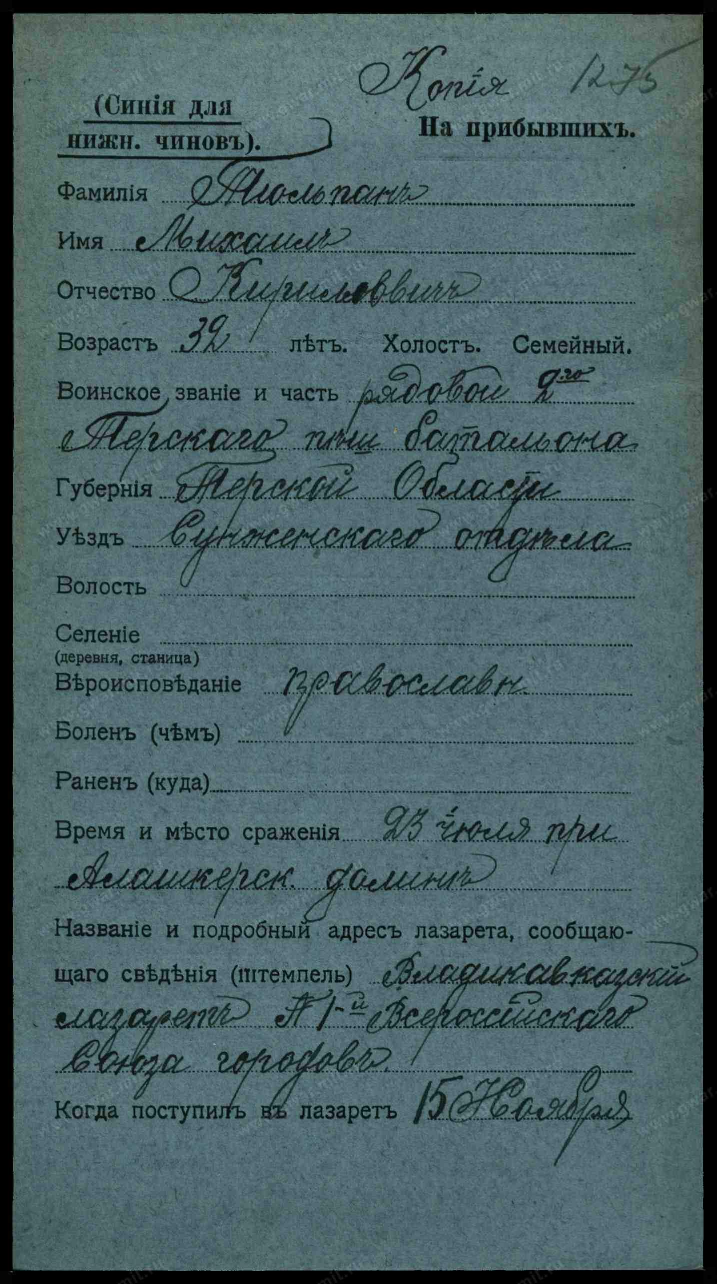 Список нижним чинам назначенным на пополнение 1-го Сунженско-Владикавказского полка от Сунженского отдела Терской области