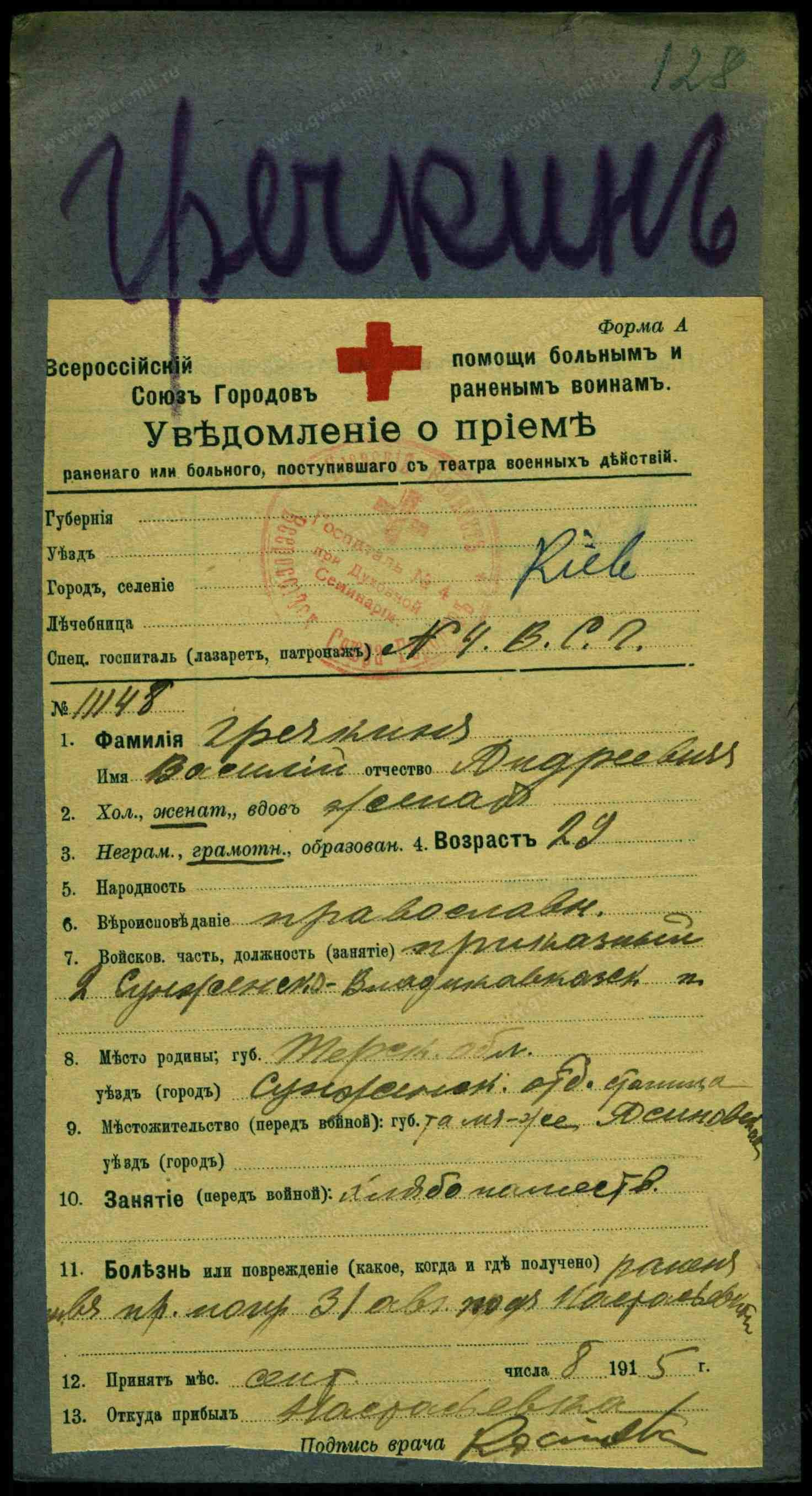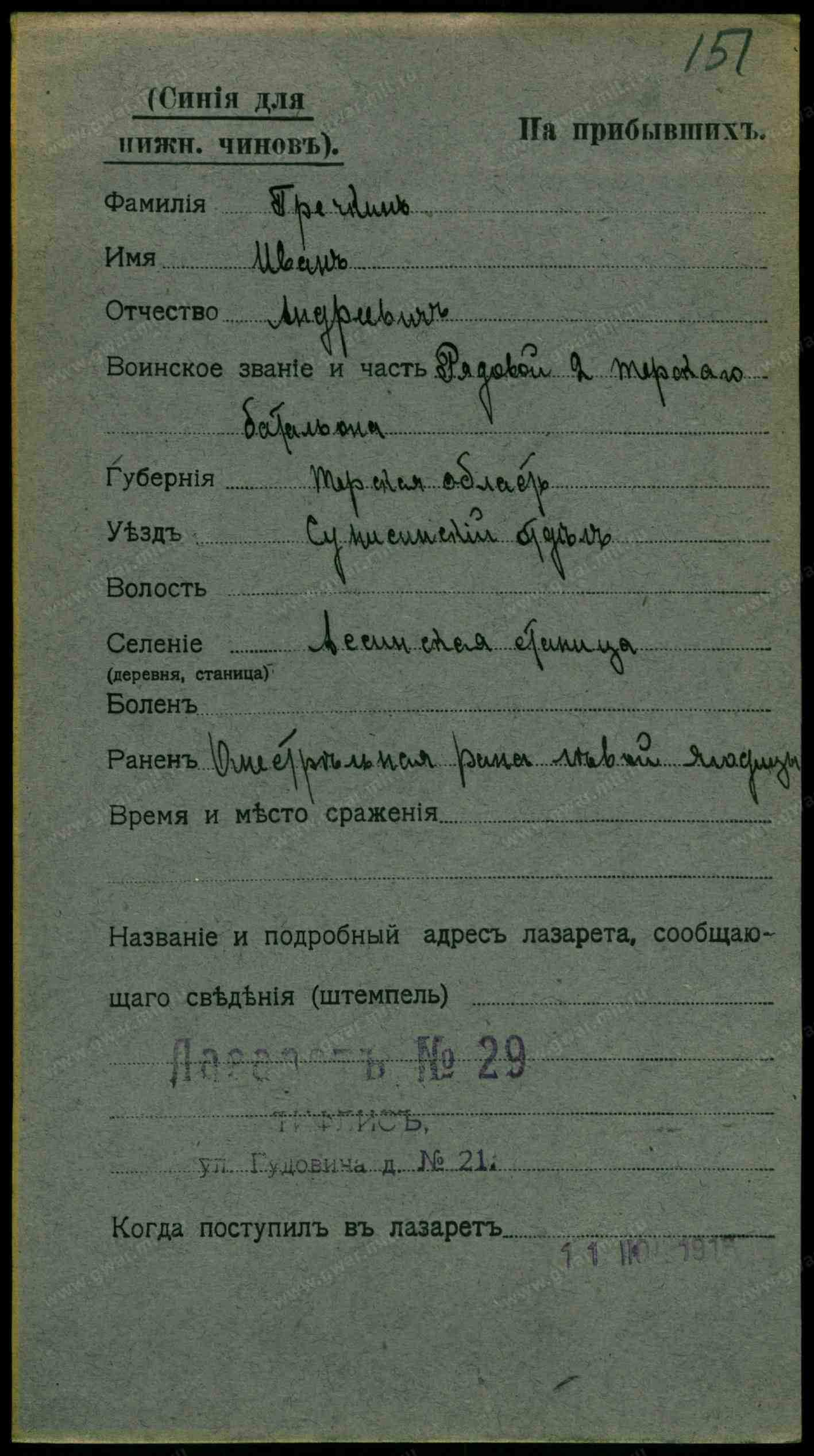 Место выбытия 192 полевой подвижной госпиталь, г. Станиславов