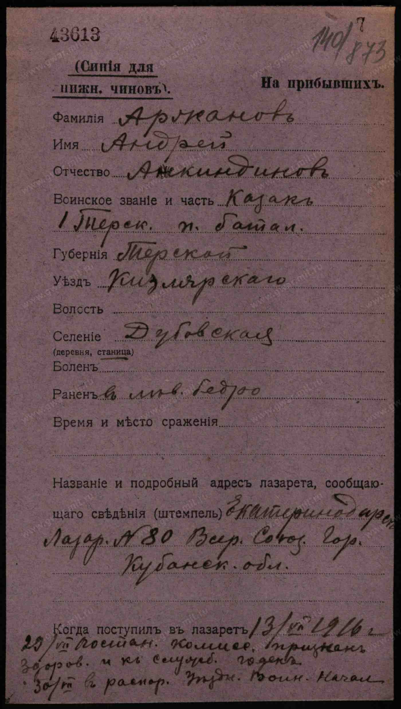 Место рождения Терская обл., Кизлярский округ (отдел), стнц. Дубовская