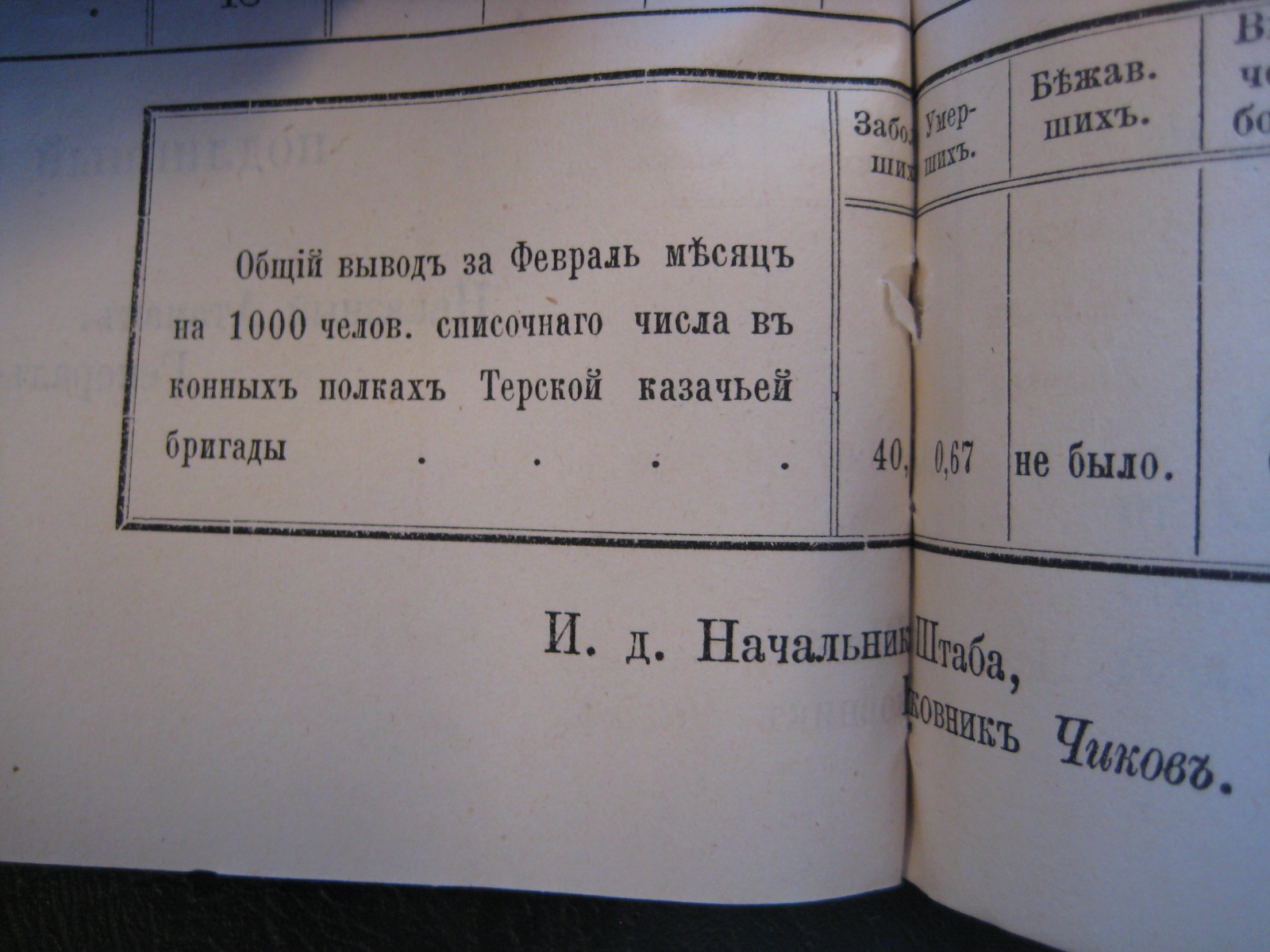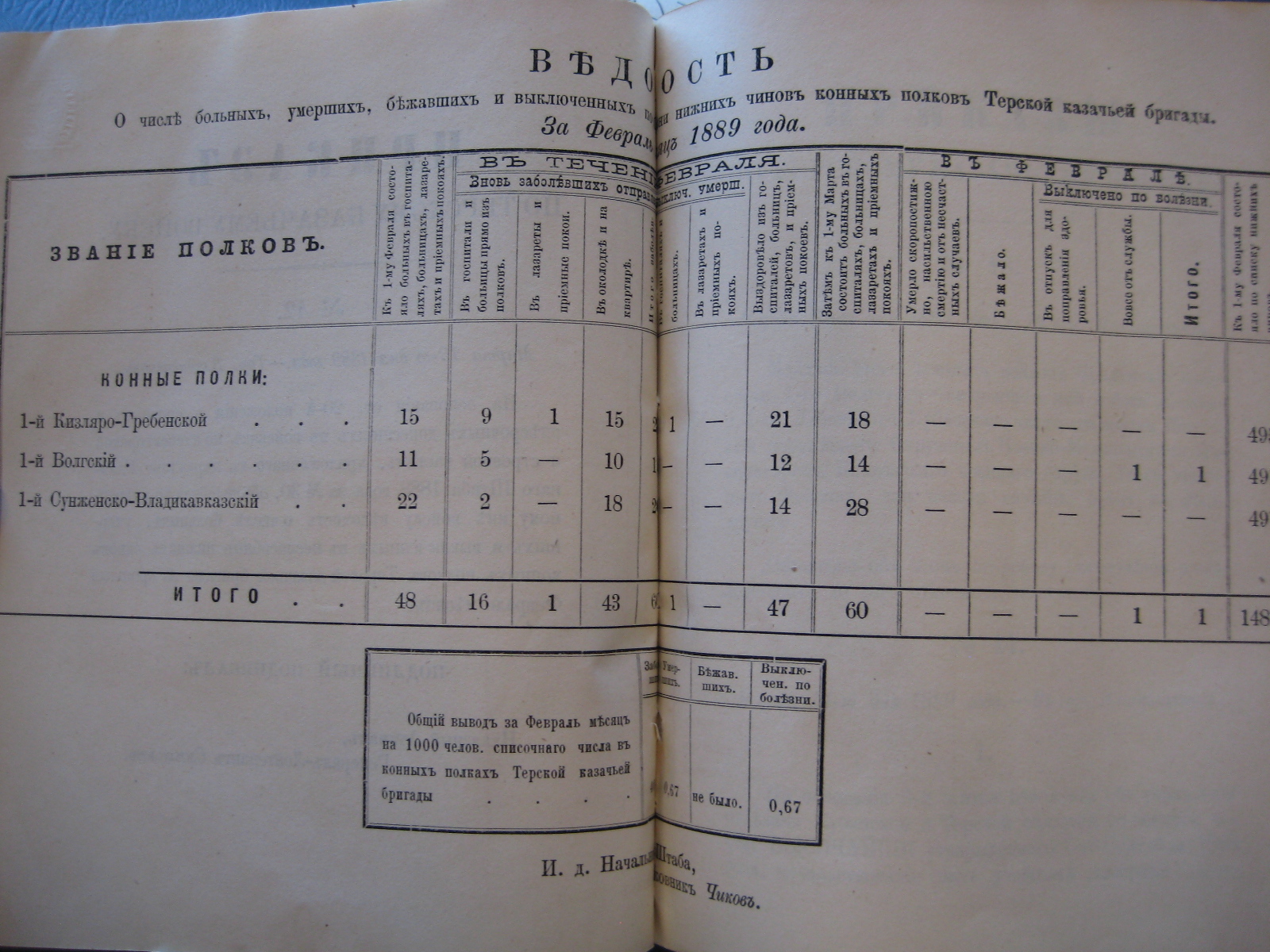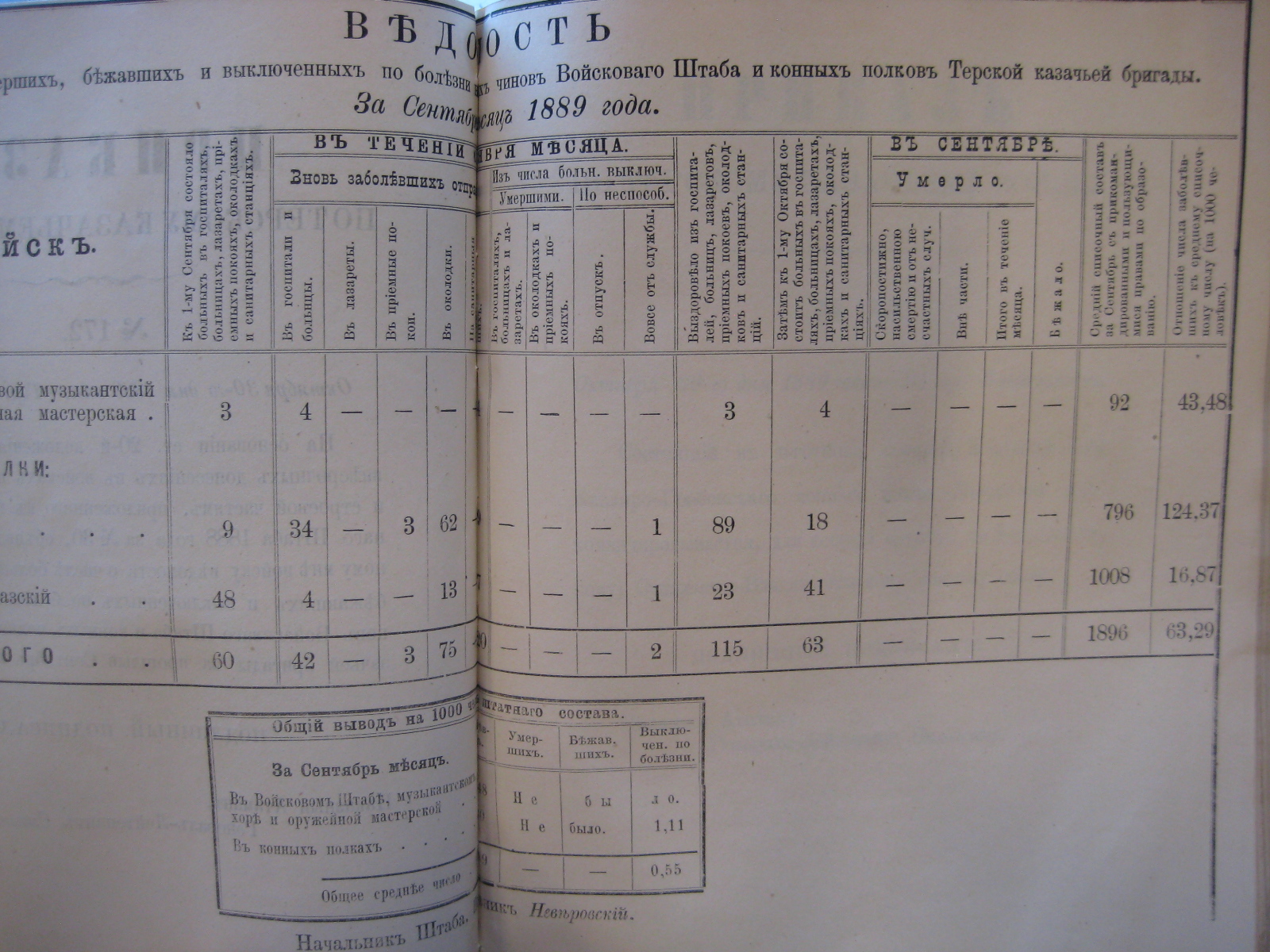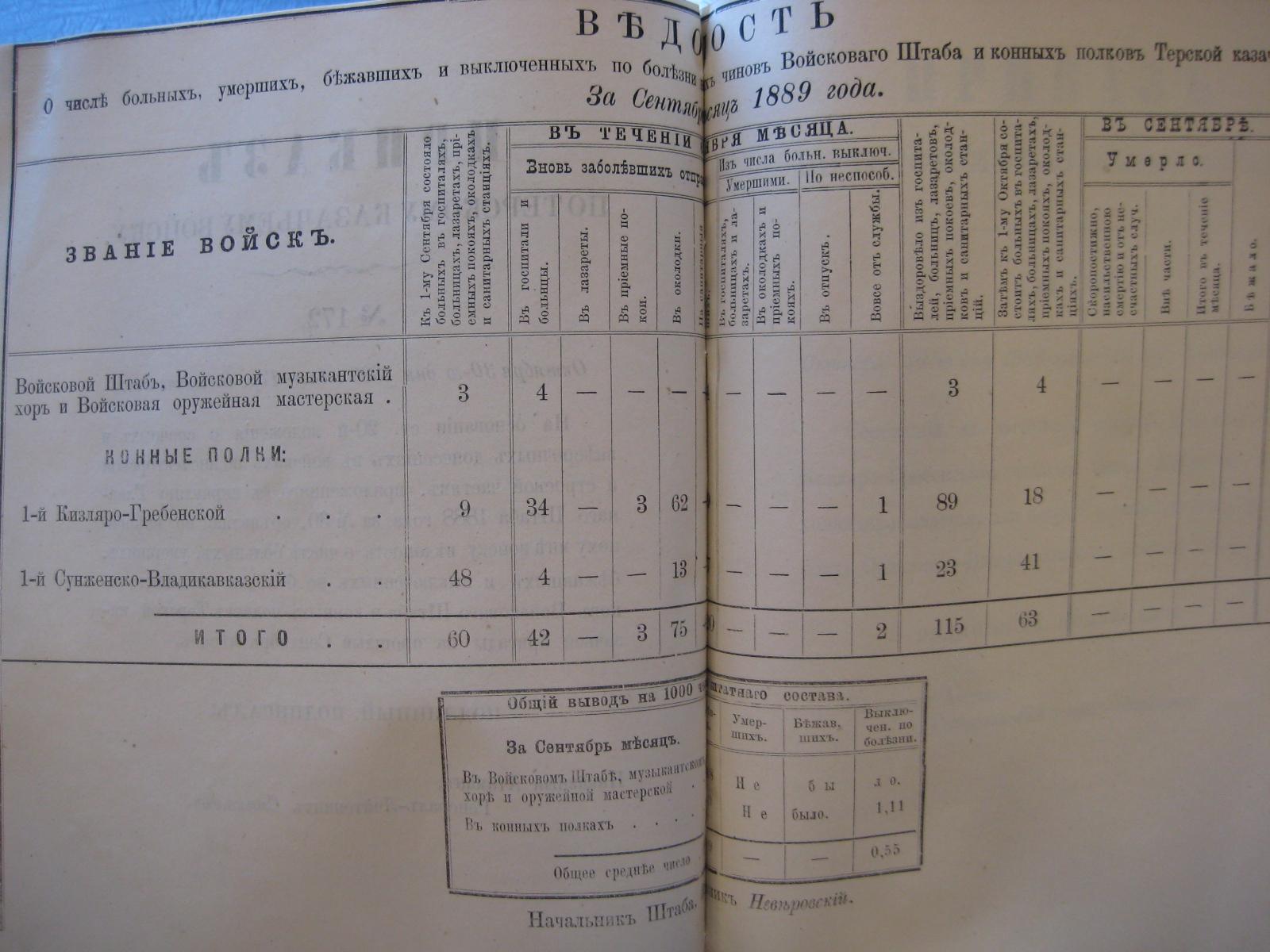На основаніи ст. 20-й положенія о срочныхъ и внѣсрочныхъ донесеніяхъ въ войскахъ по инспекторской и строевой частямъ, приложеннаго къ циркуляру Главнаго Штаба 1888 года за No 30, объявляю по ввѣренному мнѣ войску вѣдомость о числѣ больныхъ, умершихъ, бѣжавшихъ и выключенныхъ по болѣзни нижнихъ чиновъ Войсковаго Штаба и конныхъ полковъ Терской казачьей бригады за прошлый Сентябрь мѣсяцъ.