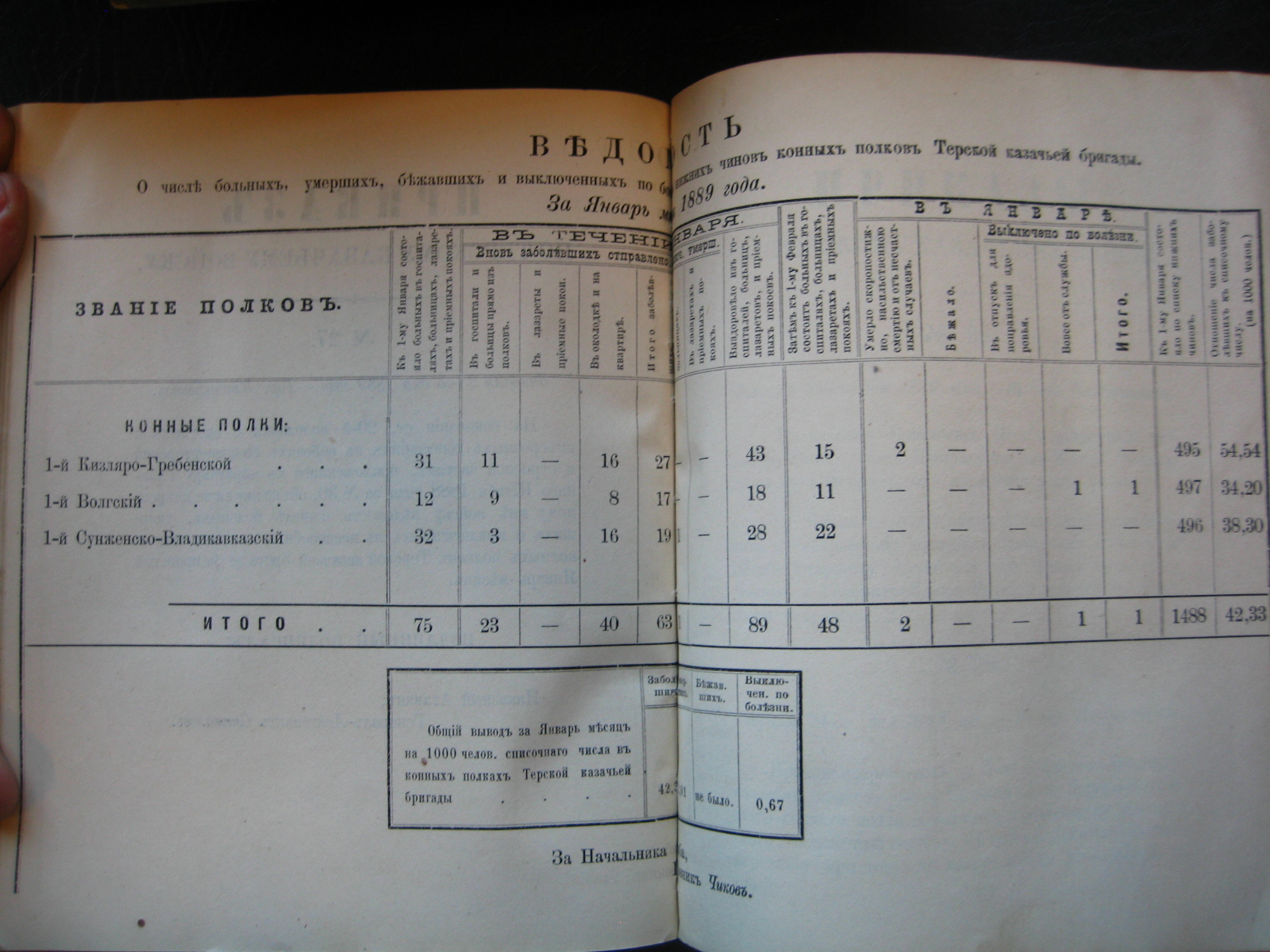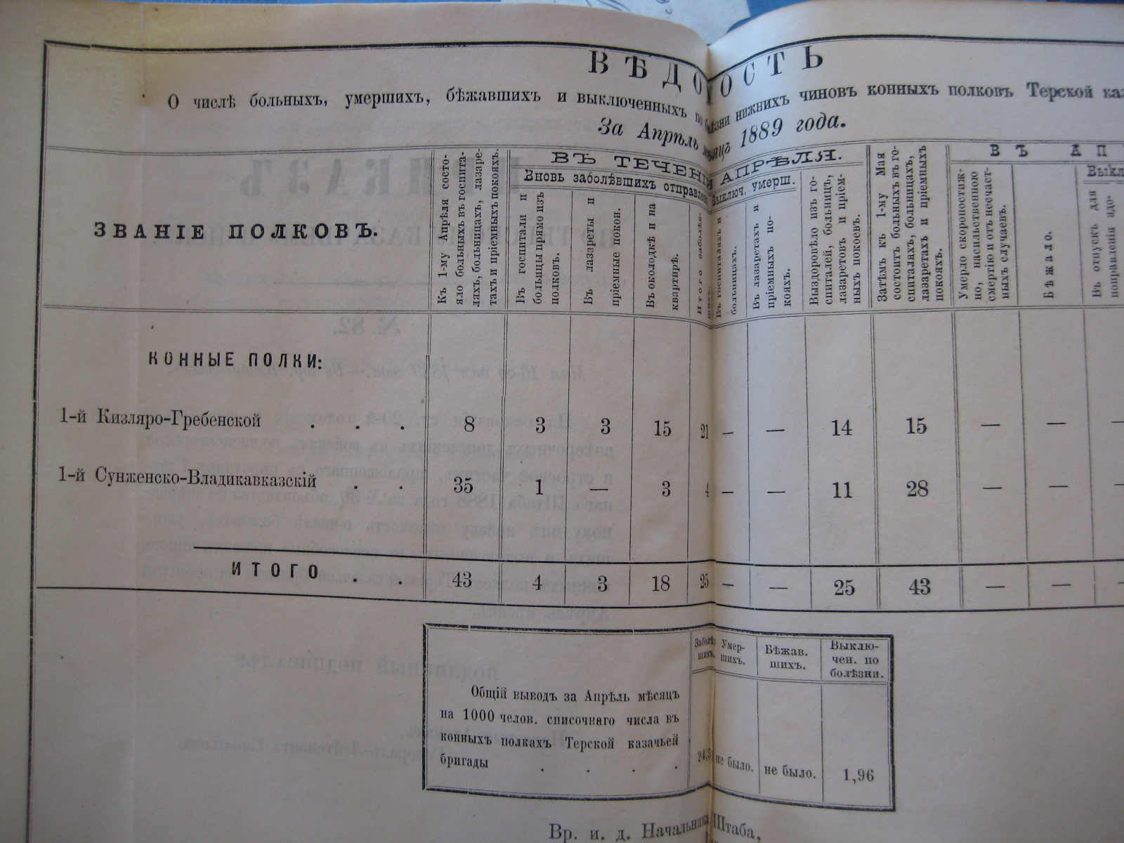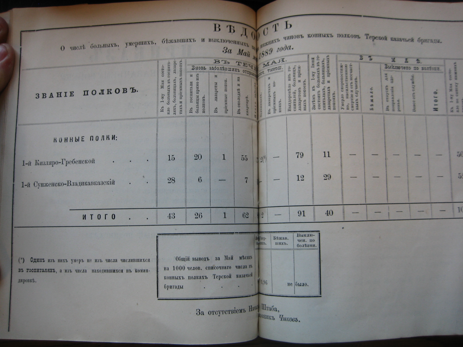 На основаніи ст. 20-й положенія о срочныхъ и внѣсрочныхъ донесеніяхъ въ войскахъ по инспекторской и строевой частямъ, приложеннаго къ циркуляру Главнаго Штаба 1888 года за No 30, объявляю по ввѣренному мнѣ войску вѣдомость о числѣ больныхъ, умершихъ, бѣжавшихъ и выключенныхъ по болѣзни нижнихъ чиновъ Войсковаго Штаба и конныхъ полковъ Терской казачьей бригады за прошлый Сентябрь мѣсяцъ.