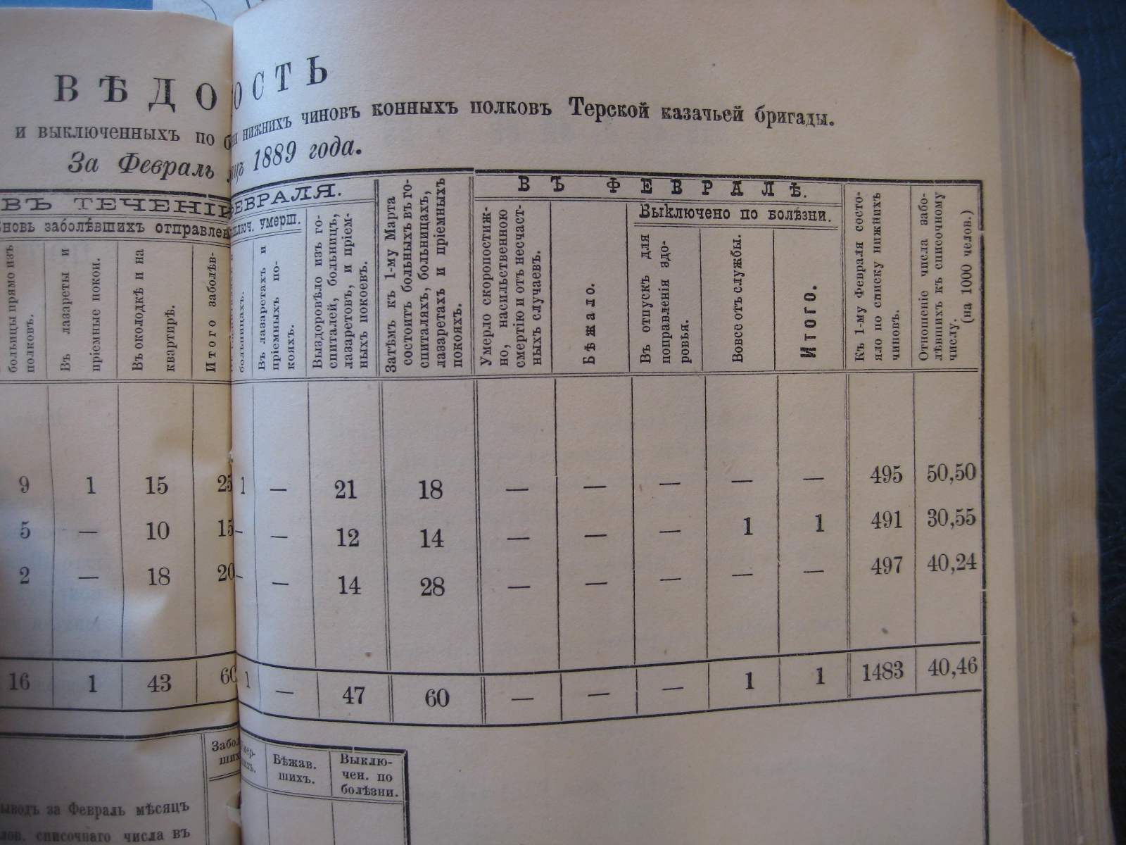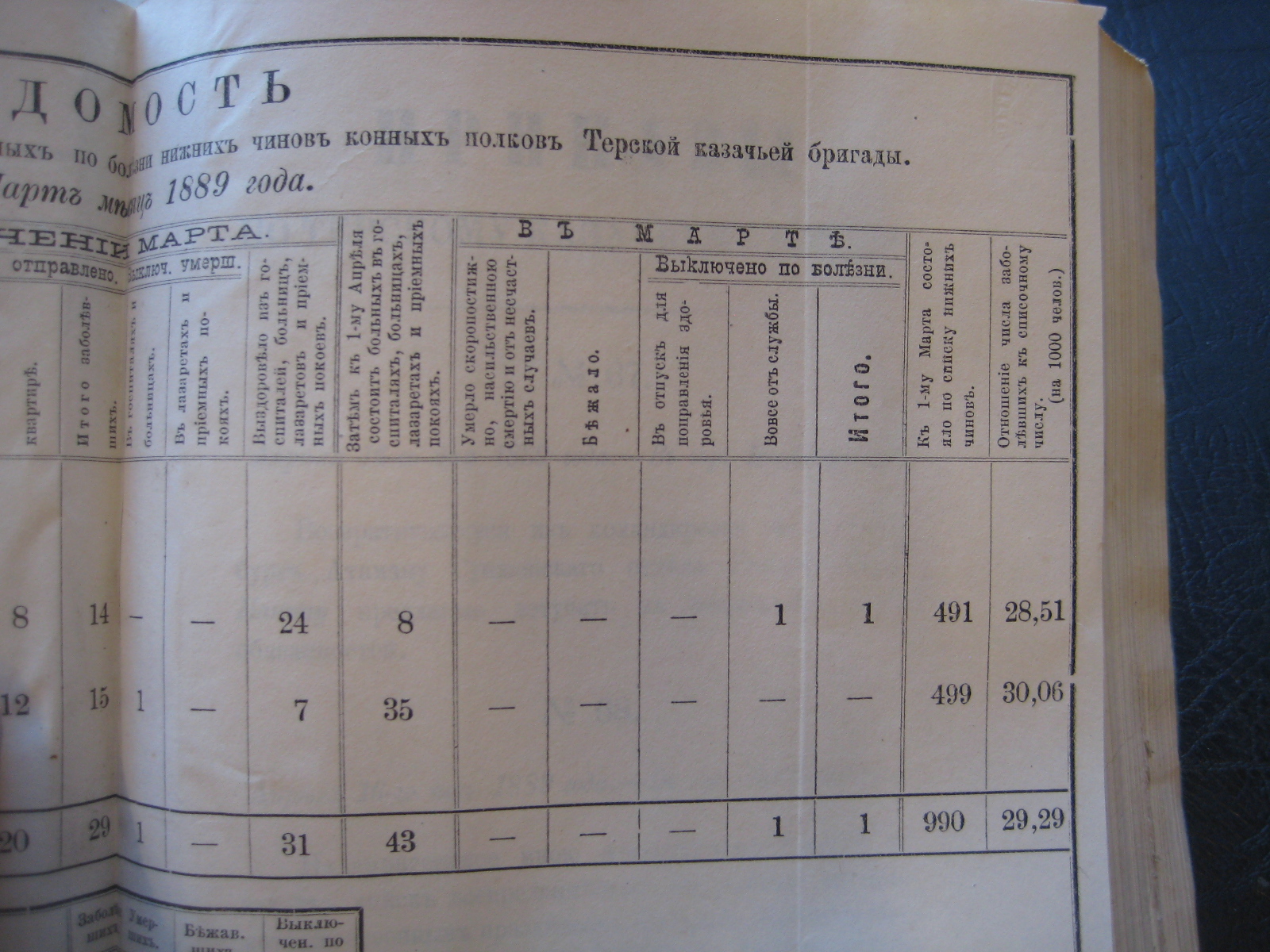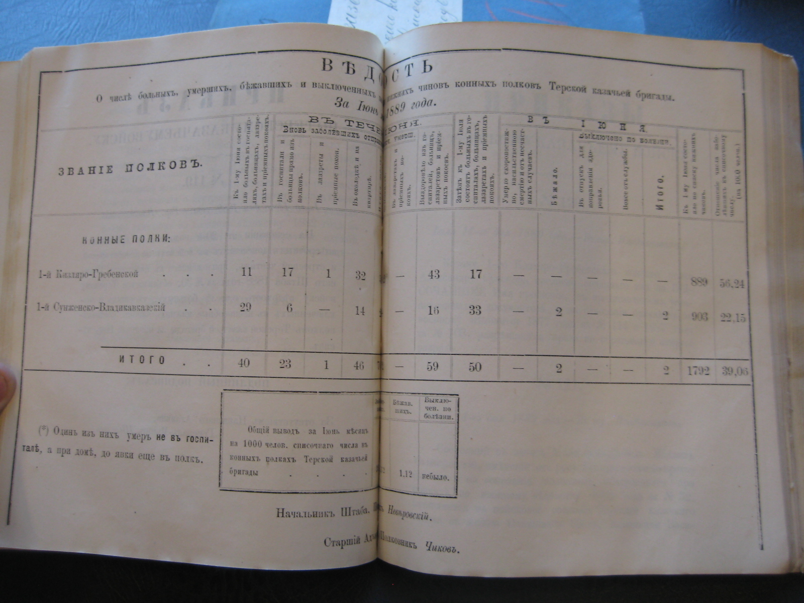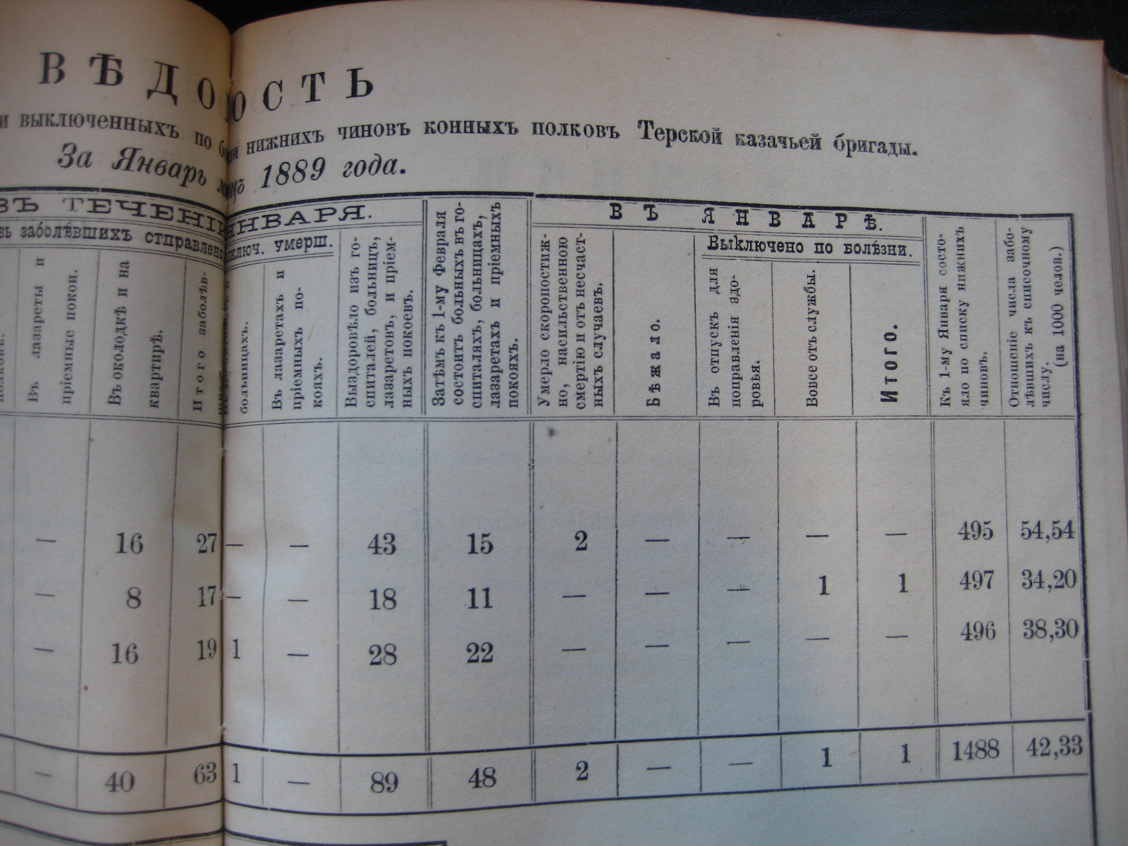 На основаніи ст. 20-й положенія о срочныхъ и внѣсрочныхъ донесеніяхъ въ войскахъ по инспекторской и строевой частямъ, приложеннаго къ циркуляру Главнаго Штаба 1888 года за No 30, объявляю по ввѣренному мнѣ войску вѣдомость о числѣ больныхъ, умершихъ, бѣжавшихъ и выключенныхъ по болѣзни нижнихъ чиновъ Войсковаго Штаба и конныхъ полковъ Терской казачьей бригады за прошлый Сентябрь мѣсяцъ.