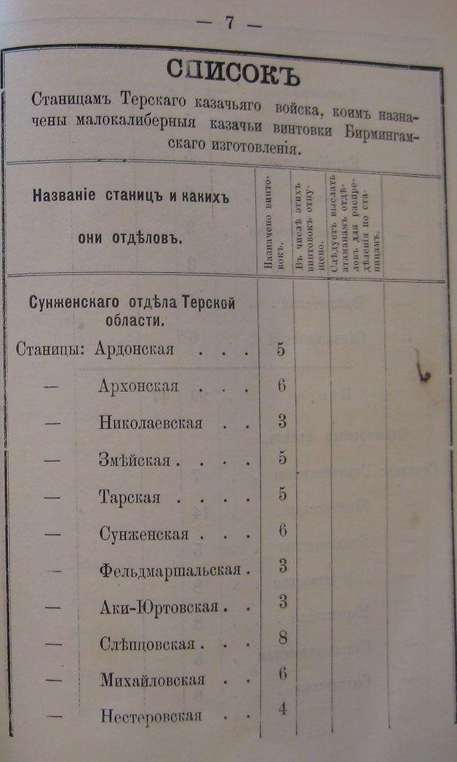 Кромѣ того для таковой же цѣли и на вооруженіе казаковъ запаснаго разряда, сопровождающихъ Государственныя почты разновременно выдано изъ винтовокъ Бирмингамскаго изготовленія 10 - Начальнику Кизлярскаго округа, 21 - Атаману Пятигорскаго отдѣла, 12 - Атаману Кизлярскаго отдѣла и 47- Атаману Сунженскаго отдѣла, всего 90 винтовокъ. Затѣмъ въ войсковомъ оружейномъ складѣ остается на лицо 342 винтовки: