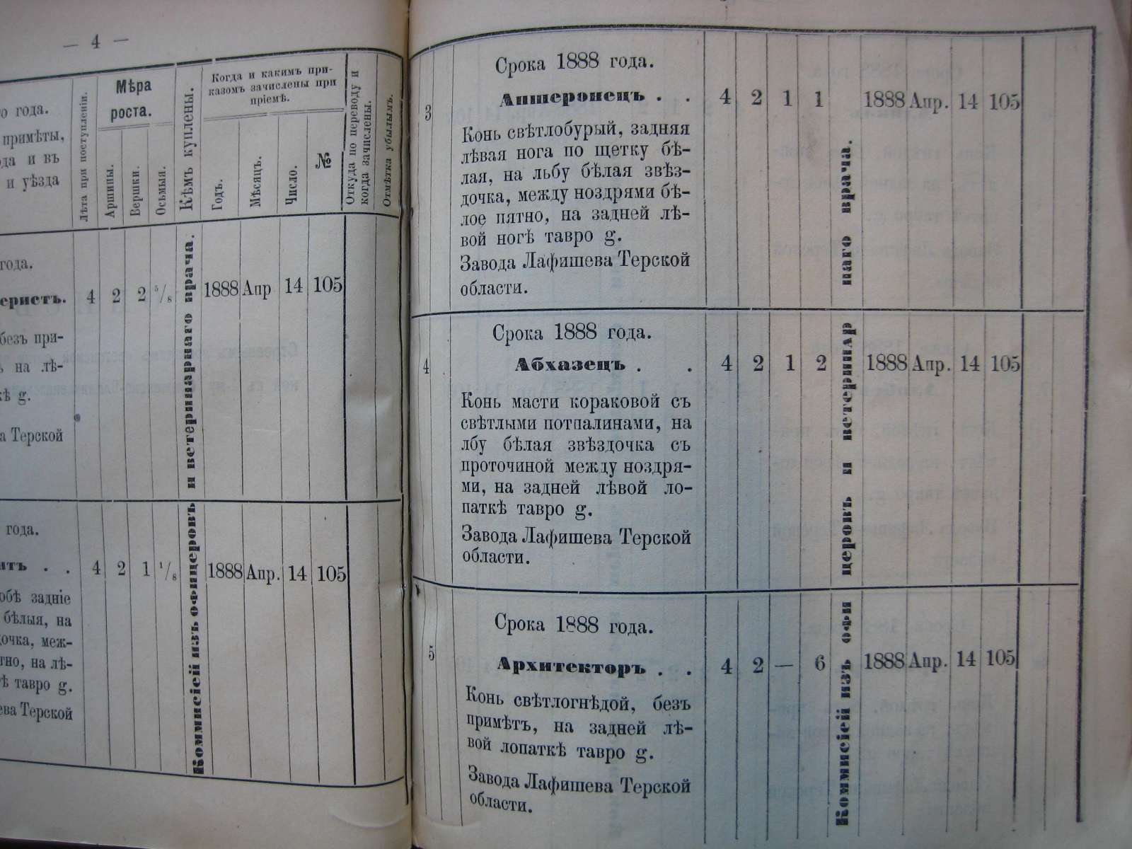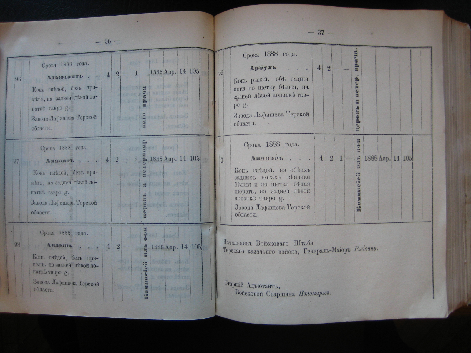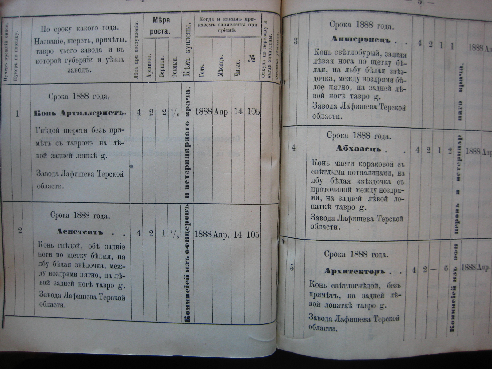 Конныхъ полковъ: 1-го Волгскаго - Якуббо (Яковъ) съ 1-го Января 1885 года, 1-го Кизляро-Гребенскаго - Астаховъ (Алексѣй) съ 11-го Мая 1887 года, 1-го Сунженско-Владикавказскаго - Зерщиковъ (Михей) и 1-го Кизляро-Гребенекаго - Кривозубкинъ (Иванъ), оба - съ 7-го Января 1889 года, 1-го Горско-Моздокскаго - Яковлевъ (Георгій), съ 11-го Апреля 1889 года, 1-го Сунженско-Владикавказскаго - Алейниковъ (Семенъ), съ 22-го Іюня 1889 года и Хатаевъ (Андрей), съ 23-го Августа 1889 года.