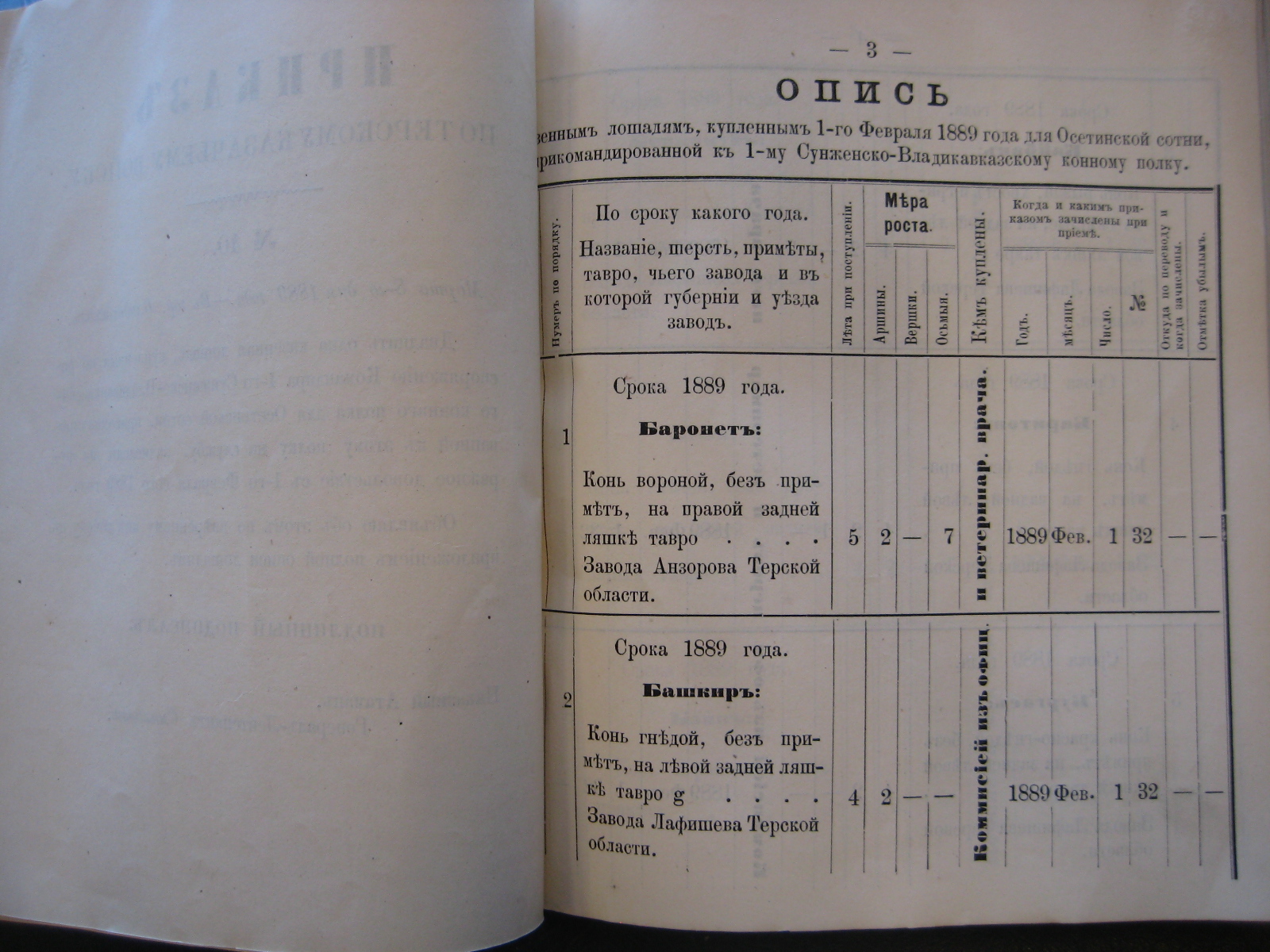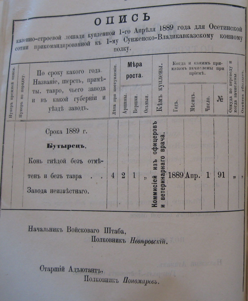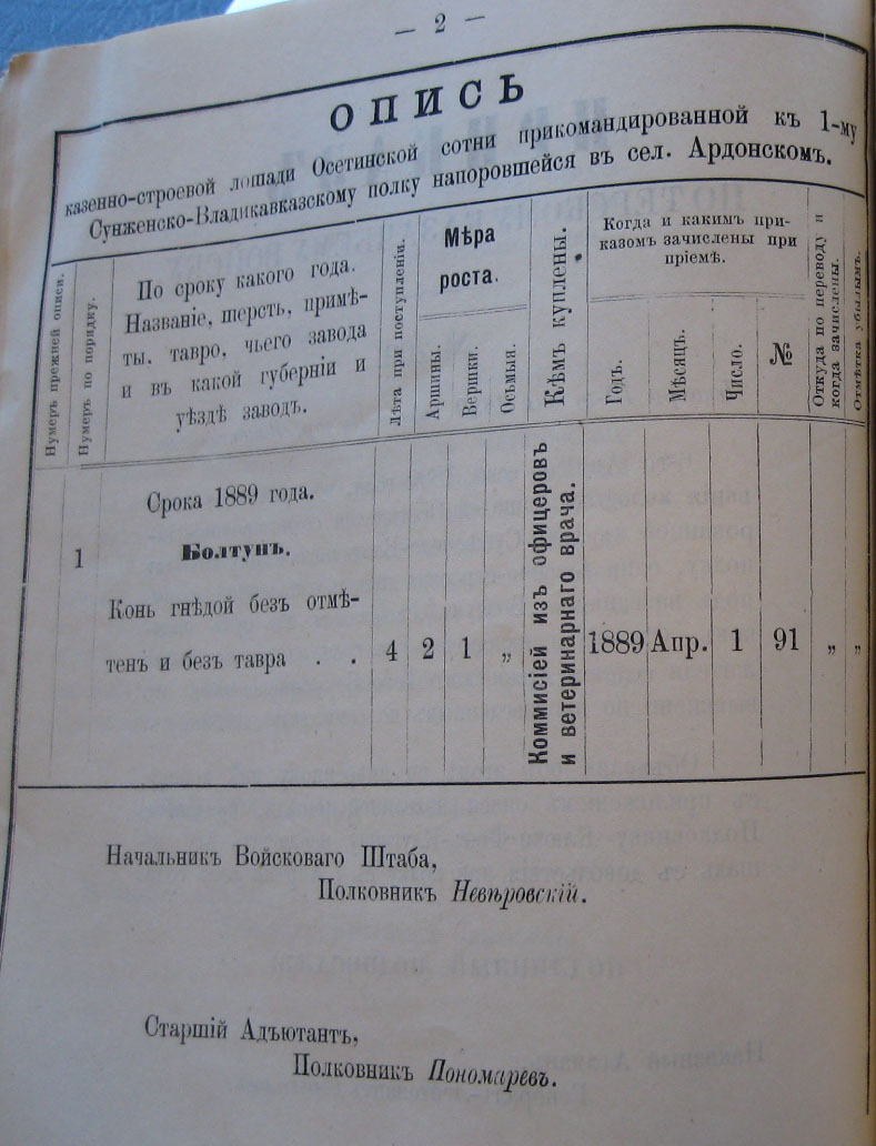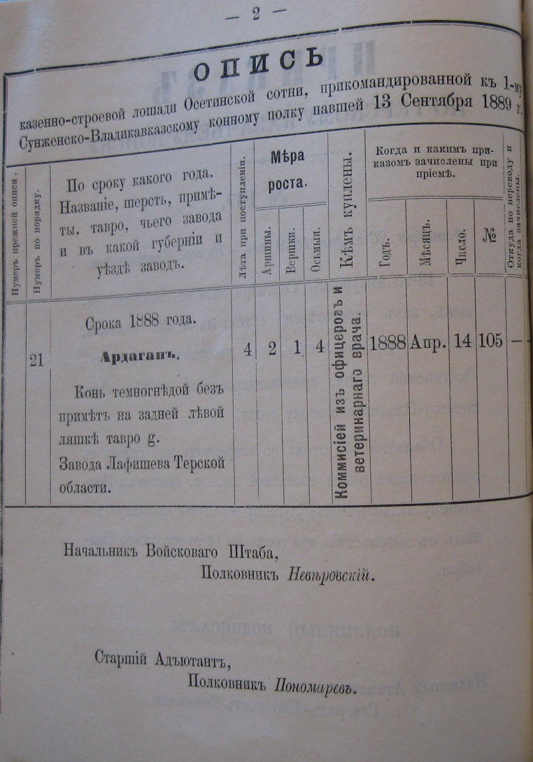 13-го минувшаго Сентября пала отъ заворота кишекъ, какъ удостовѣрено актомъ за No 131 коммисіи, казенно-строевая лошадь подъ названіемъ "Ардаганъ" Осетинской сотни, прикомандированной к 1-му Сунженско-Владикавказскому полку.