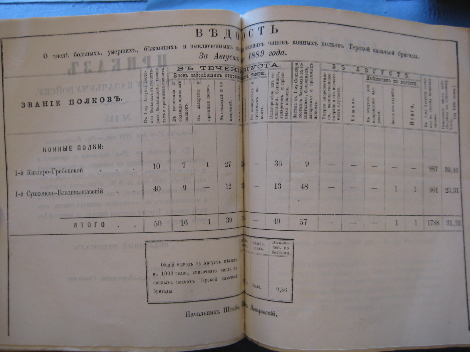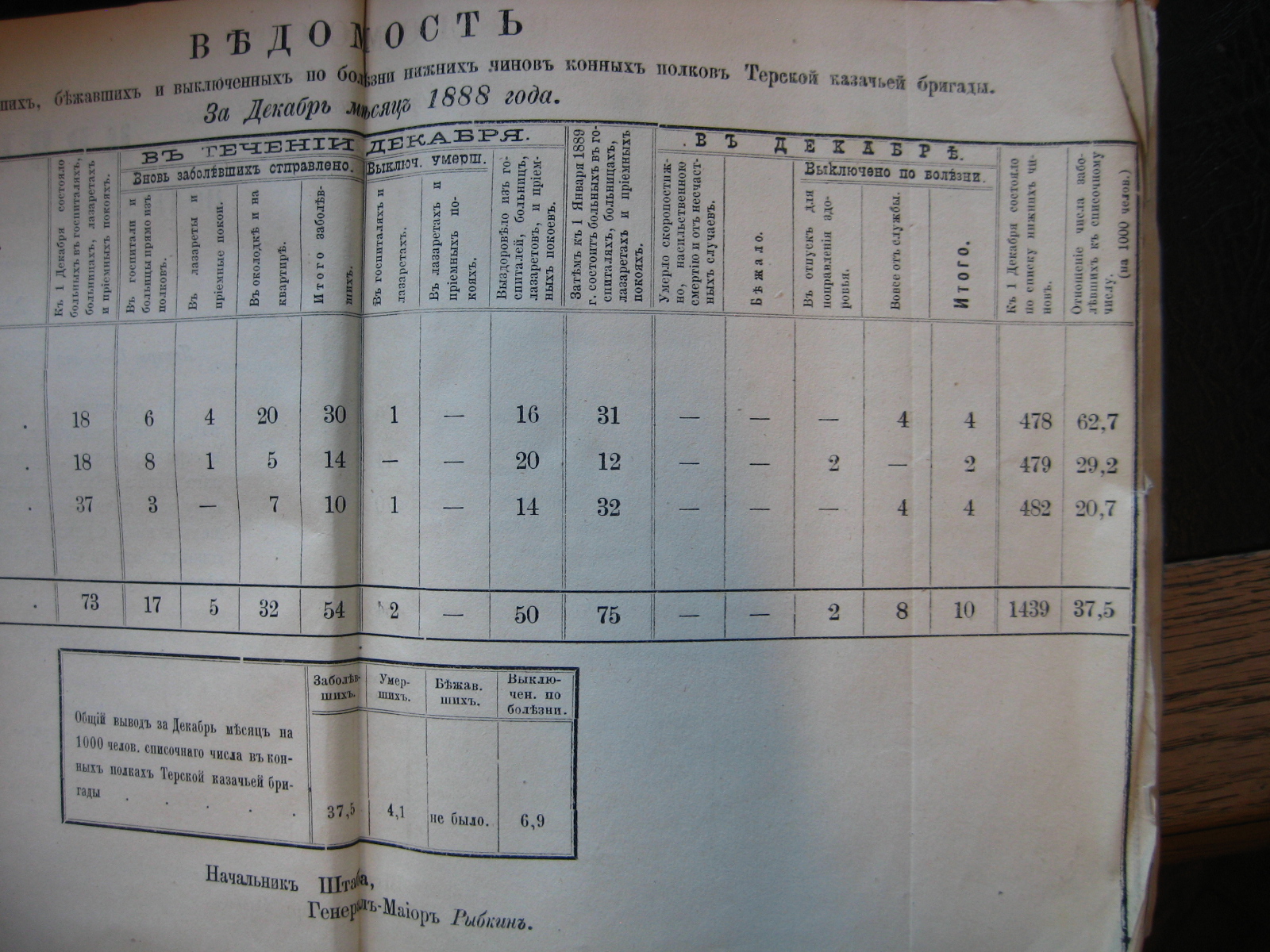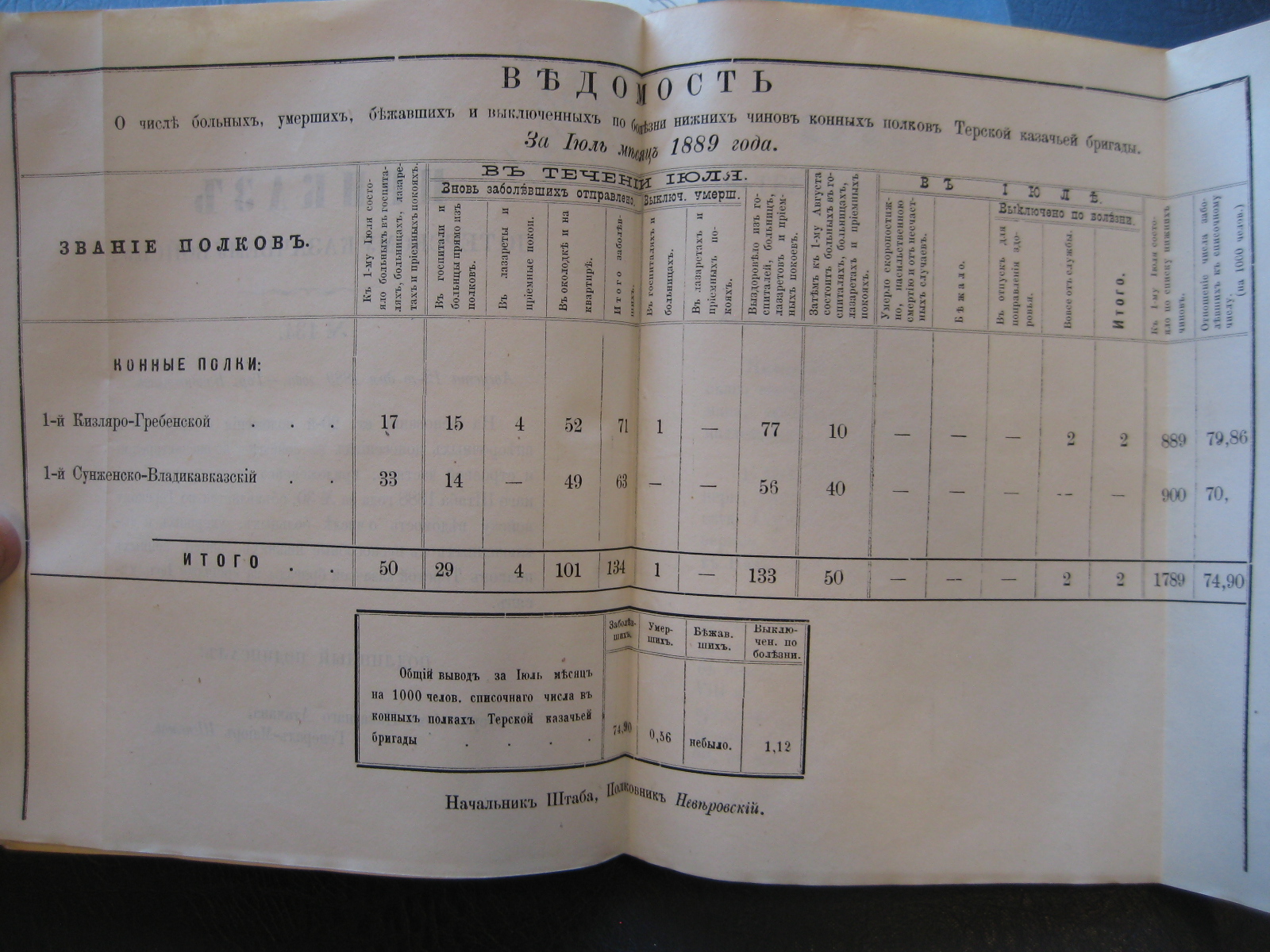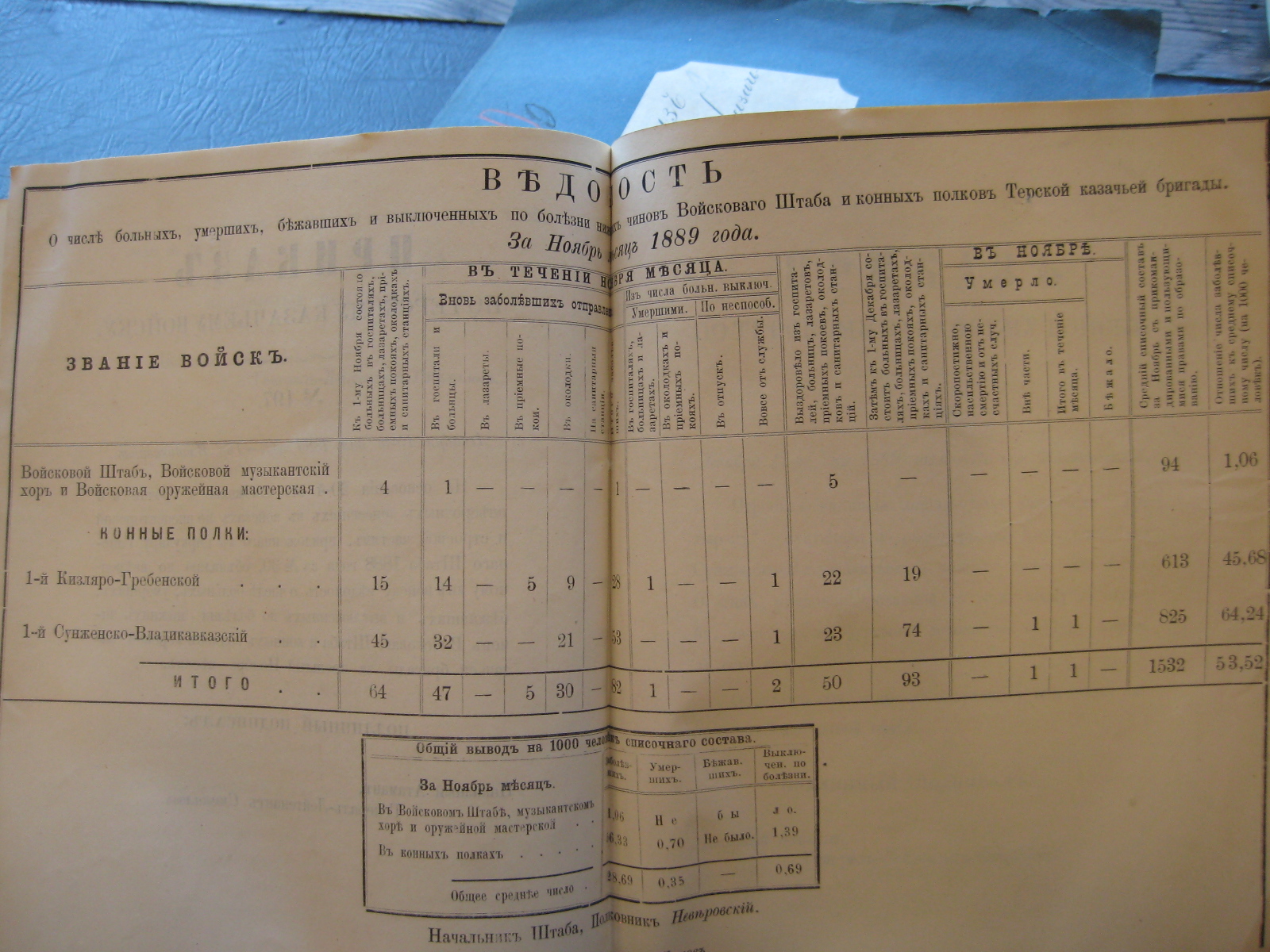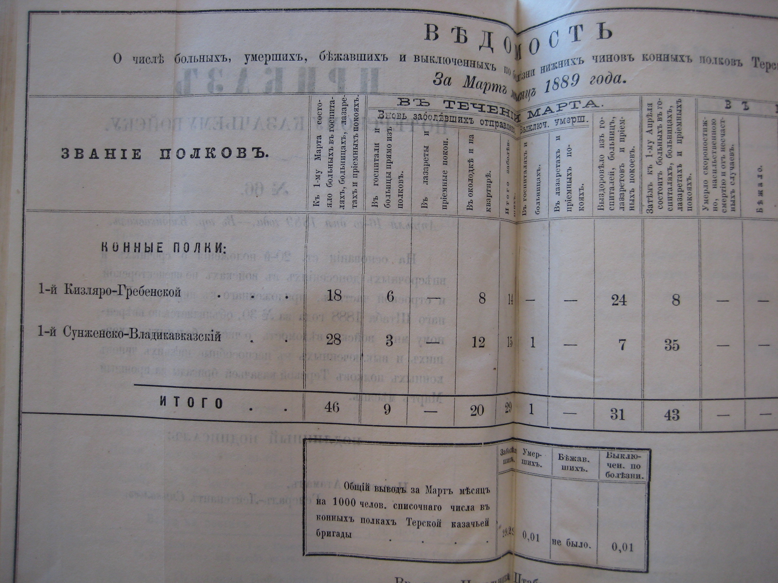На основаніи 20-й ст. положенія о срочныхъ и внѣсрочныхъ донесеніяхъ въ войскахъ по инспекторской и строевой частямъ, приложеннаго къ циркуляру Главнаго Штаба 1888 года за No 30, объявляю по ввѣренному мнѣ войску вѣдомость о числѣ больныхъ, умершихъ, бѣжавшихъ и выключенныхъ по болѣзни нижнихъ чиновъ Войсковаго Штаба и конныхъ полковъ Терской казачьей бригады за прошлый Октябрь мѣсяцъ.