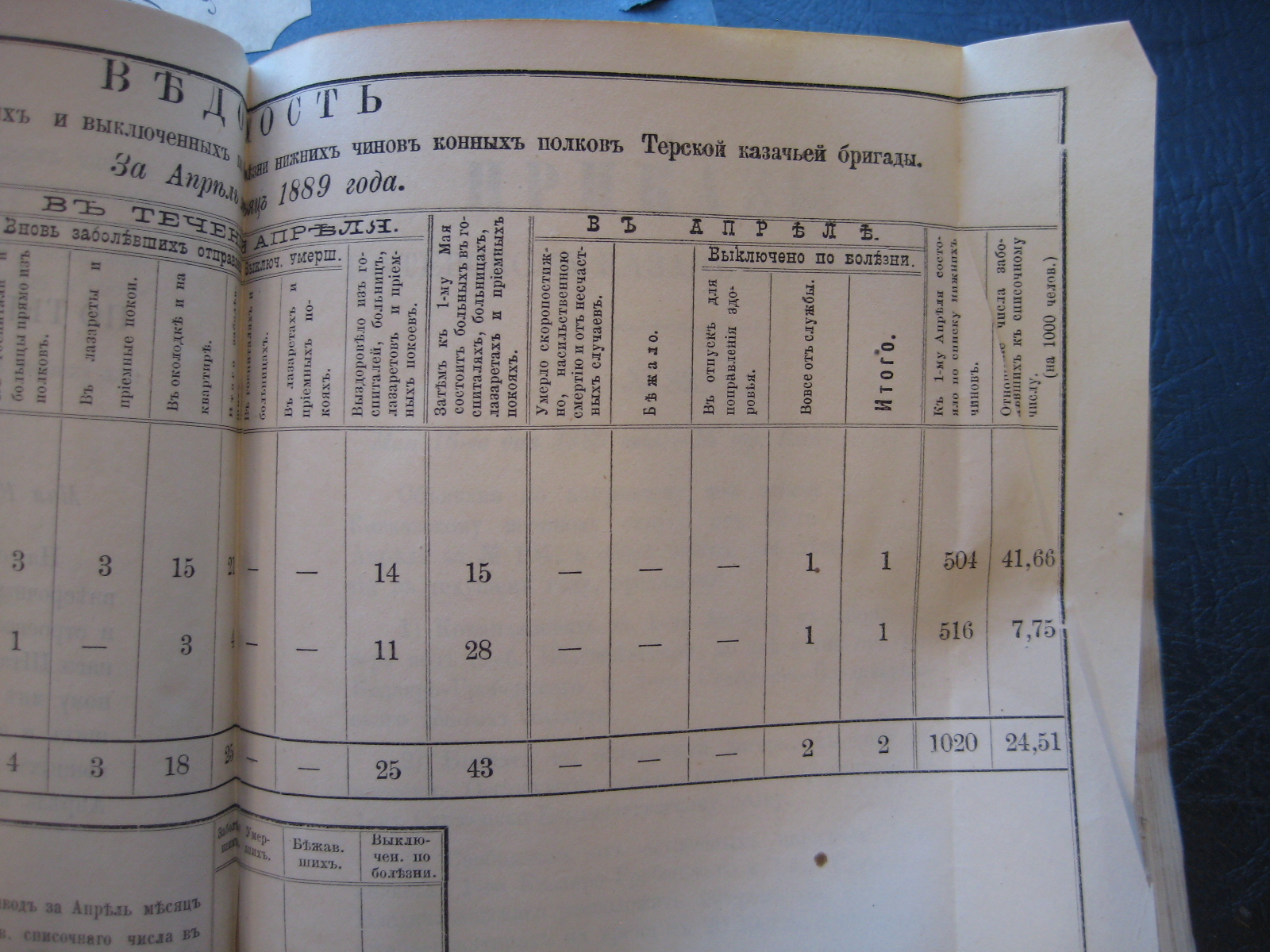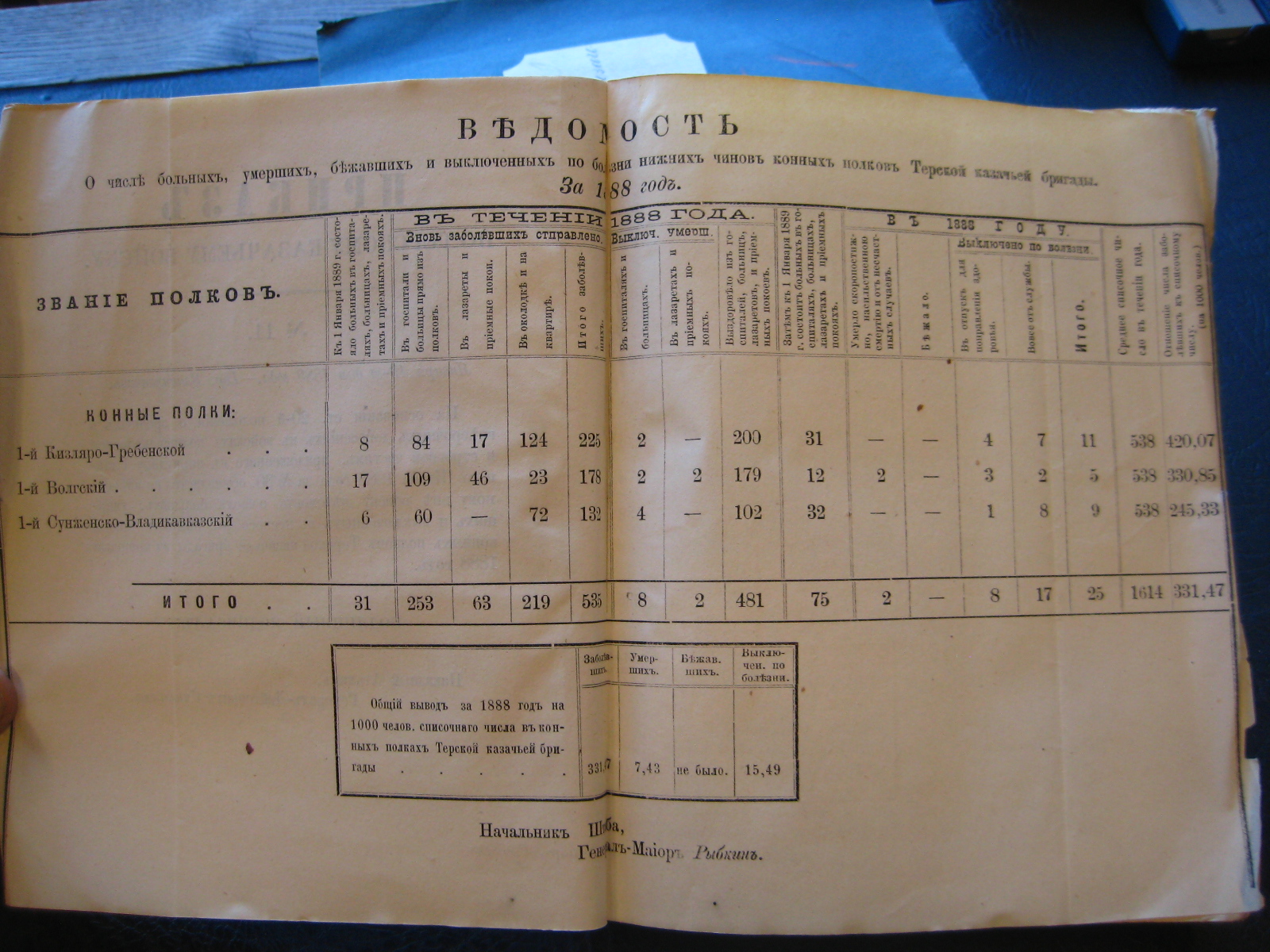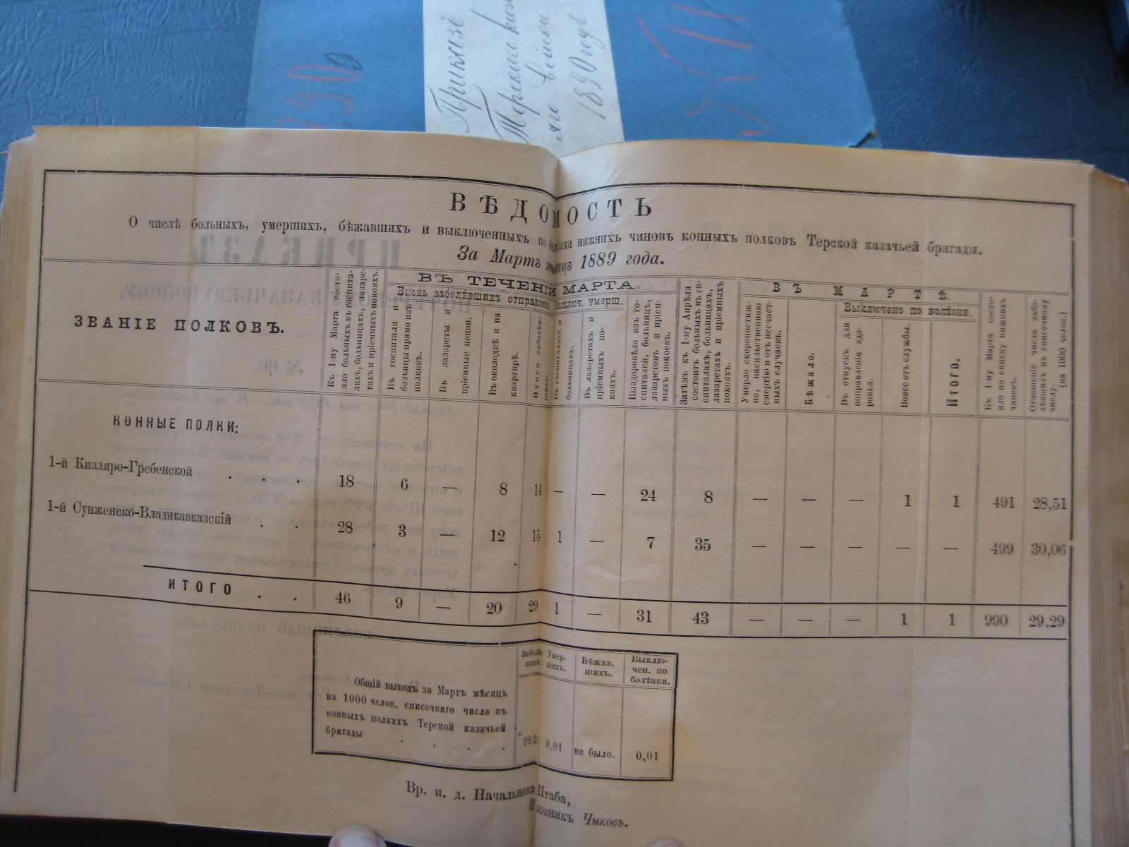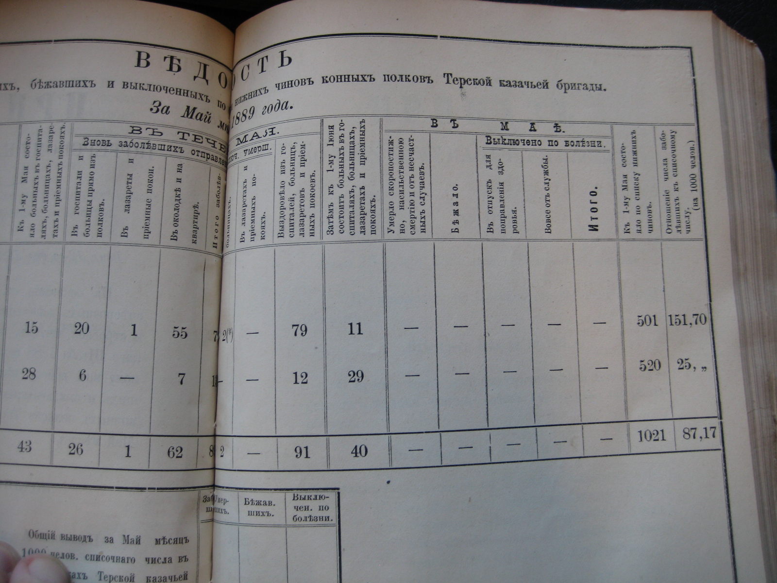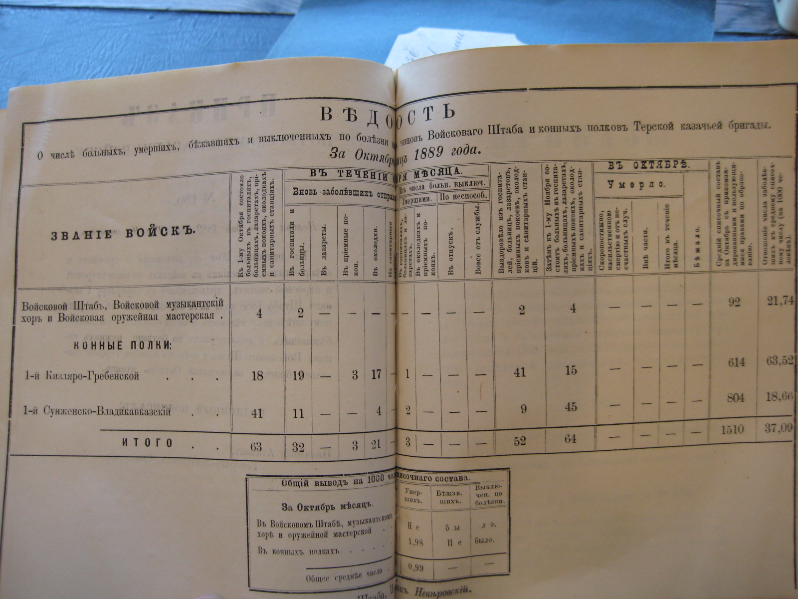 На основаніи 20-й ст. положенія о срочныхъ и внѣсрочныхъ донесеніяхъ въ войскахъ по инспекторской и строевой частямъ, приложеннаго къ циркуляру Главнаго Штаба 1888 года за No 30, объявляю по ввѣренному мнѣ войску вѣдомость о числѣ больныхъ, умершихъ, бѣжавшихъ и выключенныхъ по болѣзни нижнихъ чиновъ Войсковаго Штаба и конныхъ полковъ Терской казачьей бригады за прошлый Октябрь мѣсяцъ.