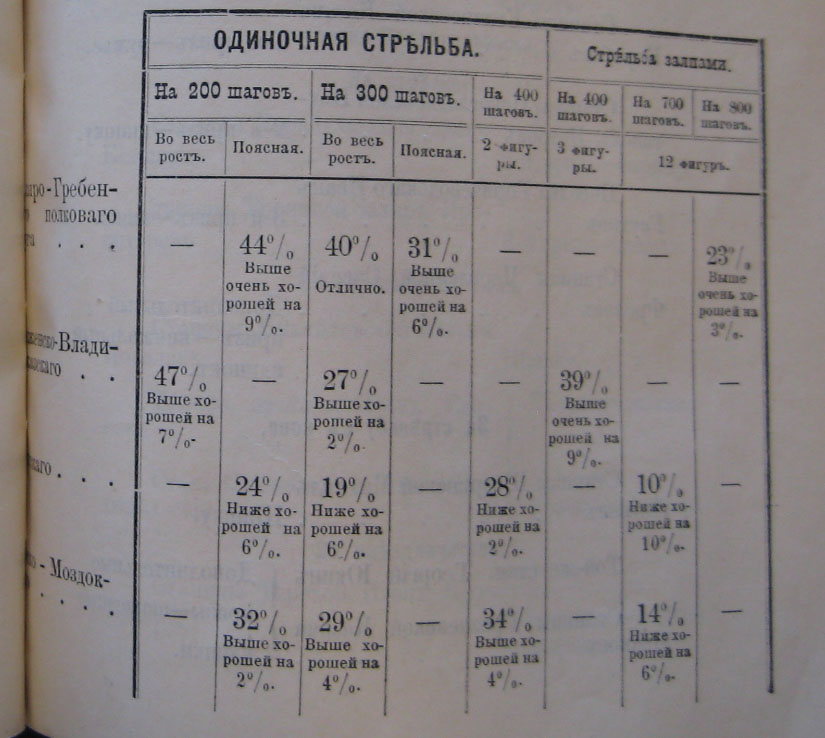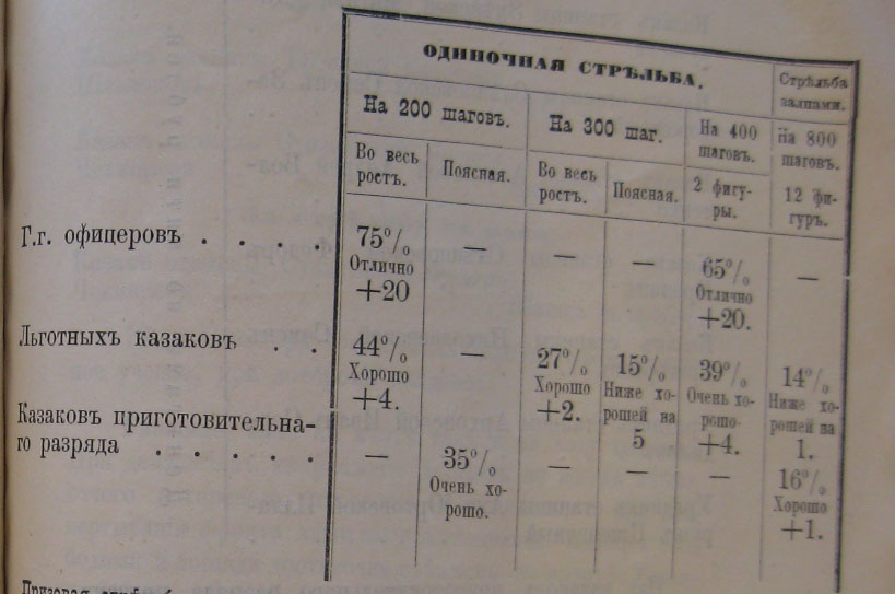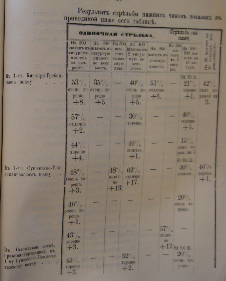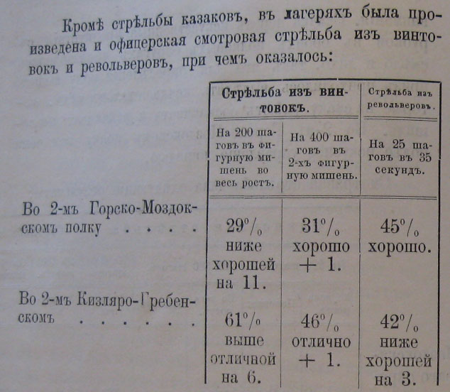 Неудовлетворительный результатъ стрѣльбы въ Горско-Моздокскомъ полковомъ округѣ зависѣлъ отчасти отъ влажной, слегка вѣтряной погоды, при которой производился смотръ стрѣльбы, за невозможностью назначить таковой въ предъидущій день (15-го Мая), по случаю празднованія Священнаго коронованія ихъ ИМПЕРАТОРСКИХЪ ВЕЛИЧЕСТВЪ и въ послѣдующій (17-го Мая), вслѣдствіе предстоявшаго въ этотъ день роспуска лагеря. Не могла, впрочемъ, не имѣть на это вліянія и выказавшаяся на смотру слабая стрѣльба офицеровъ, изъ которыхъ половина (Есаулъ Петровъ, Подьесаулы: Щербаковъ, Фидаровъ и Разсказовъ, Сотники: Иванковъ и Андреевъ) из 4-хъ выпущенныхъ пуль не попали въ мишень ни одной.