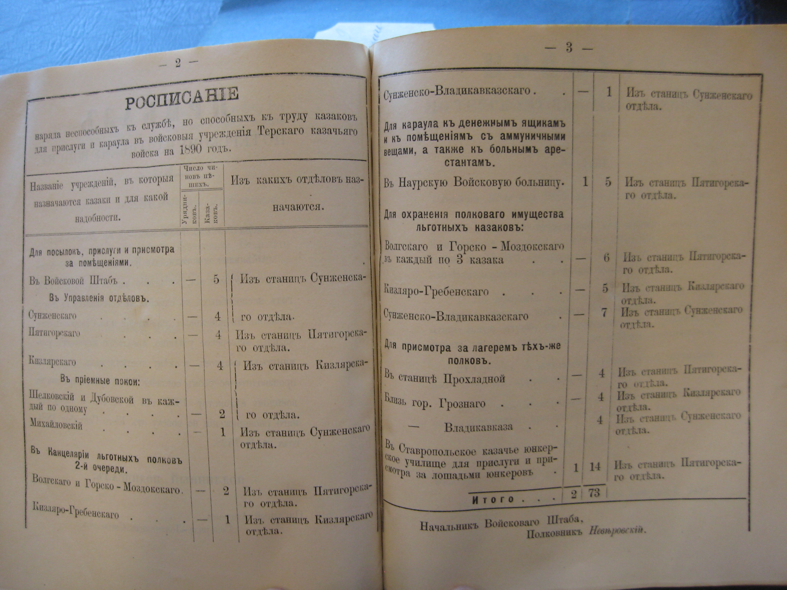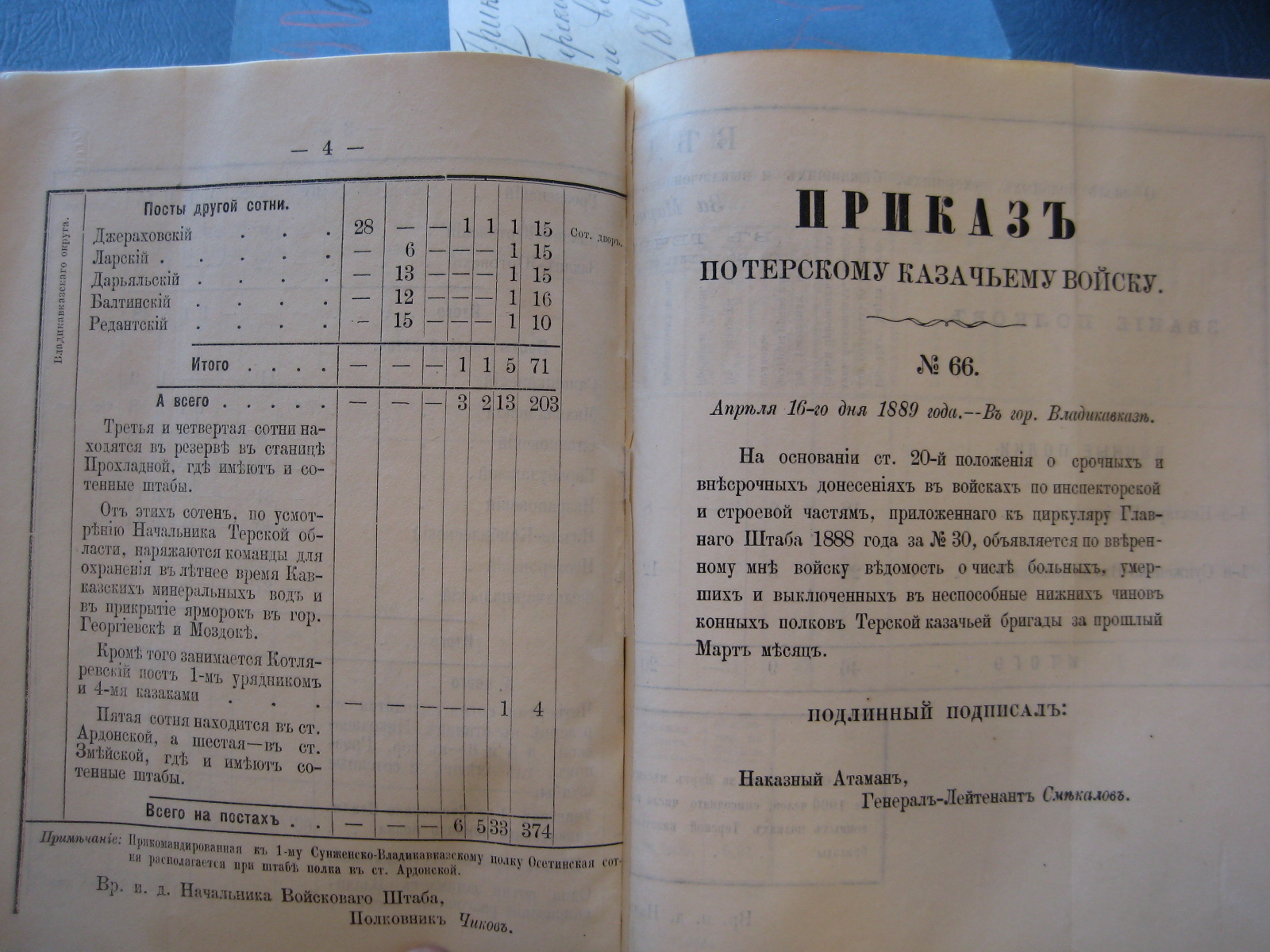 При производствѣ Старшимъ Помощникомъ моимъ Генералъ-Маіоромъ Шепелевымъ въ Маѣ мѣсяцѣ текущаго года повѣрки результатовъ обученія льготныхъ казаковъ и казаковъ приготовительнаго разряда Горско-Моздокскаго и Кизляро-Гребенскаго полковыхъ округовъ въ лагеряхъ у станицы Прохладной и подъ гор. Грознымъ оказалось: