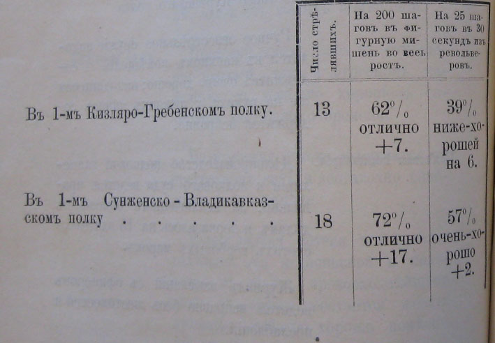 Въ Кизляро-Гребенскомъ полковомъ округѣ, напротивъ, стрѣльба производилась при ясной, тихой погодѣ; при томъ-же и стрѣльба офицеровъ оказалась гораздо лучшею въ сравненіи со 2-мъ Горско-Моздокскимъ полкомъ, такъ какъ только одинъ изъ нихъ (Хорунжій Булдачевскій) далъ всѣ промахи.
