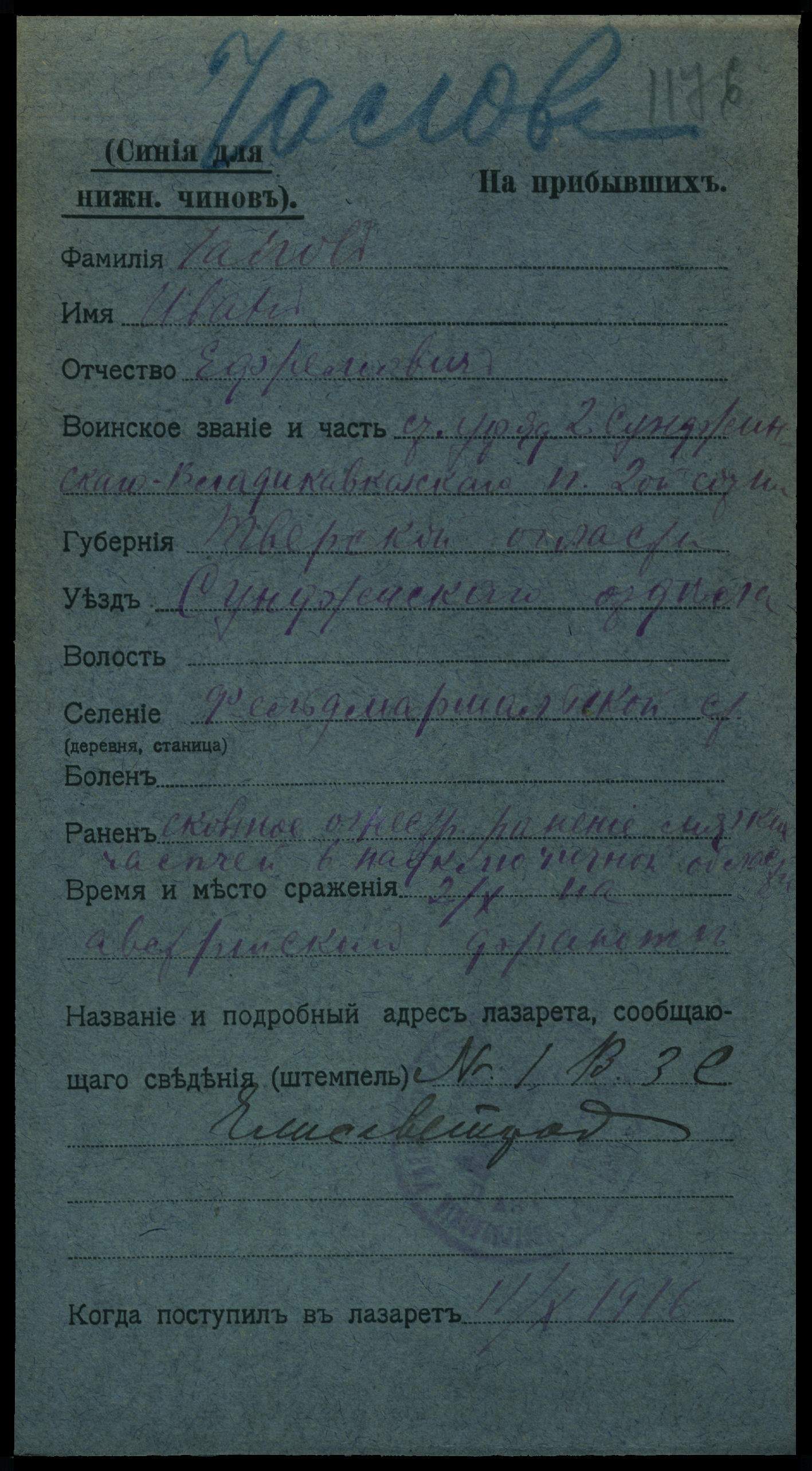 Место рождения Тверская губ., Сунженский отдел, ст. Фельдмаршальская