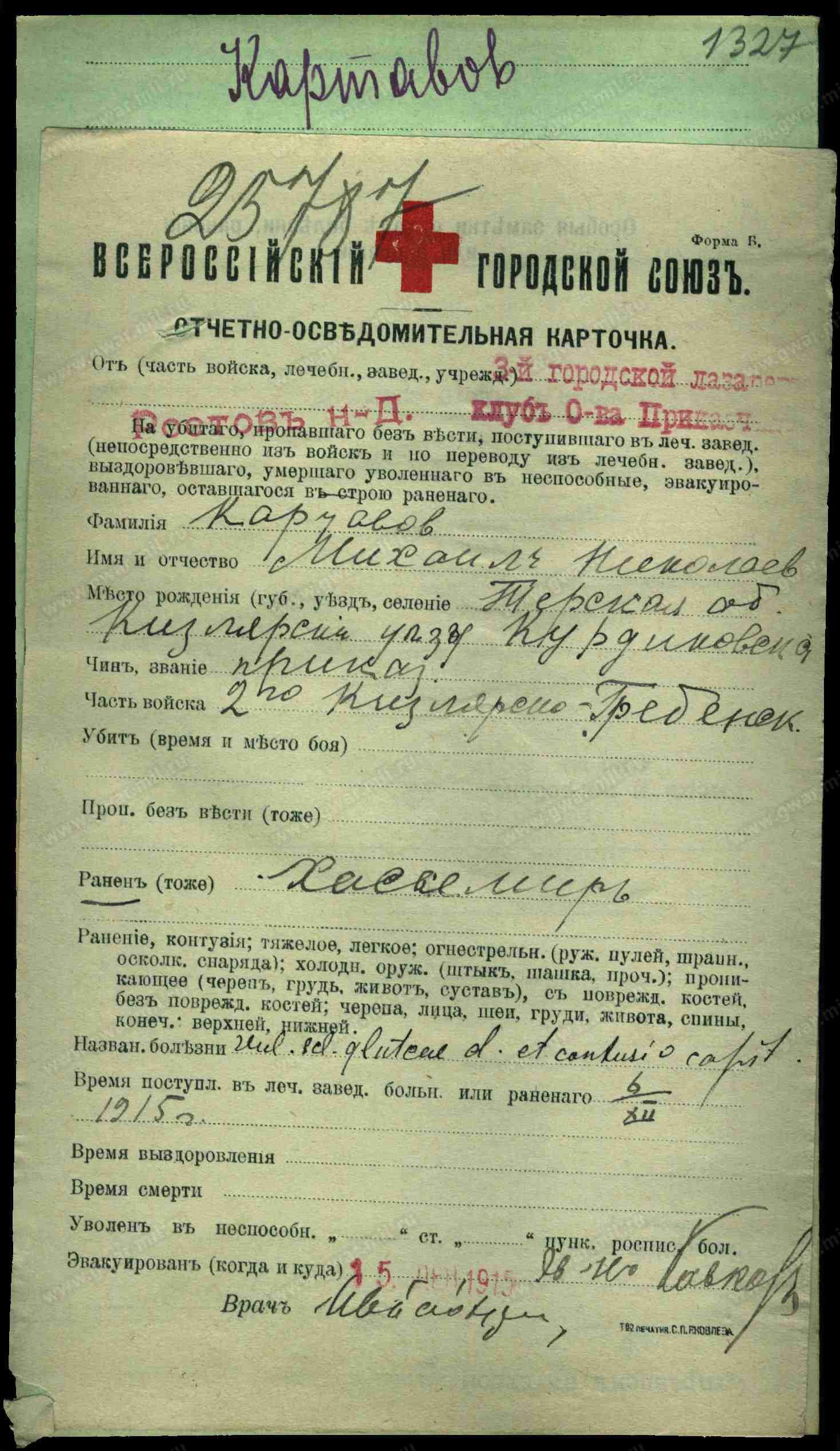 Место рождения Терская обл., Кизлярский отдел