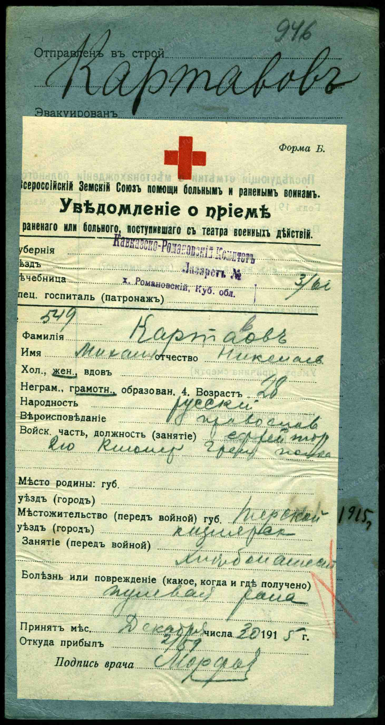 Тип документа Уведомление о приеме раненого