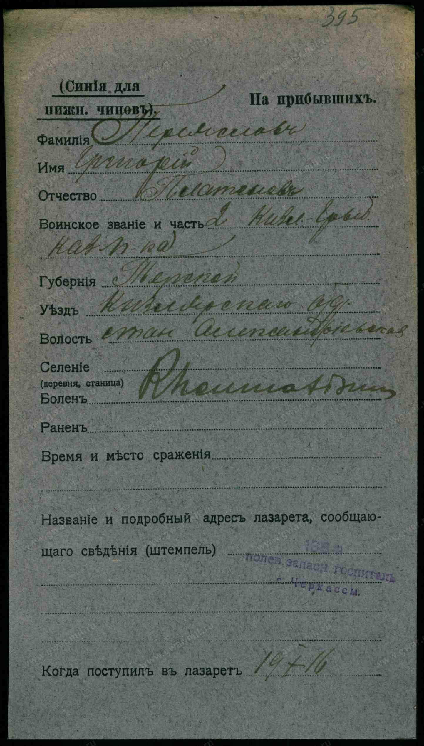 Тип документа Карточка на прибывших (нижние чины)