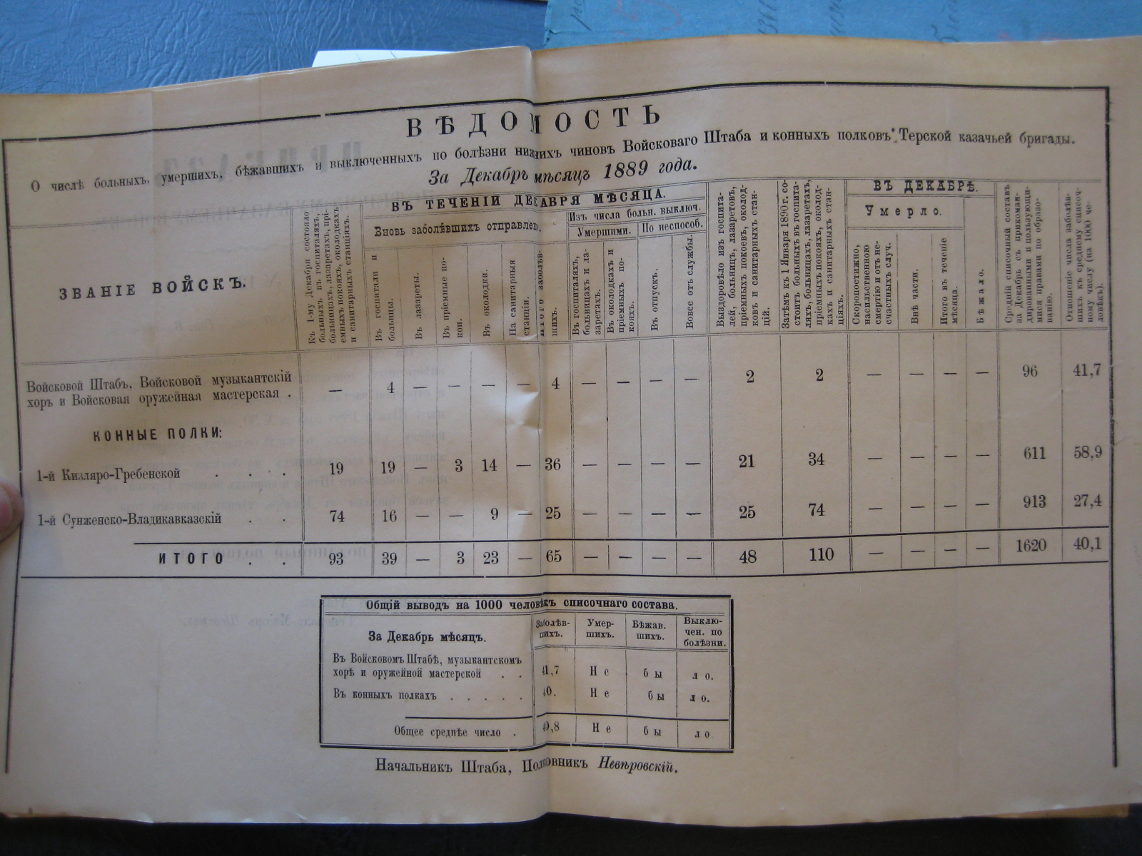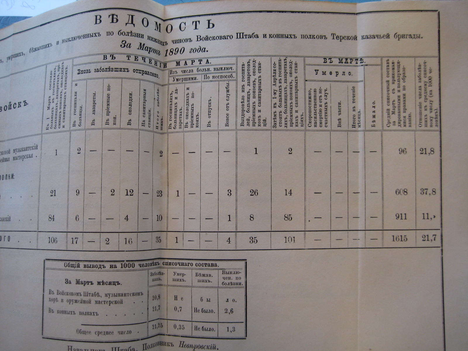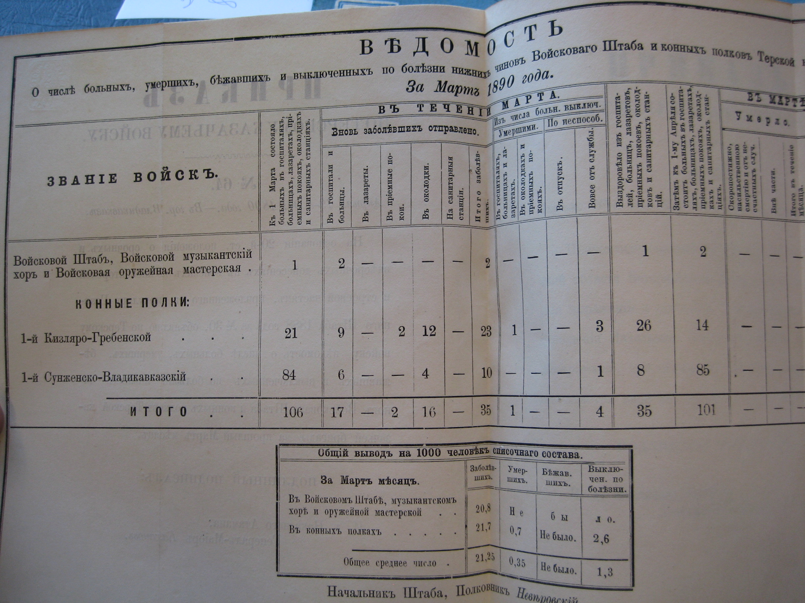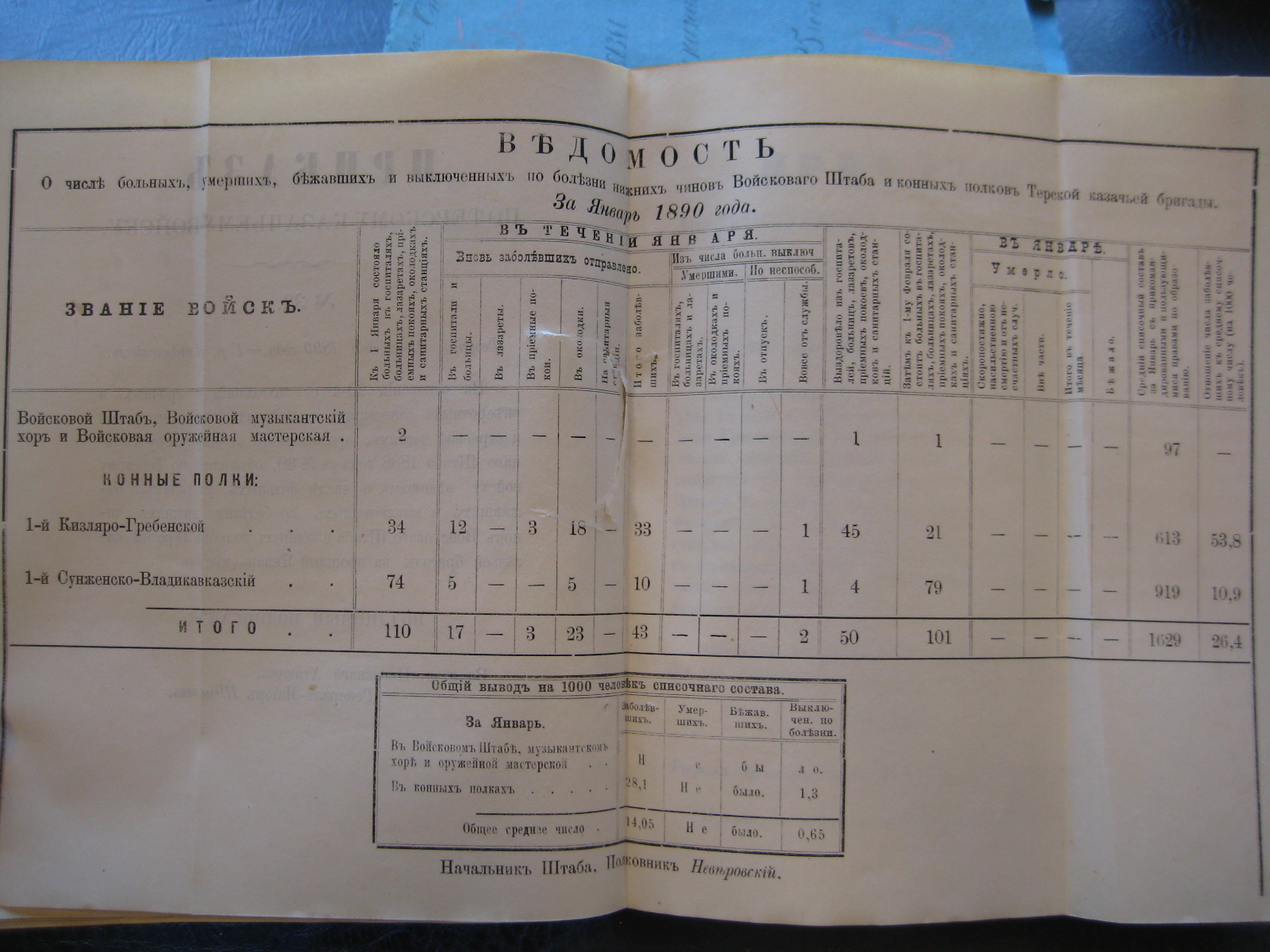 На основаніи 20-й ст. положенія о срочныхъ и внѣсрочныхъ донесеніяхъ въ войскахъ по инспекторской и строевой частямъ, приложеннаго къ циркуляру Главнаго Штаба 1888 года за No 30, объявляю по Терскому войску вѣдомость о числѣ больныхъ, умершихъ, бѣжавшихъ и выключенныхъ по болѣзни нижнихъ чиновъ Войсковаго Штаба и конныхъ полковъ Терской казачьей бригады за прошлый Январь мѣсяцъ.