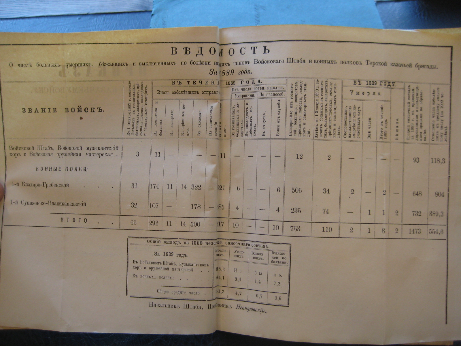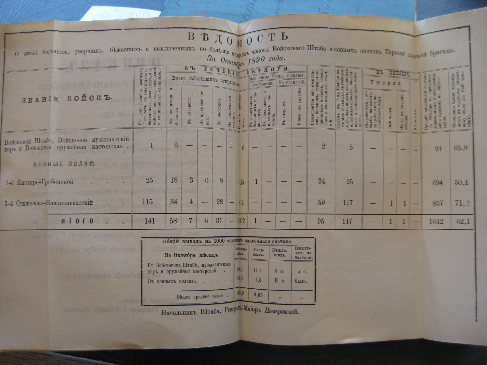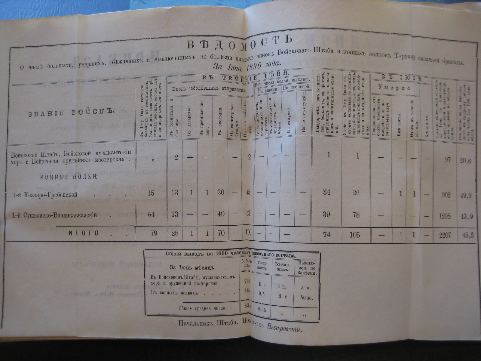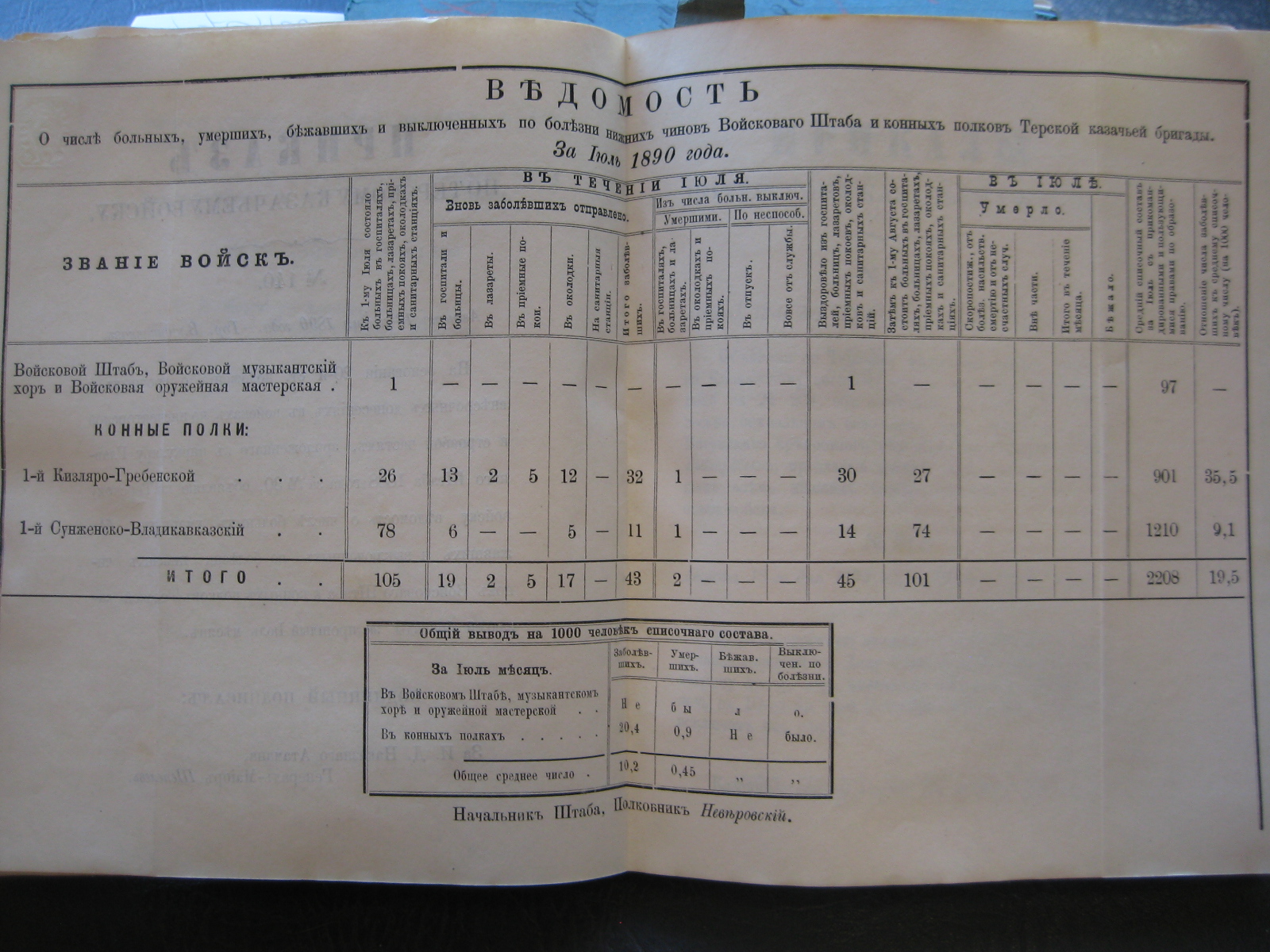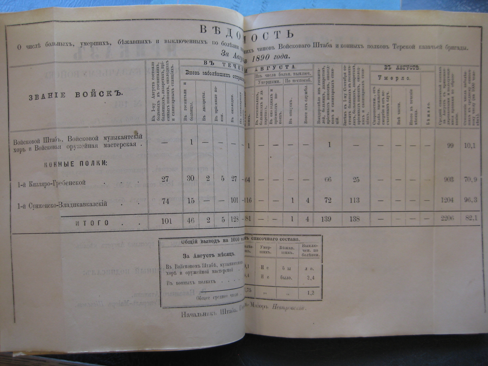 На основаніи 20-й ст. положенія о срочныхъ и внѣсрочныхъ донесеніяхъ въ войскахъ по инспекторской и строевой частямъ, приложеннаго къ циркуляру Главнаго Штаба 1888 года за No 30, объявляю по Терскому войску вѣдомость о числѣ больныхъ, умершихъ, бѣжавшихъ и выключенныхъ по болѣзни нижнихъ чиновъ Войсковаго Штаба и конныхъ полковъ Терской казачьей бригады за прошлый Январь мѣсяцъ.
