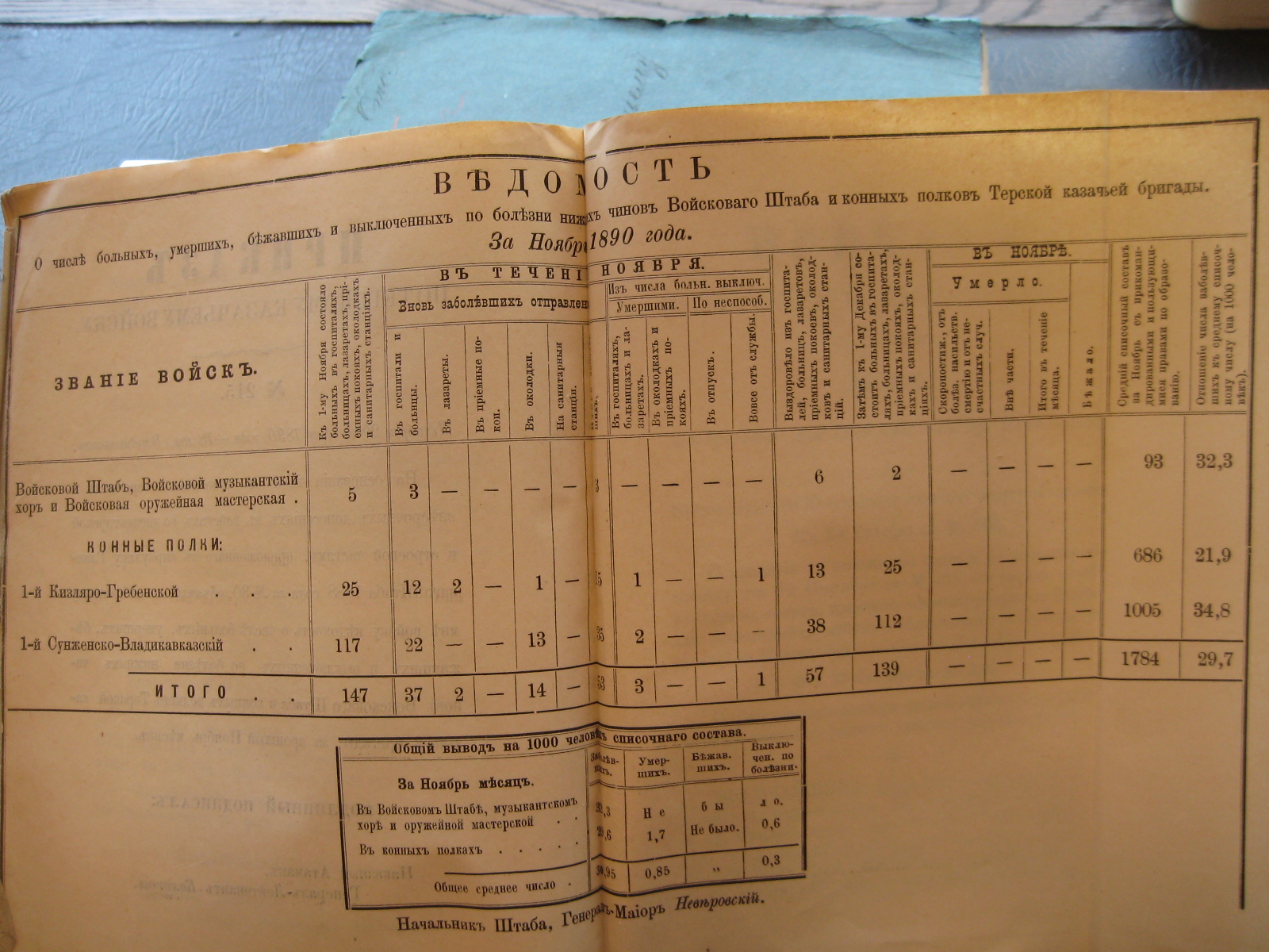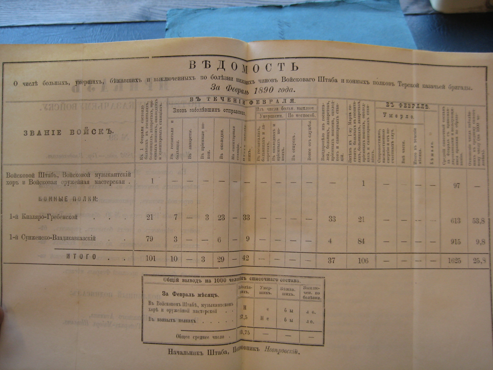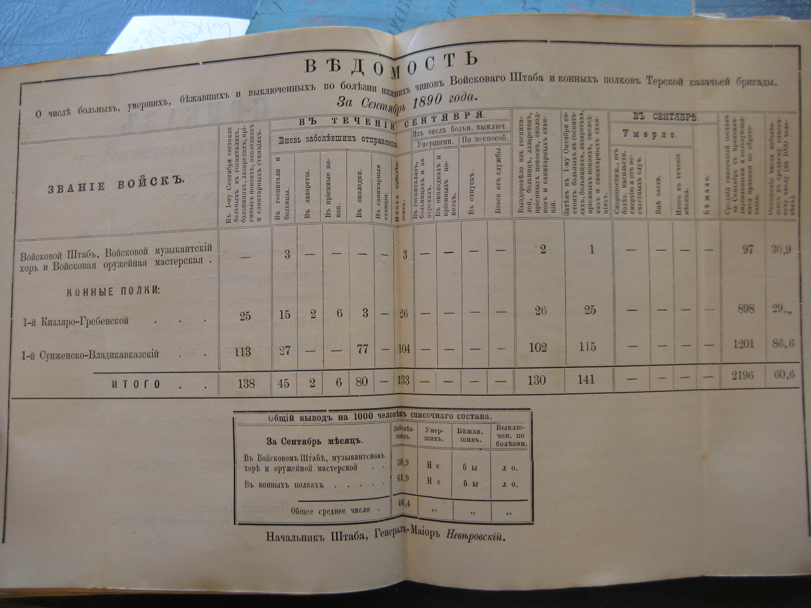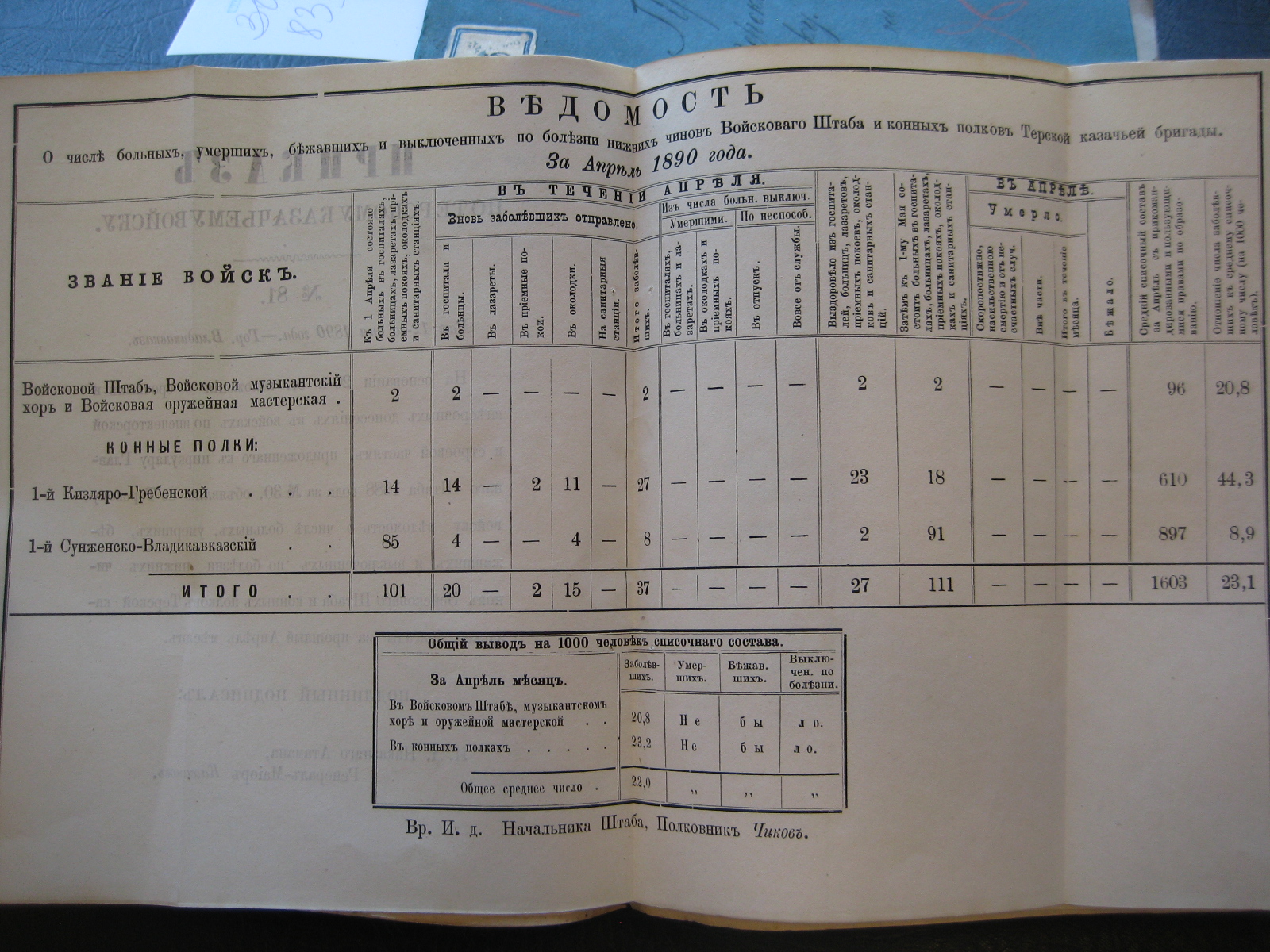 На основаніи 20-й ст. положенія о срочныхъ и внѣсрочныхъ донесеніяхъ въ войскахъ по инспекторской и строевой частямъ, приложеннаго къ циркуляру Главнаго Штаба 1888 года за No 30, объявляю по Терскому войску вѣдомость о числѣ больныхъ, умершихъ, бѣжавшихъ и выключенныхъ по болѣзни нижнихъ чиновъ Войсковаго Штаба и конныхъ полковъ Терской казачьей бригады за прошлый Январь мѣсяцъ.