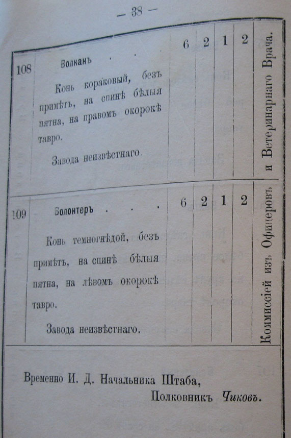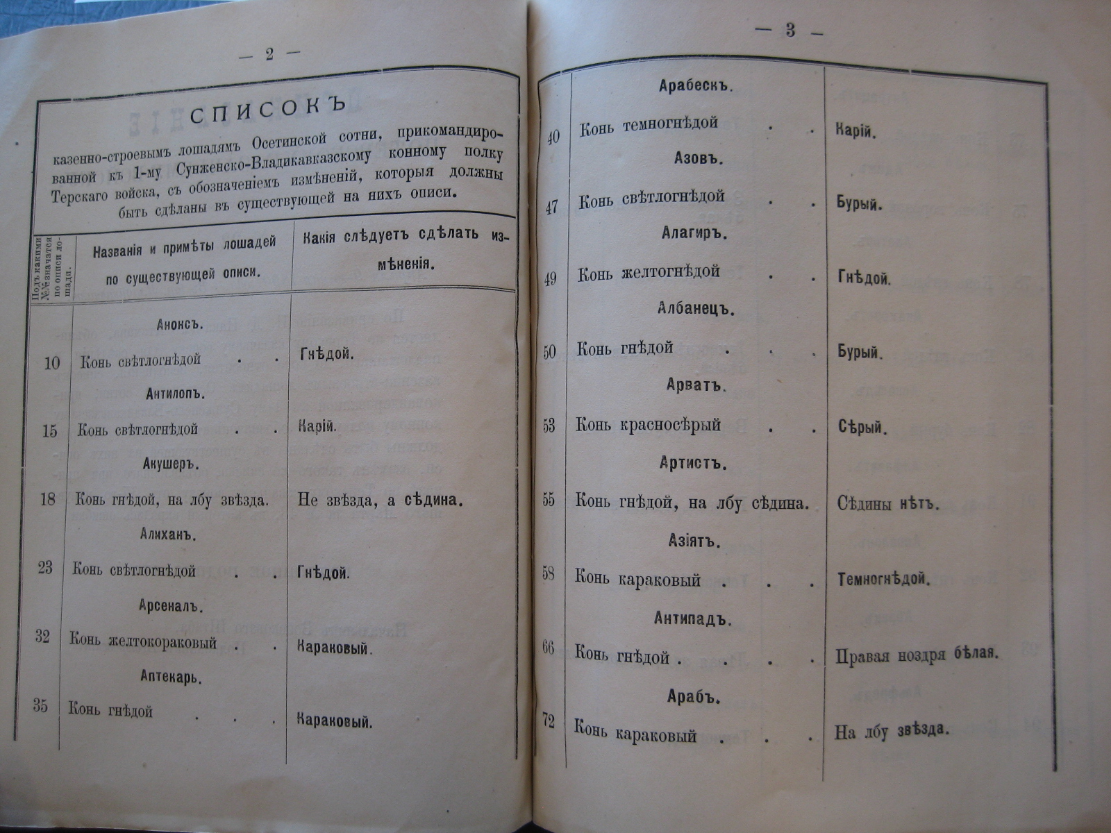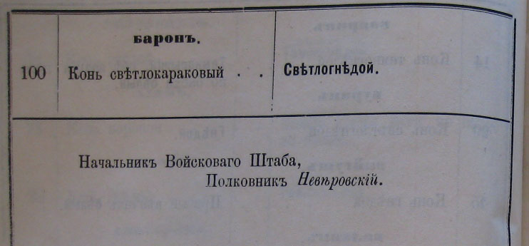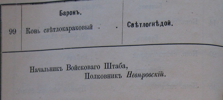 Объявляя объ этомъ по Терскому казачьему войску, предлагаю Командиру 1-го Сунженско-Владикавказского коннаго полка исключить упомянутую лошадь изъ списочного состояния и довольствия с 15-го Iюля прошлого года.