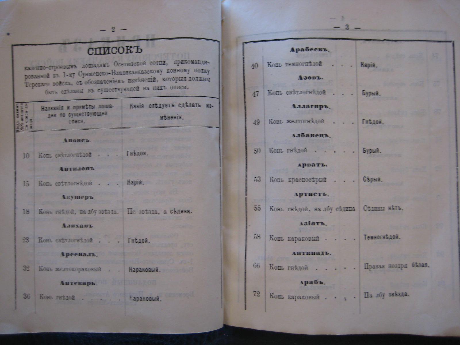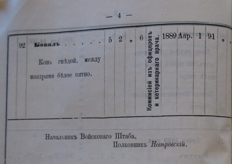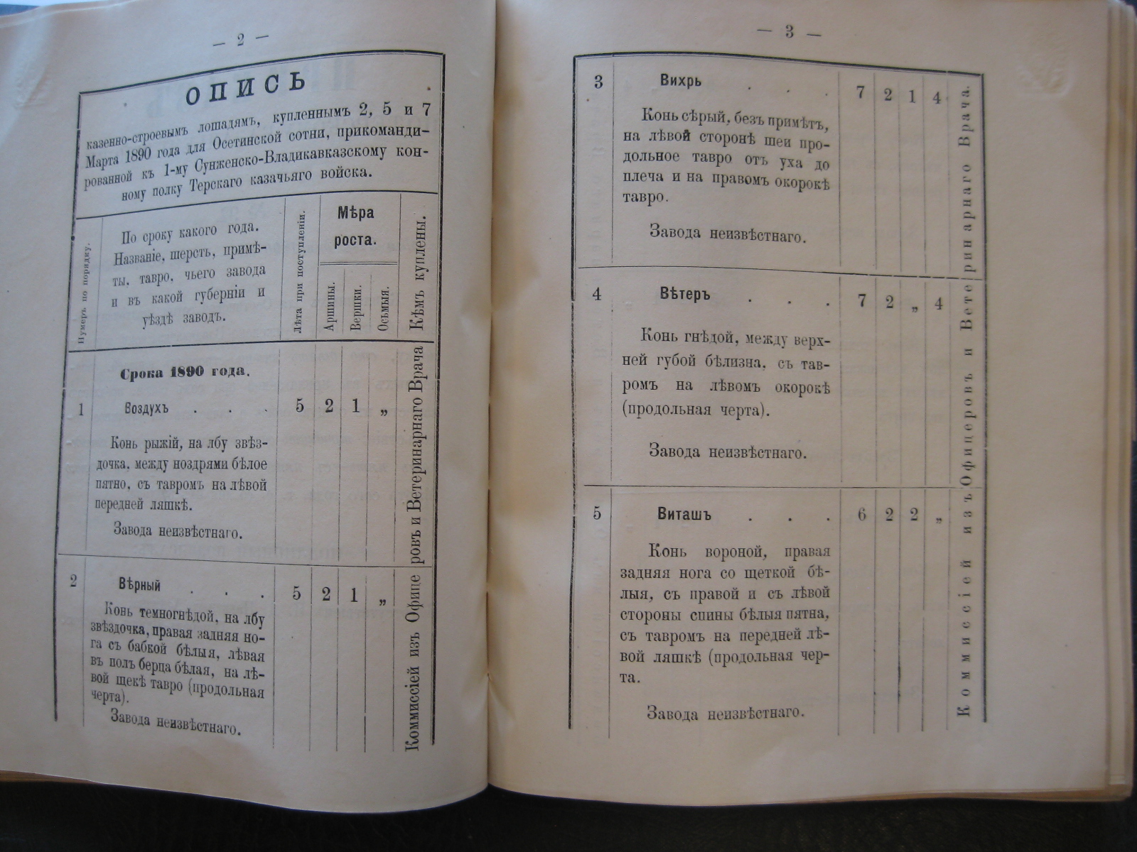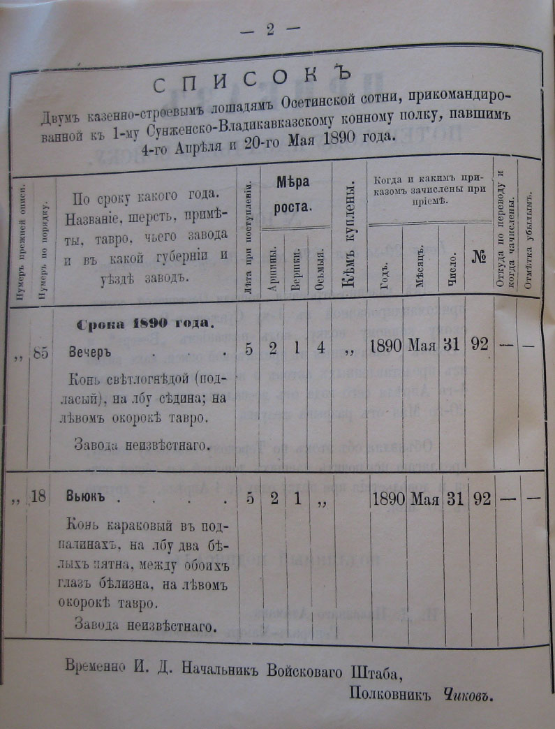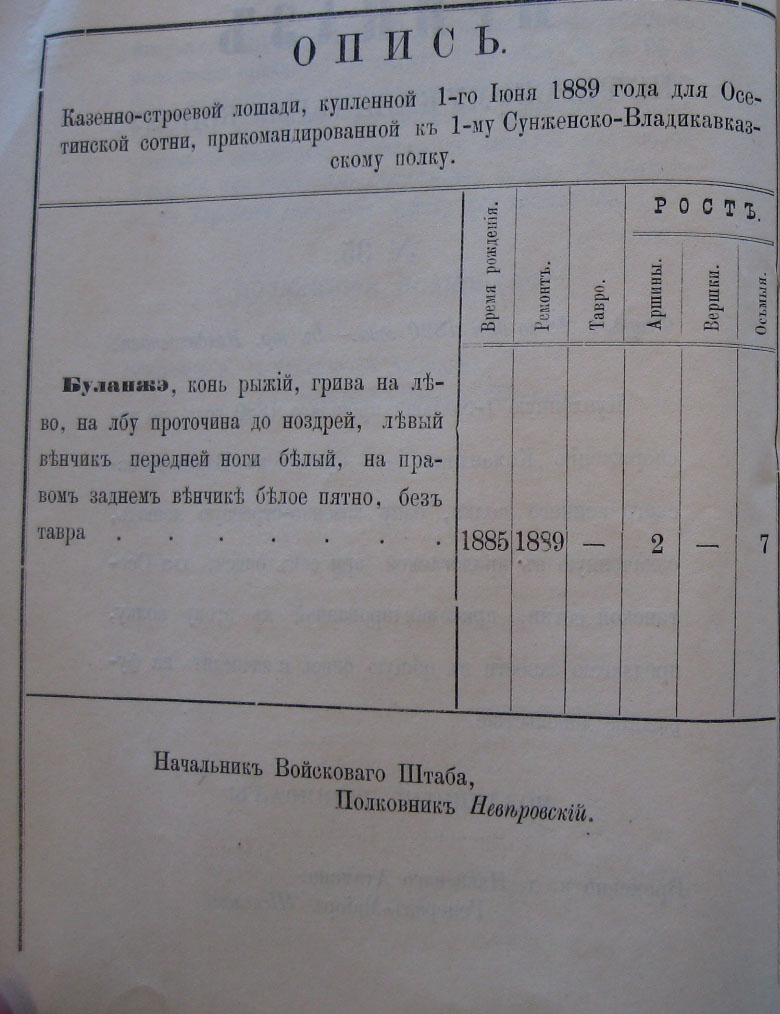 Купленную 1-го Іюня прошлаго 1889 года, по распоряженію Командира 1-го Сунженско-Владикавказскаго коннаго полка, одну казенно-строевую лошадь, означенную въ прилагаемой при семъ описи, для Осетинской сотни, прикомандированной къ этому полку, предлагаю занести въ общую опись и зачислить на фуражное довольствіе.