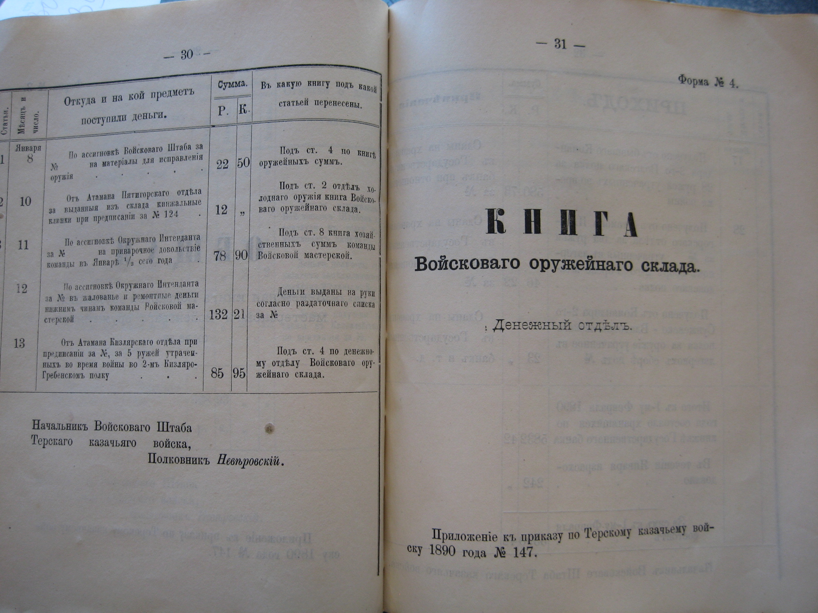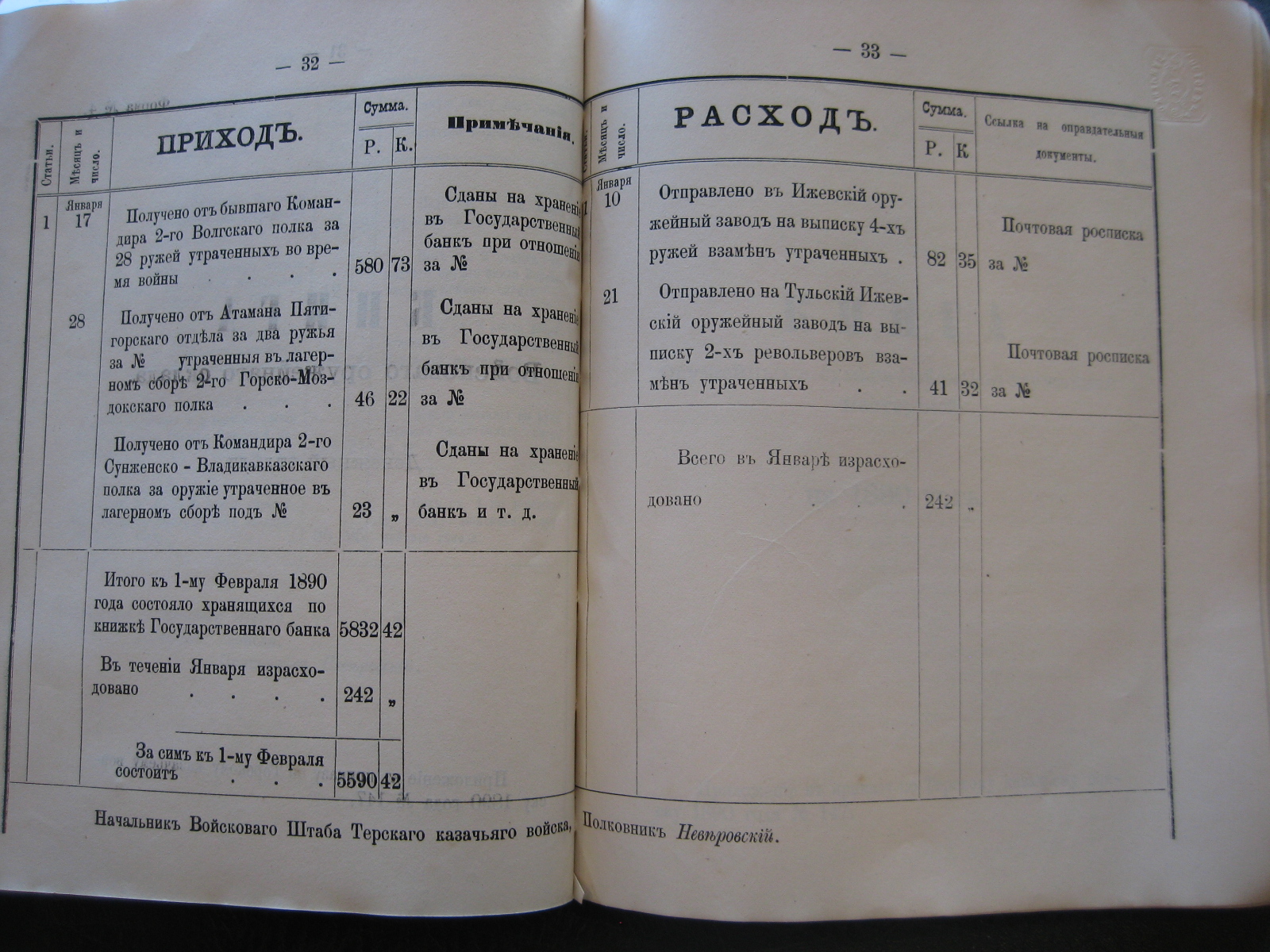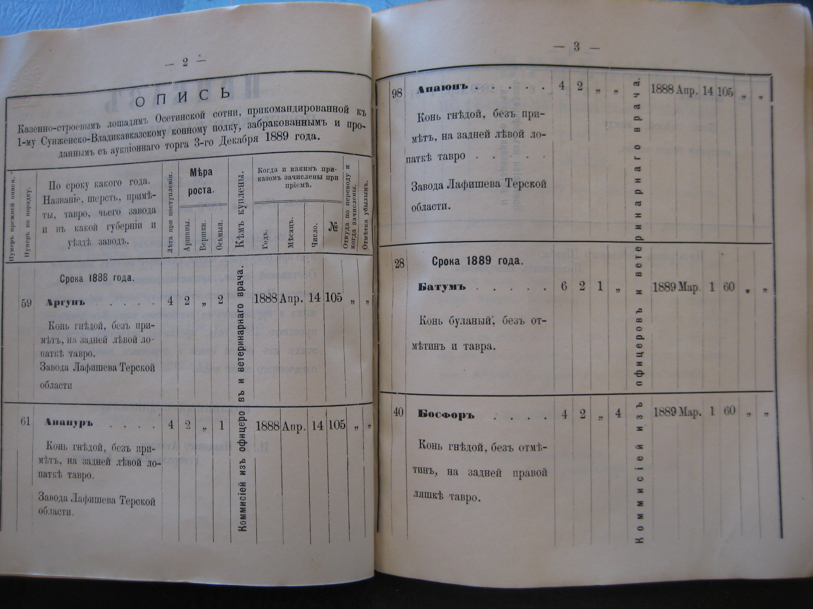 Купленную 1-го Іюня прошлаго 1889 года, по распоряженію Командира 1-го Сунженско-Владикавказскаго коннаго полка, одну казенно-строевую лошадь, означенную въ прилагаемой при семъ описи, для Осетинской сотни, прикомандированной къ этому полку, предлагаю занести въ общую опись и зачислить на фуражное довольствіе.