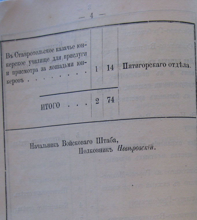 Командиръ Собственнаго ЕГО ИМПЕРАТОРСКАГО ВЕЛИЧЕСТВА изволилъ увѣдомить, что съ разрѣшения Командующаго ИМПЕРАТОРСКОЮ Главною Квартирою Корнетъ Л.-Гв. 1-го Терскаго казачьего эскадрона (фамилия неразборчиво отсканирована) 3-го сего Яеваря увленъ на льготу на Кавказъ, съ переводом Л.-Гв. во 2-й (льготный) Терский казачий эскадронъ.