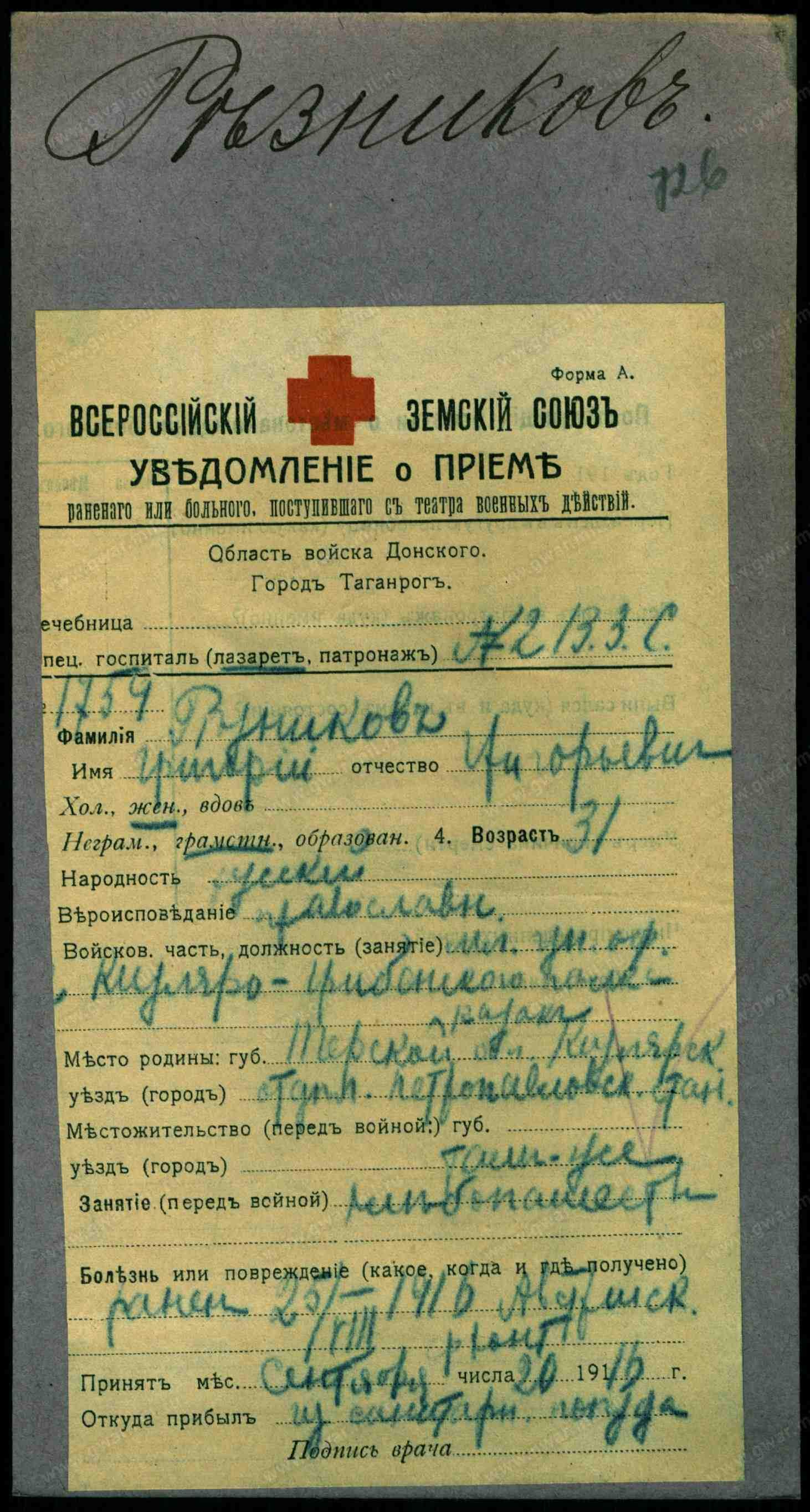 1. Резников Григорий Ефимов, хозяин, 38 лет, казак, родился в Терской обл., Кизлярском отд., ст. Горячеисточненской, правосл., родной язык русский, неграмотный, основное занятие - земледелие.