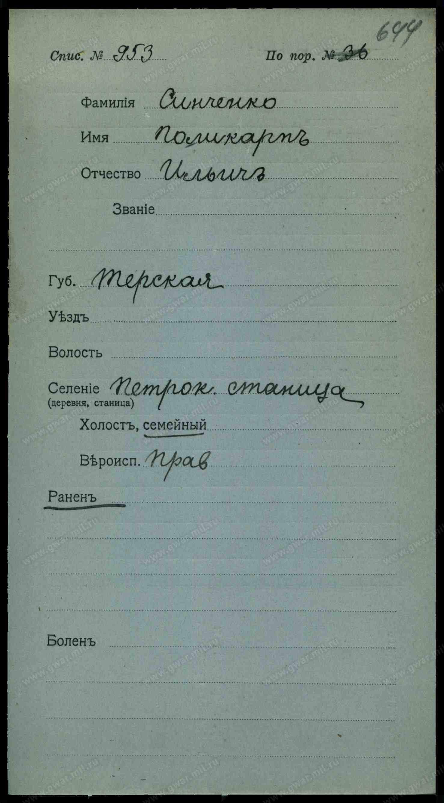 1. Зинченко Василий Васильевич, хозяин, 86, каз., родился в Воронежской губ. Валуйского уезда села Меленеева, прав., неграм., основное занятие - земледелие