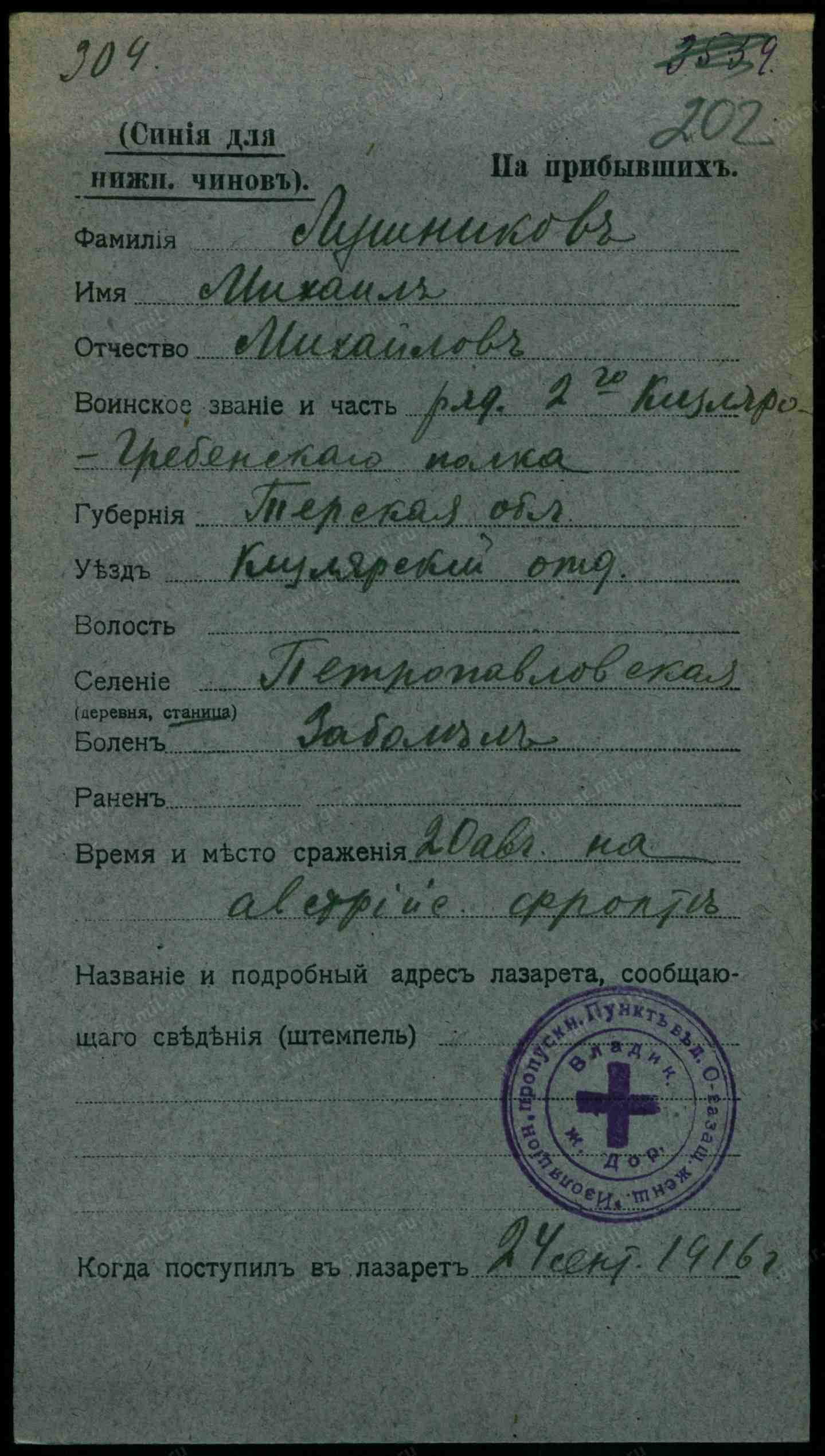 1. Лушников Михаил Никифоров, хозяин, 37 лет, казак, родился здесь, правосл., родной язык русский, неграмотный, основное занятие - земледелец, Терский льготный казак.