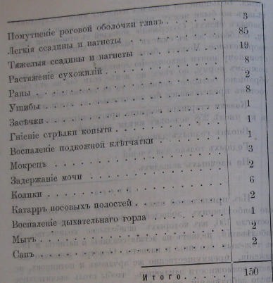 Изъ прилагаемой ниже вѣдомости видно, что все число заболѣвшихъ лощадей въ періодъ лагернаго сбора достигло 150, изъ которыхъ наибольшее количество, 85 заболѣваній, падаетъ на легкія ссадины и нагнеты и 19 - на тяжелыя ссадины и нагнеты. Осмотръ конскаго снаряженія, преимущественно же арчаковъ и потниковъ, не даеть возможности заключить, чтобы столь значительное число заболѣваній, около 104 или 69,3% происходило отъ недостатковъ предметовъ снаряженія. А потому приходится скорѣе всего, искать причину подобнаго явленія въ небрежномъ или не внимательномъ сѣдланіи лошадей. Желательно было бы, чтобы офицеры, привлеченные к этому дѣлу, обратили на это свое вниманіе и въ нѣсколько уроковъ въ началѣ лагеря преподали казакамъ основныя правила сѣдланія.