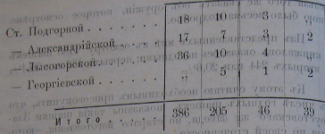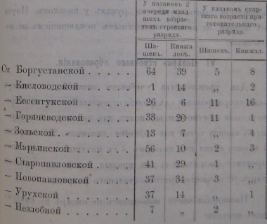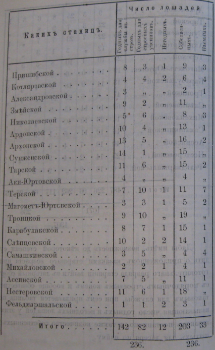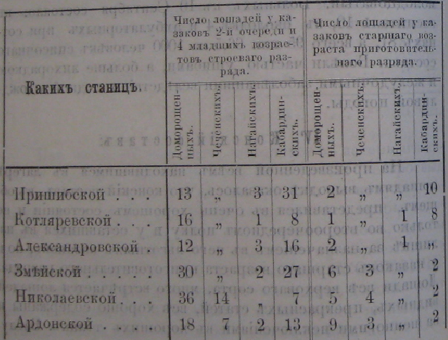 Число лошадей у казаковъ 2-й очереди и младшихъ возрастовъ строеваго разряда по станично и съ подраздѣленіемъ ихъ на породы показано въ нижеприлагаемой таблицѣ.