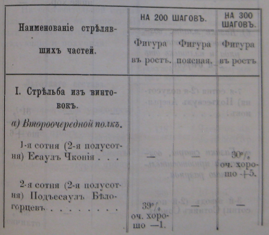 Результаты смотровой и состязательной стральбы показаны въ 2-хъ нижеслѣдующихъ таблицахъ: