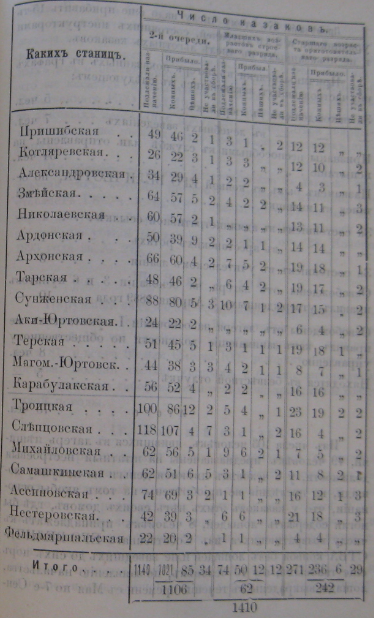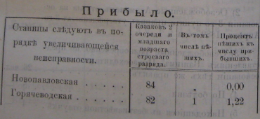 Степень не исправности станицъ по выкомандированію въ лагерь безлошадныхъ казаковъ выражена въ нижеслѣдующихъ двухъ таблицахъ. Въ первой изъ нихъ показаны, по станично, явившіеся въ лагерь пѣшими казаки 2-й очереди и младшихъ возрастовъ строеваго разряда, обязанные постоянно содержать собственныхъ, вполнѣ годныхъ для службы, лошадей, а во второй, также по станично, прибывшіе безъ лошадей казаки старшаго возраста приготовительнаго разряда.