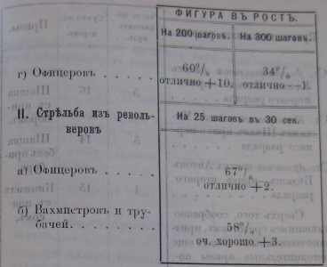 Порядокъ во время стрѣльбы былъ - хорошъ - отсутствіе шума, суеты и торопливости. Прикладка въ общемъ также хороша; замѣчено лишь нѣсколько случаевъ неправильной прикладки съ колѣна: локоть лѣвой руки не перепускался за колѣно, какъ бы слѣдовало, а упирался въ таковое: кромѣ того стволъ винтовки казака опирался не на ладонь, а поджимали 2-пальца.