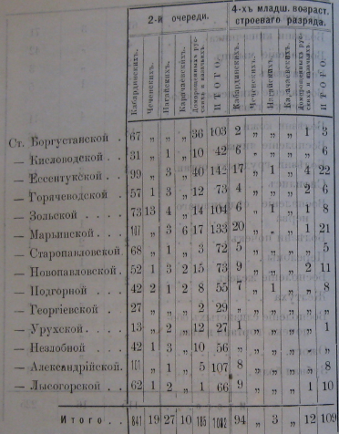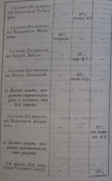 Свѣдѣнія, знаніе которыхъ обязательно для каждаго рядоваго, въ общемъ усвоены хорошо; въ станицахъ же: Ессентукской (инструктора урядники: Ватулинъ и Кулаковъ), Кисловодской (уряд. Симоновъ), Боргустанской (уряд. Корицкій), Горячеводской (ур. Красновъ) и Зольской (ур. Романовъ) - очень хорошо.