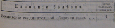 Изъ нижеслѣдующей таблицы видно общее число заболѣвшихъ въ теченіи всего лагернаго сбора, пользовавшихся въ околодкѣ, отправленныхъ въ госпиталь и лечившихся амбулаторно. Первыхъ было 115 человѣкъ или 7,6%, вторыхъ 16 чел. или 1,0%, и третьихъ 225 человѣкъ или 15,1%. Изъ этого числа наибольшее количество, именно 135 заболѣваній, вызвано было лихорадками и 64 - болѣзнями кожи.